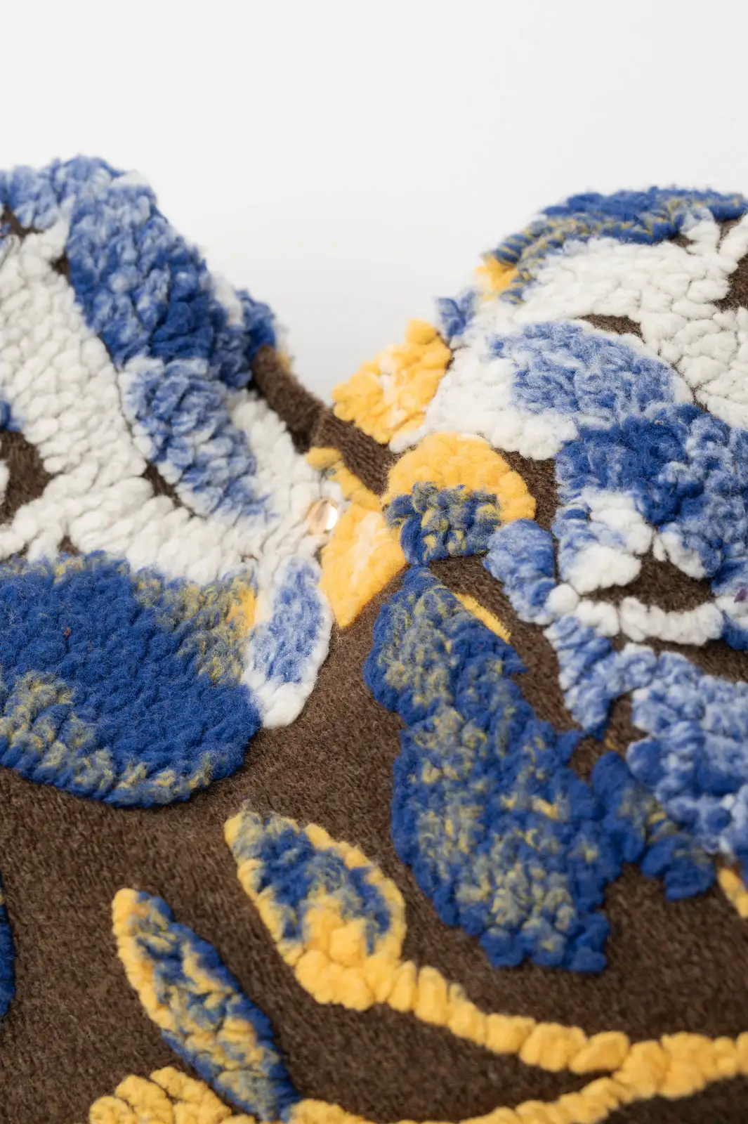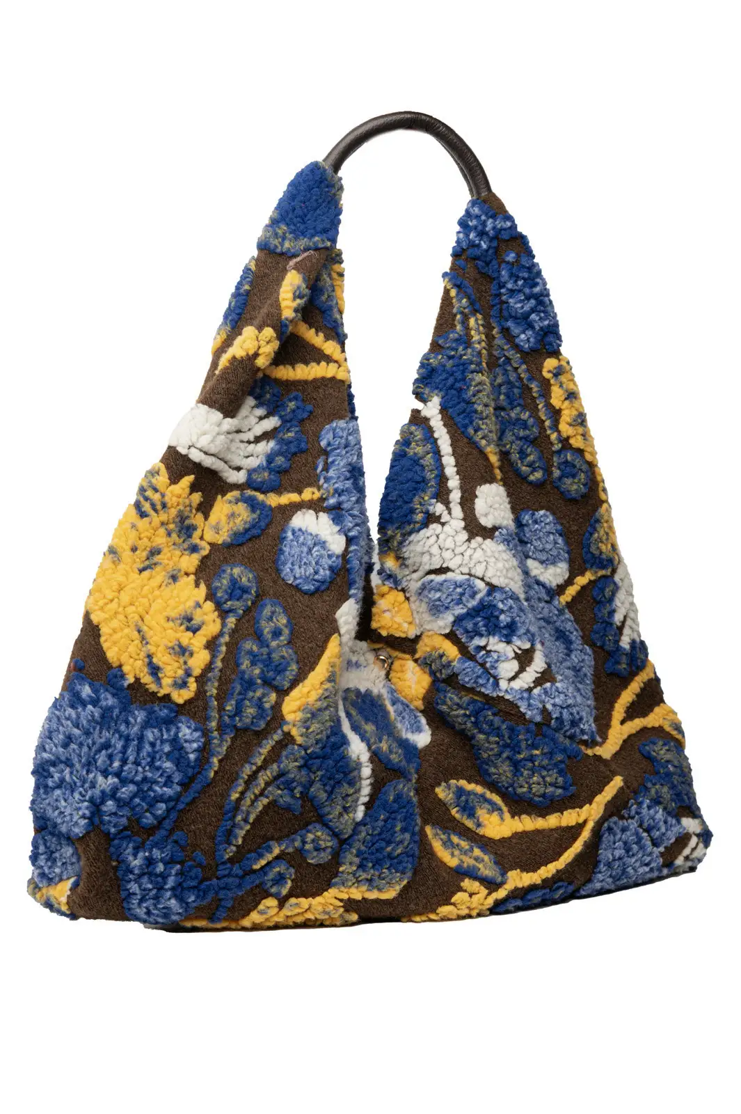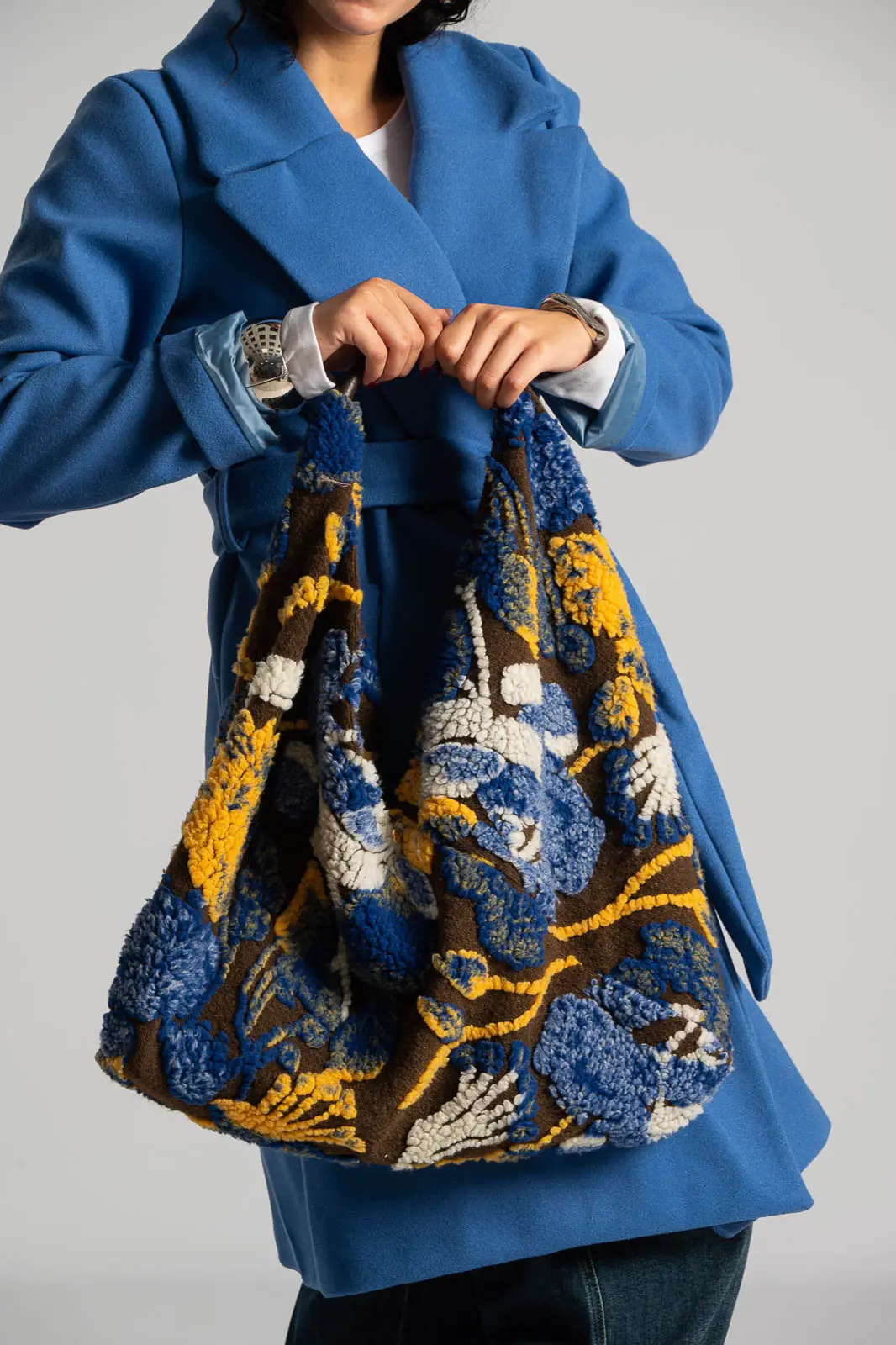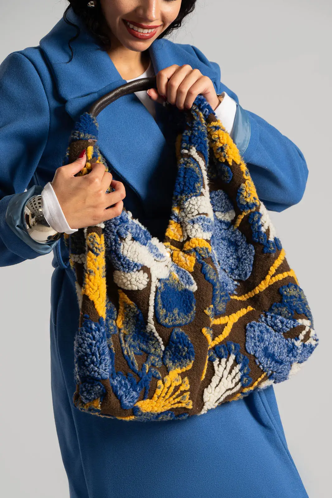 Shoulder bag. It has a leatherette handle. It closes with a clutch. Inside, it has a single compartment. The entire surface has 3D embossed flowers. Floral pattern across the entire surface. The handle is fixed and 60 cm long. Bag size: 58 cm x 28 cm. Composition: 45% polyester, 35% acrylic, 20% wool.