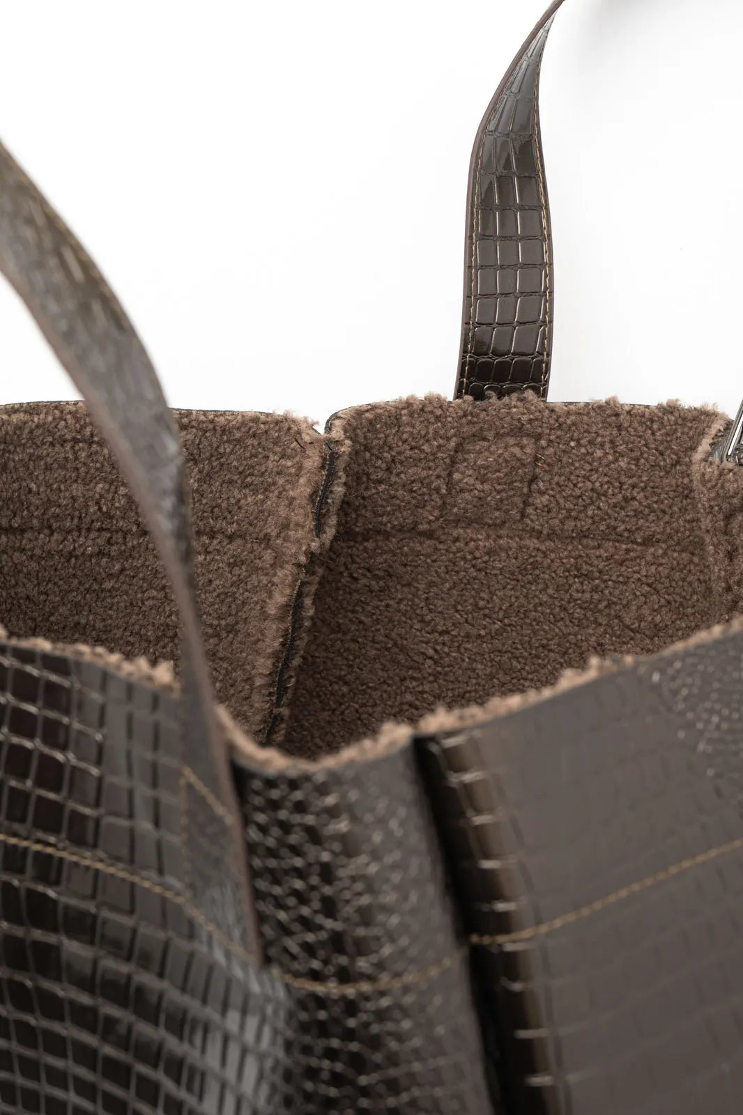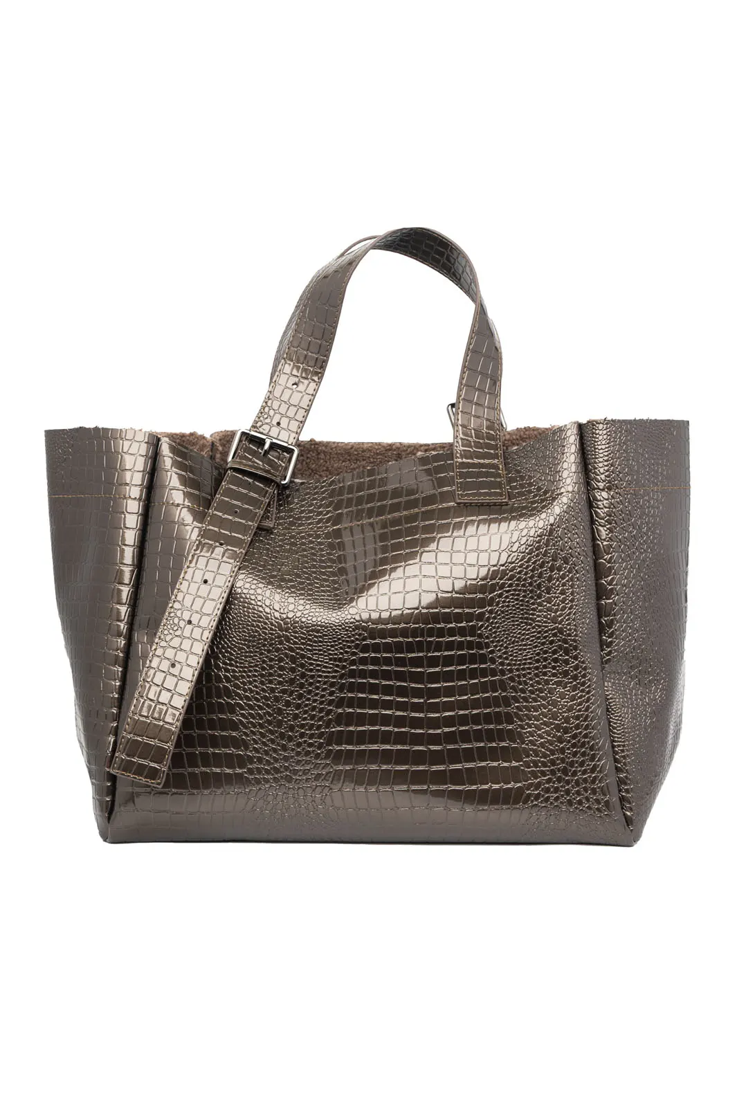 Shoulder bag. It has a teddy lining and a large single compartment. The handles are adjustable from a minimum of 34 cm to a maximum of 59 cm. The entire surface has an embossed texture. It has a smaller bag in the same color and texture. It closes with a zipper and is lined inside. The bag measures 34cmx30cmx23cm and the smaller one measures 33cmx21cmx7cm.