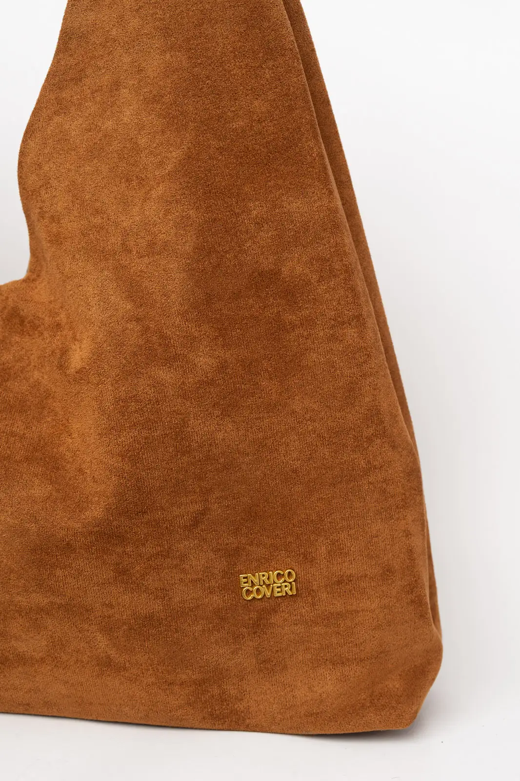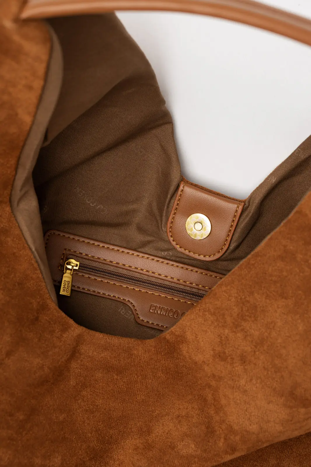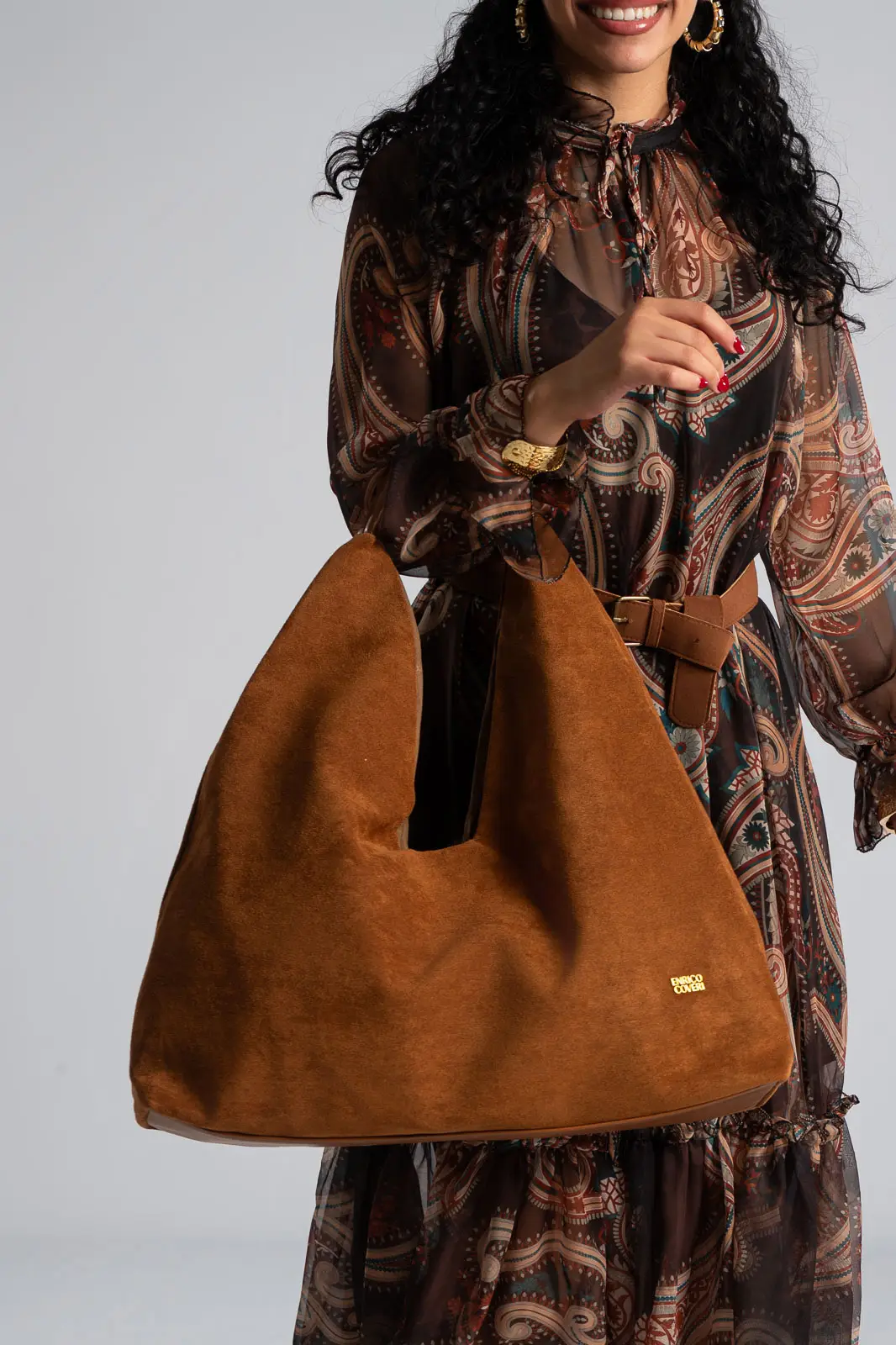 Shoulder bag. It has a leatherette handle. It closes with a clutch. Inside, it is lined with a single compartment and extra pockets. The entire surface has a soft texture and is suede. There is a hidden pocket on the back that closes with a zipper. The handle is fixed and is 60cm long. Bag size: 53 cm x 50 cm x 9 cm.