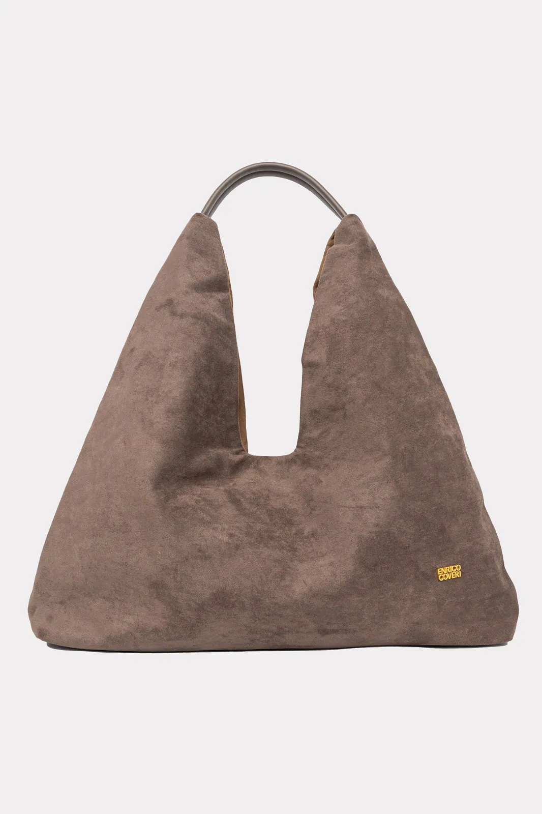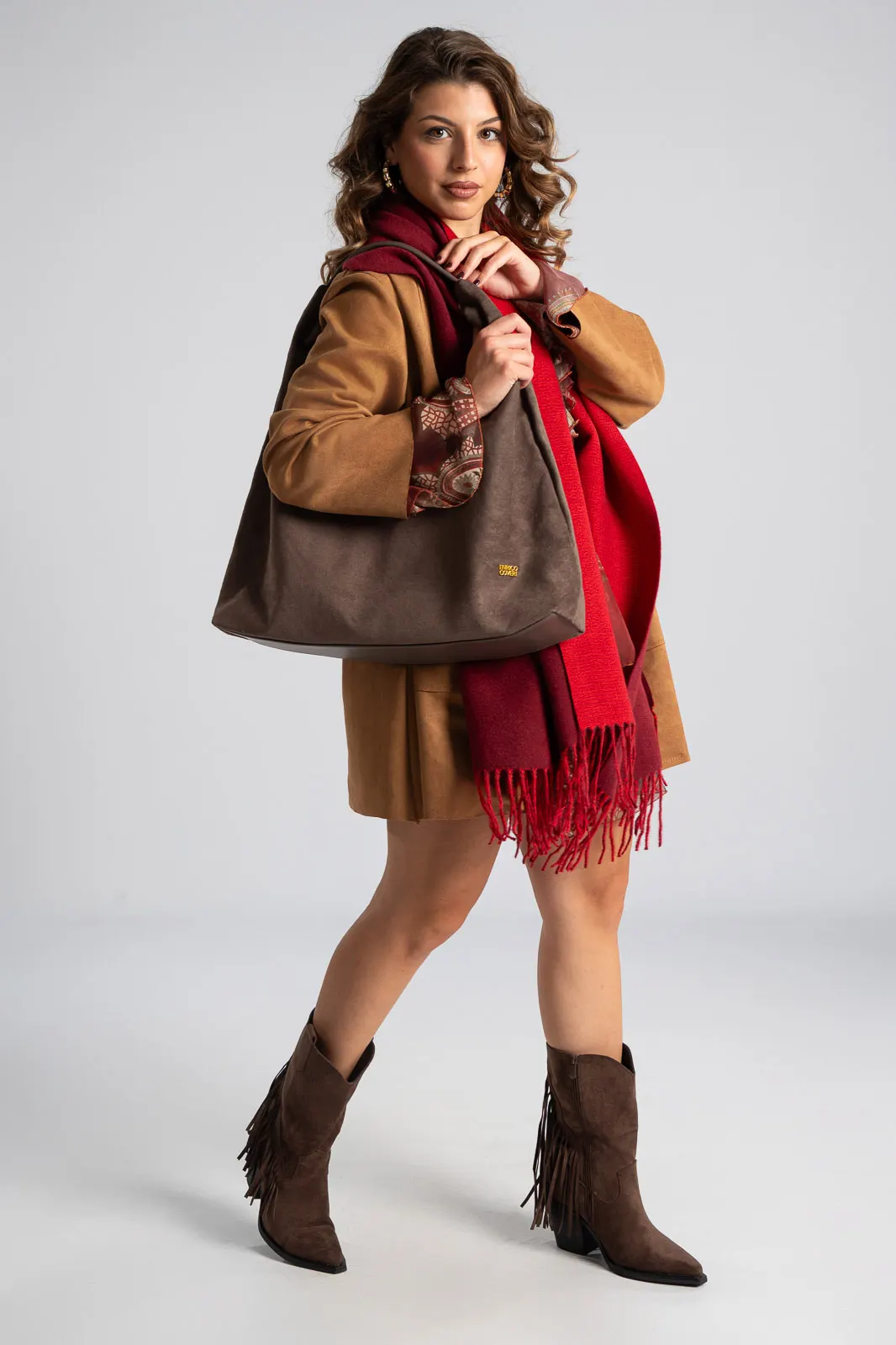 Shoulder bag. It has a leatherette handle. It closes with a clutch. Inside, it is lined with a single compartment and extra pockets. The entire surface has a soft texture and is suede. There is a hidden pocket on the back that closes with a zipper. The handle is fixed and is 60cm long. Bag size: 53 cm x 50 cm x 9 cm.
