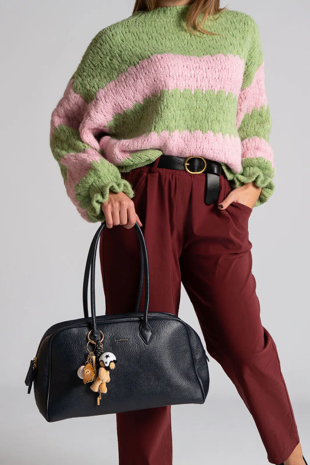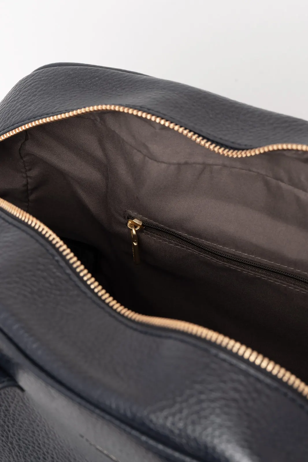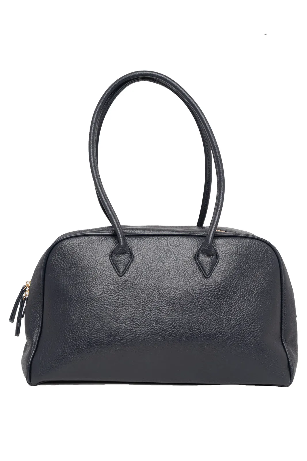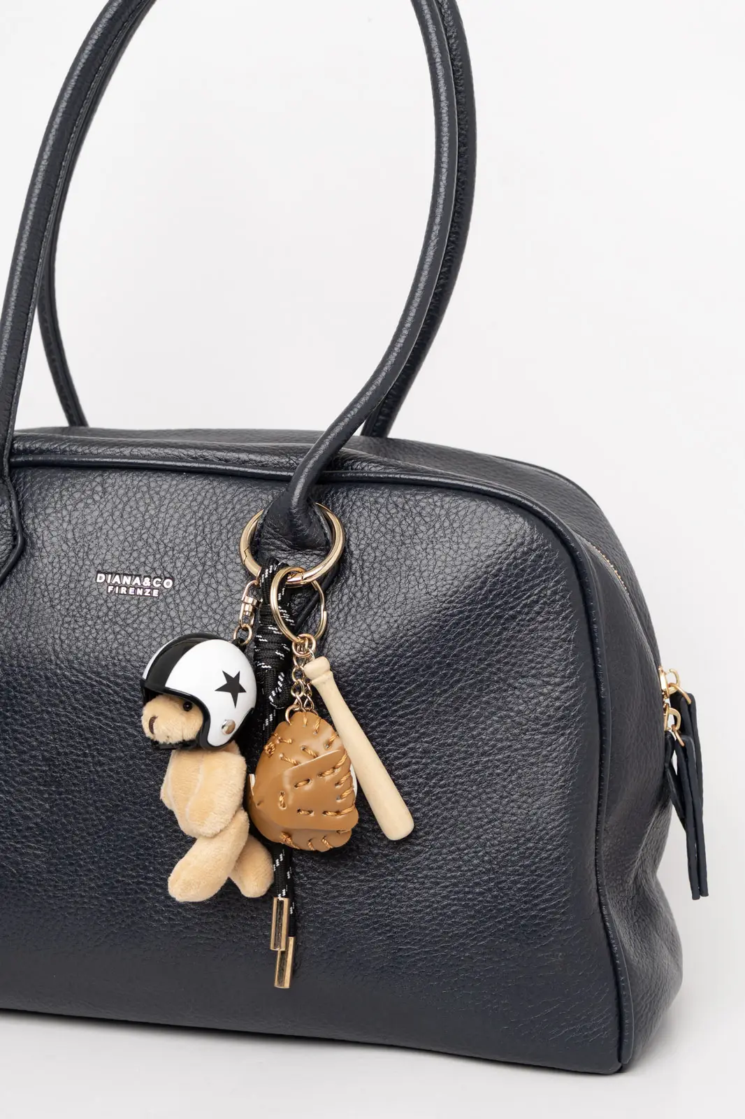 Bowling bag made of high-quality leatherette. It closes with a double-sided zipper for flexibility and functionality, as it can be opened and closed from both sides. It has fixed shoulder straps 63cm long. It is lined inside and has extra pockets. It has its own detachable key ring. Bag size: 40cm x 22cm x 13cm.