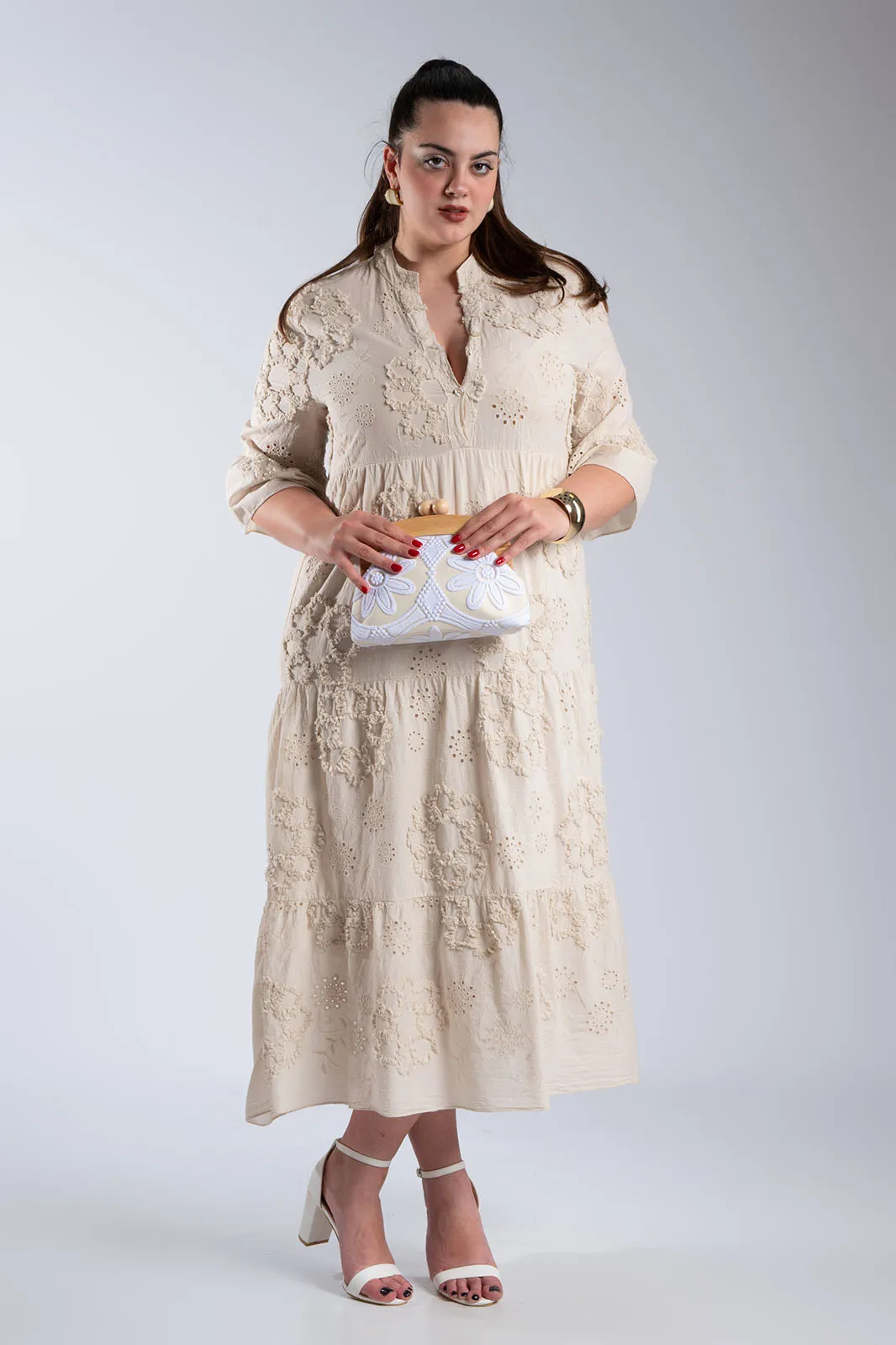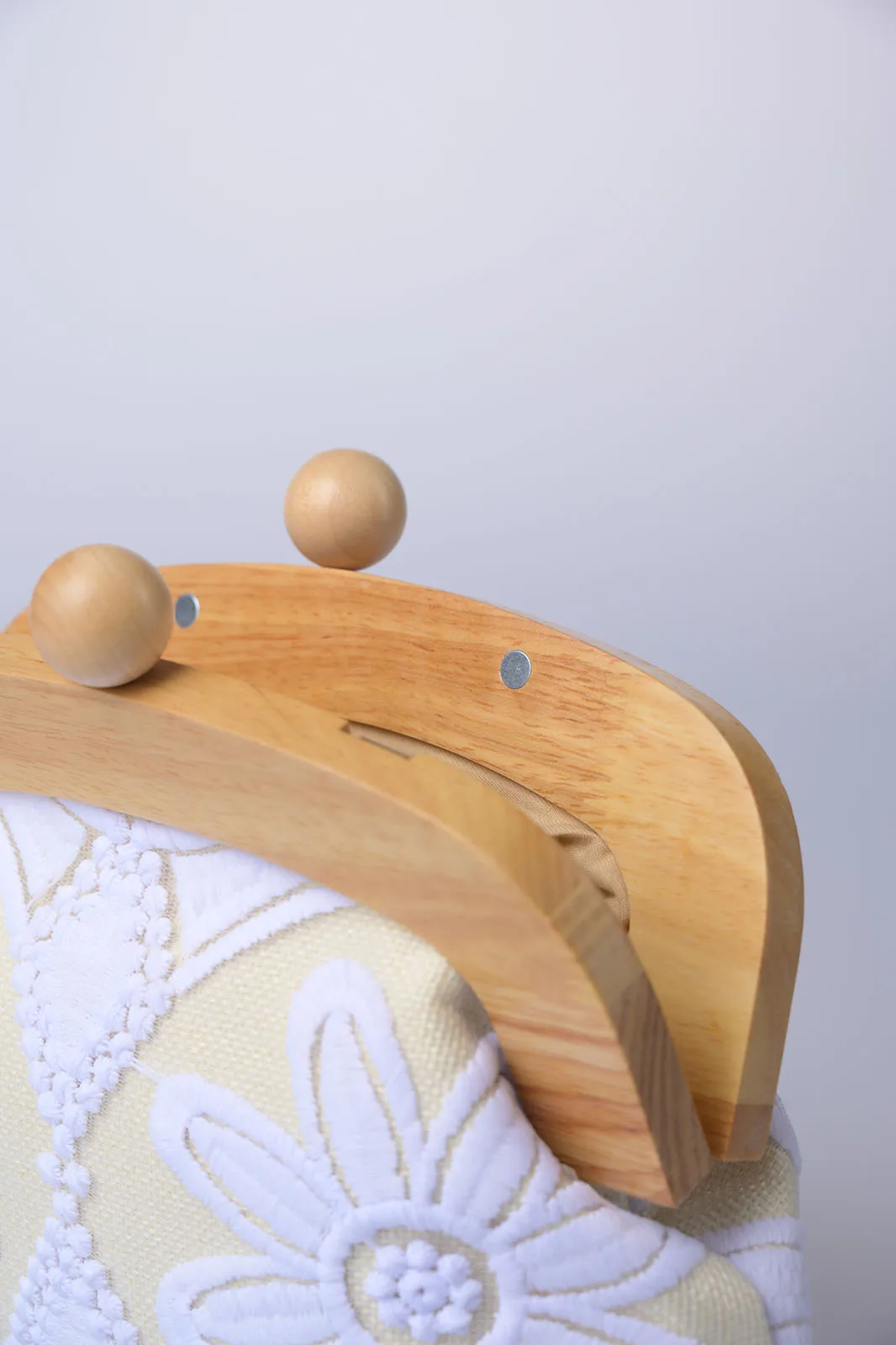 Κομψή clutch τσάντα με κεντημένο floral σχέδιο που αποπνέει ρομαντική αισθητική. Διαθέτει ξύλινο πλαίσιο με στρογγυλό κούμπωμα που προσθέτει φυσική κομψότητα και ξεχωριστό χαρακτήρα. Το εσωτερικό της είναι επενδεδυμένο και περιλαμβάνει θήκη για μικροαντικείμενα, ενώ η αποσπώμενη αλυσίδα με μήκος 118cm προσφέρει ευελιξία στο κράτημα.