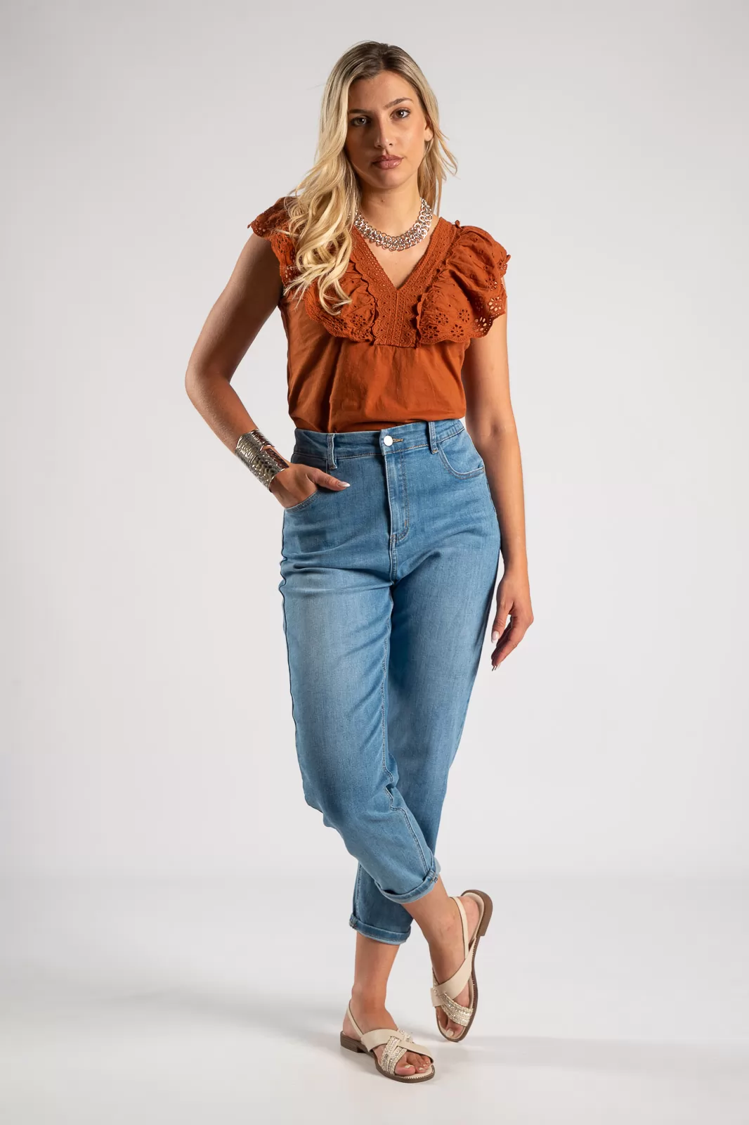 Παντελόνι τζιν ψηλόμεσο. Είναι 5 τσεπο και είναι σε ύφος baggy. Στο πίσω μέρος διαθέτει λάστιχο για καλύτερη εφαρμογή. Οι μετρήσεις του πίνακα είναι αντιπροσωπευτικές για κάθε κωδικό. 70% cotton, 25% polyester, 3% viscose, 2% elastan.