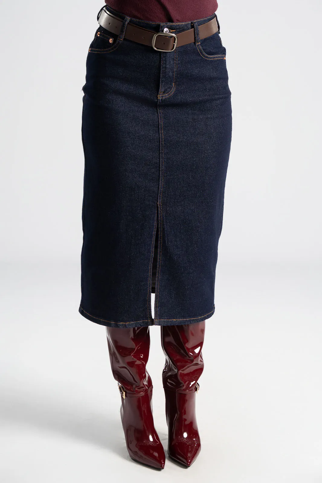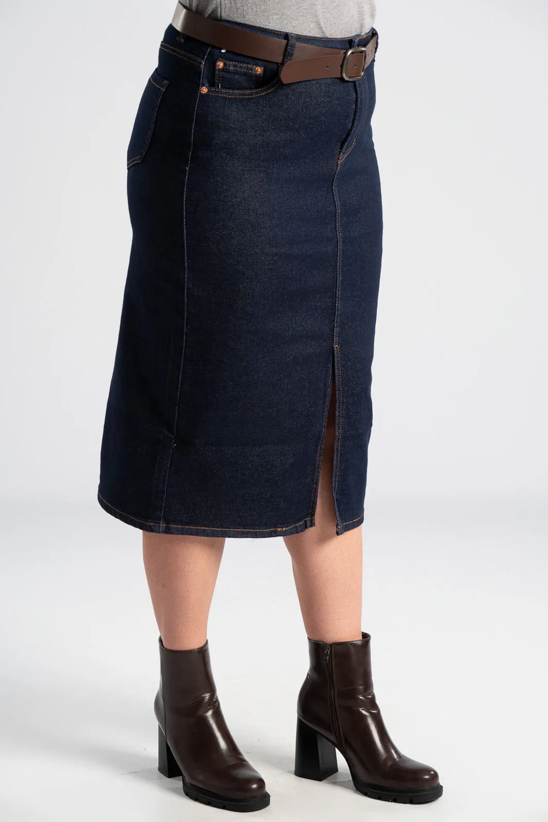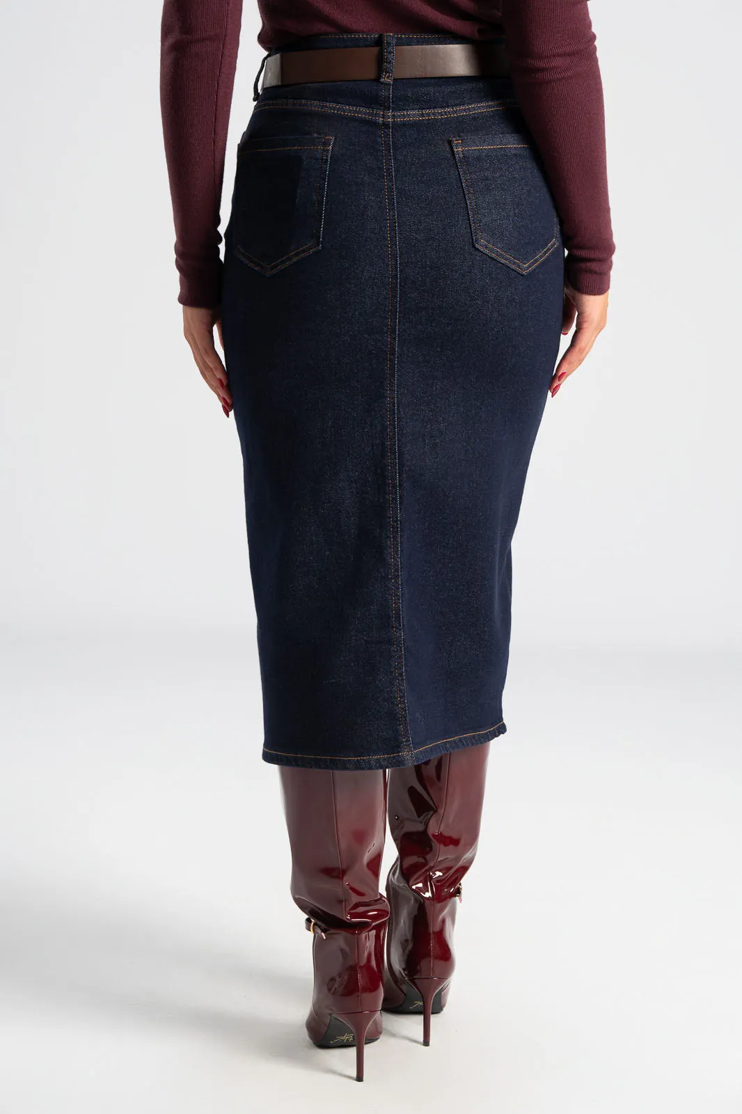 Φούστα τζιν σε ίσια γραμμή. Είναι 5τσεπη και διαθέτει άνοιγμα μπροστά. Είναι midi και έχει ελαστικό ύφασμα. Διαθέτει δική της ζώνη. Οι μετρήσεις του πίνακα είναι αντιπροσωπευτικές για κάθε προϊόν. 70% cotton, 28%polyester, 2% elastan.