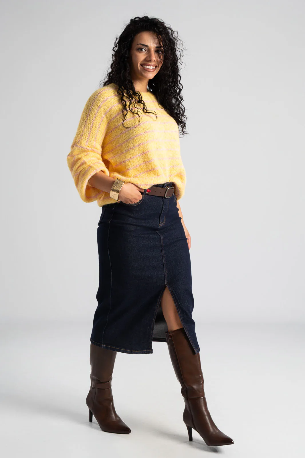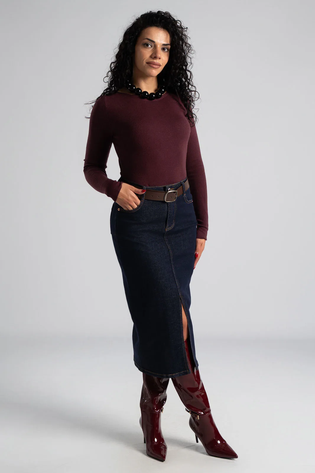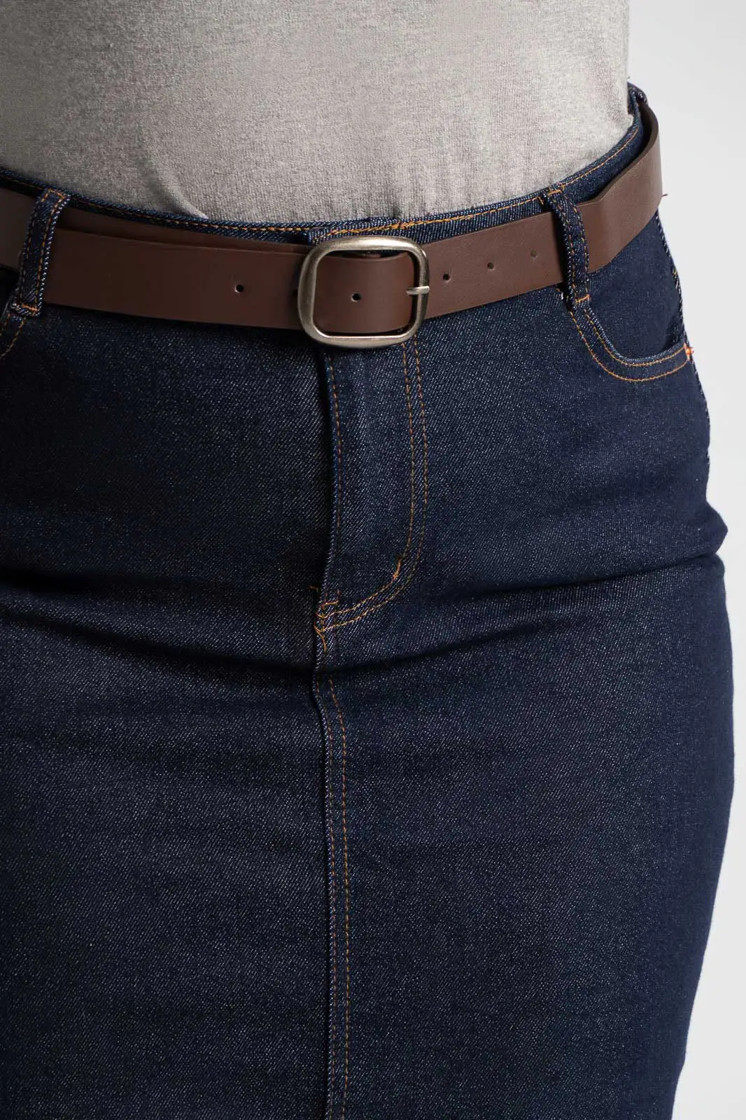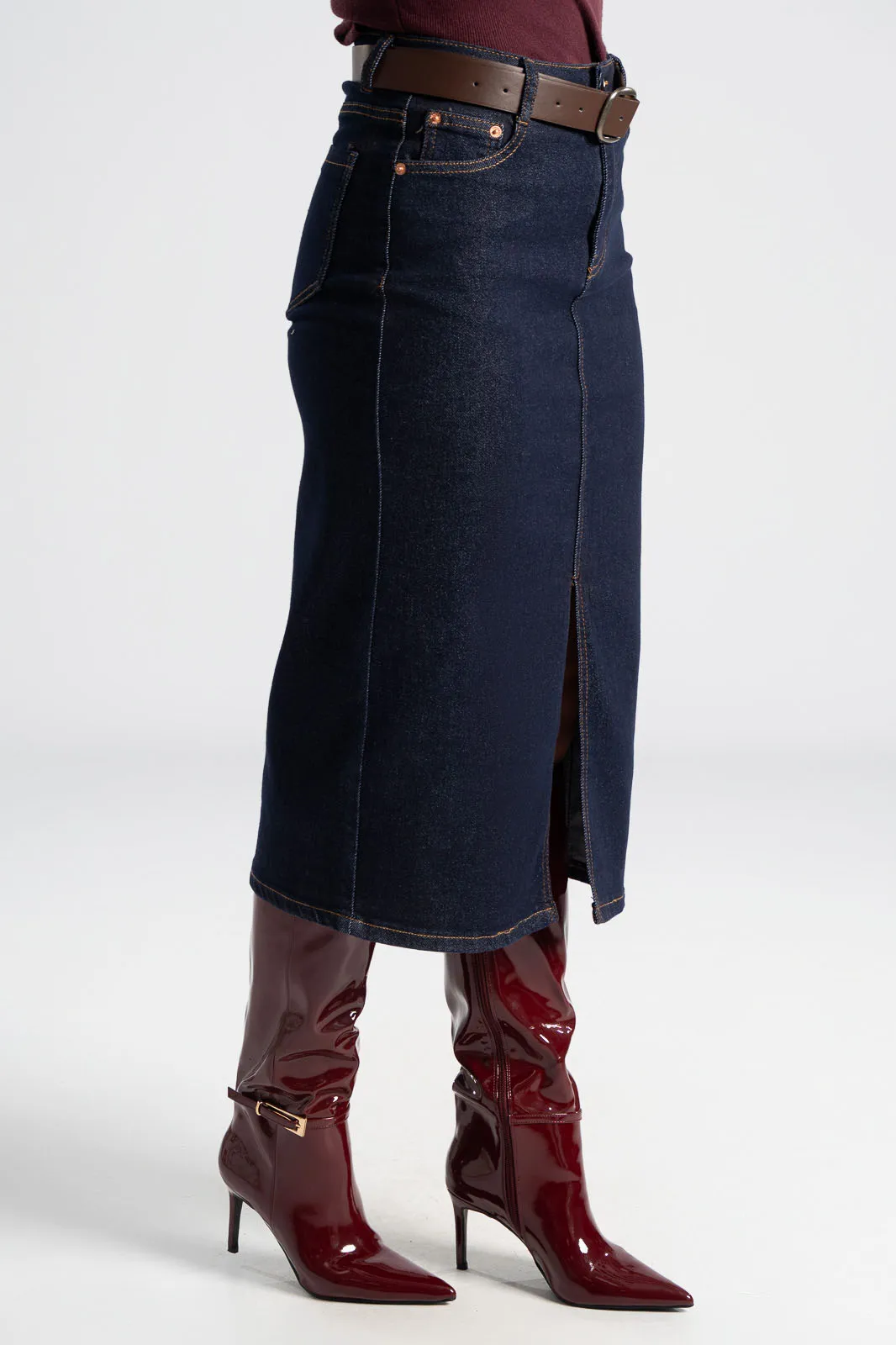 Φούστα τζιν σε ίσια γραμμή. Είναι 5τσεπη και διαθέτει άνοιγμα μπροστά. Είναι midi και έχει ελαστικό ύφασμα. Διαθέτει δική της ζώνη. Οι μετρήσεις του πίνακα είναι αντιπροσωπευτικές για κάθε προϊόν. 70% cotton, 28%polyester, 2% elastan.