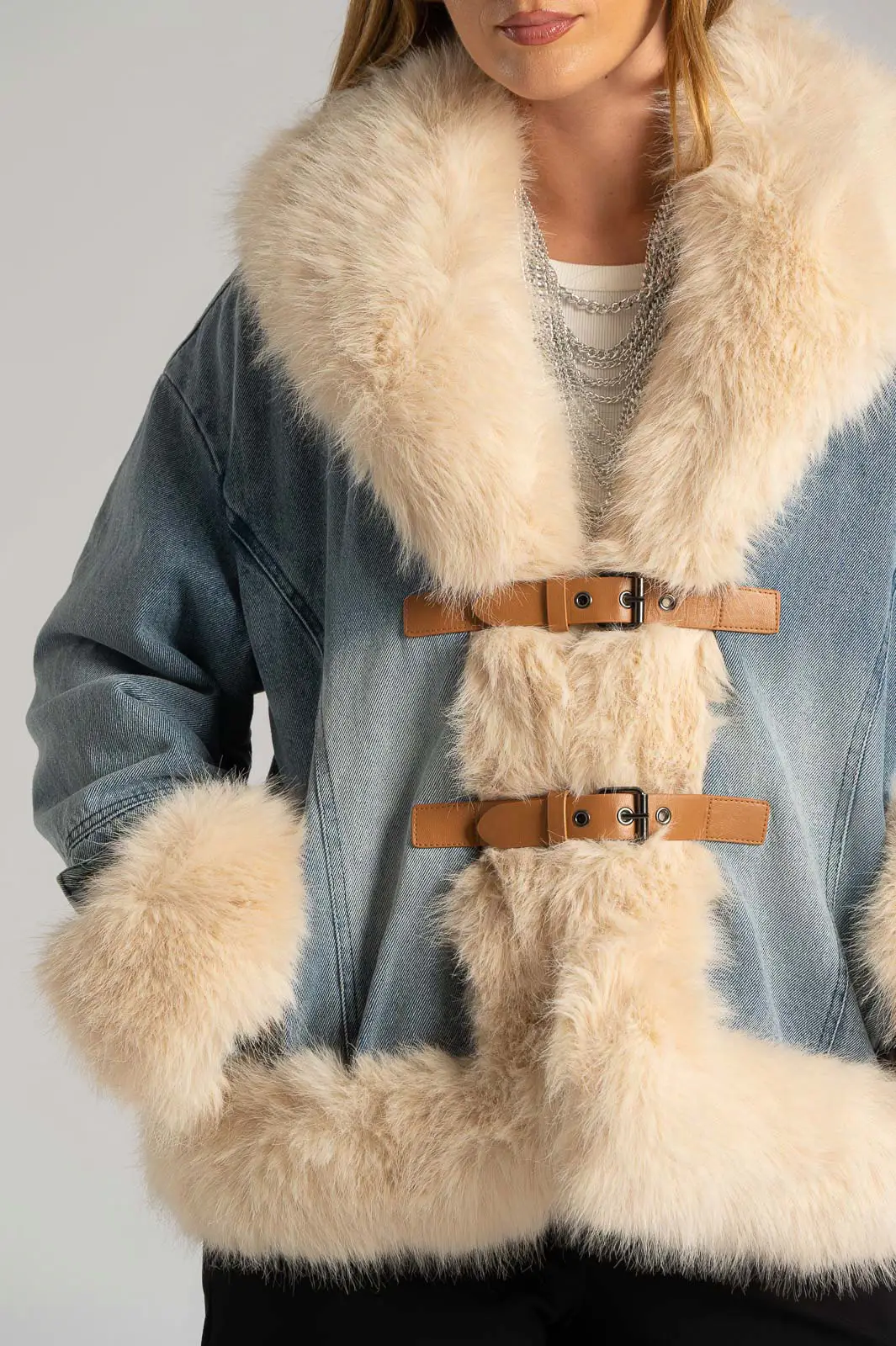 Τζιν jacket με ενσωματωμένο γιακά από πλούσια συνθετική γούνα, οποία συνεχίζεται και κατά μήκος του ανοίγματος, όπως και στο τελείωμα. Κλείνει με κουμπιά σε ύφος ζώνης. Στα μανίκια στο τελείωμα διαθέτει αποσπώμενη γούνινη μανσέτα. Εσωτερικά είναι φοδραρισμένο. Η μέτρηση έχει γίνει με κλειστά κουμπιά. Οι μετρήσεις του πίνακα είναι αντιπροσωπευτικές για κάθε προϊόν. 85% cotton, 15% polyester.