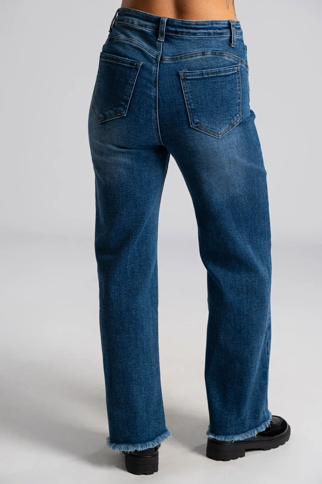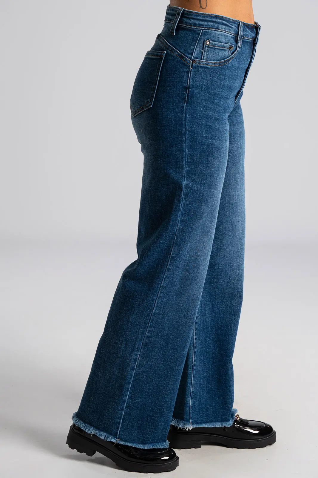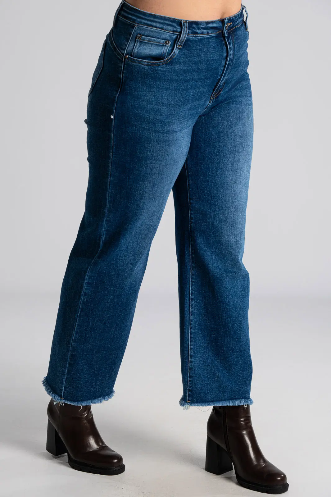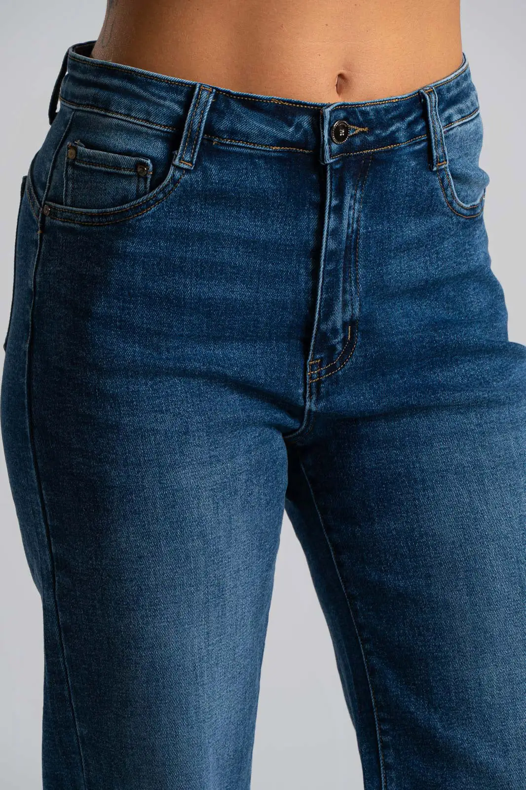 Τζιν παντελόνι με ίσια γραμμή. Είναι 5τσεπο και κλείνει με κουμπί και φερμουάρ. Είναι ψηλόμεσο με εφέ push up. Στο τελείωμα του διαθέτει κρόσια. Οι μετρήσεις του πίνακα είναι αντιπροσωπευτικές για κάθε προϊόν. 70% cotton, 25% polyester, 3% viscose 2% elastan.