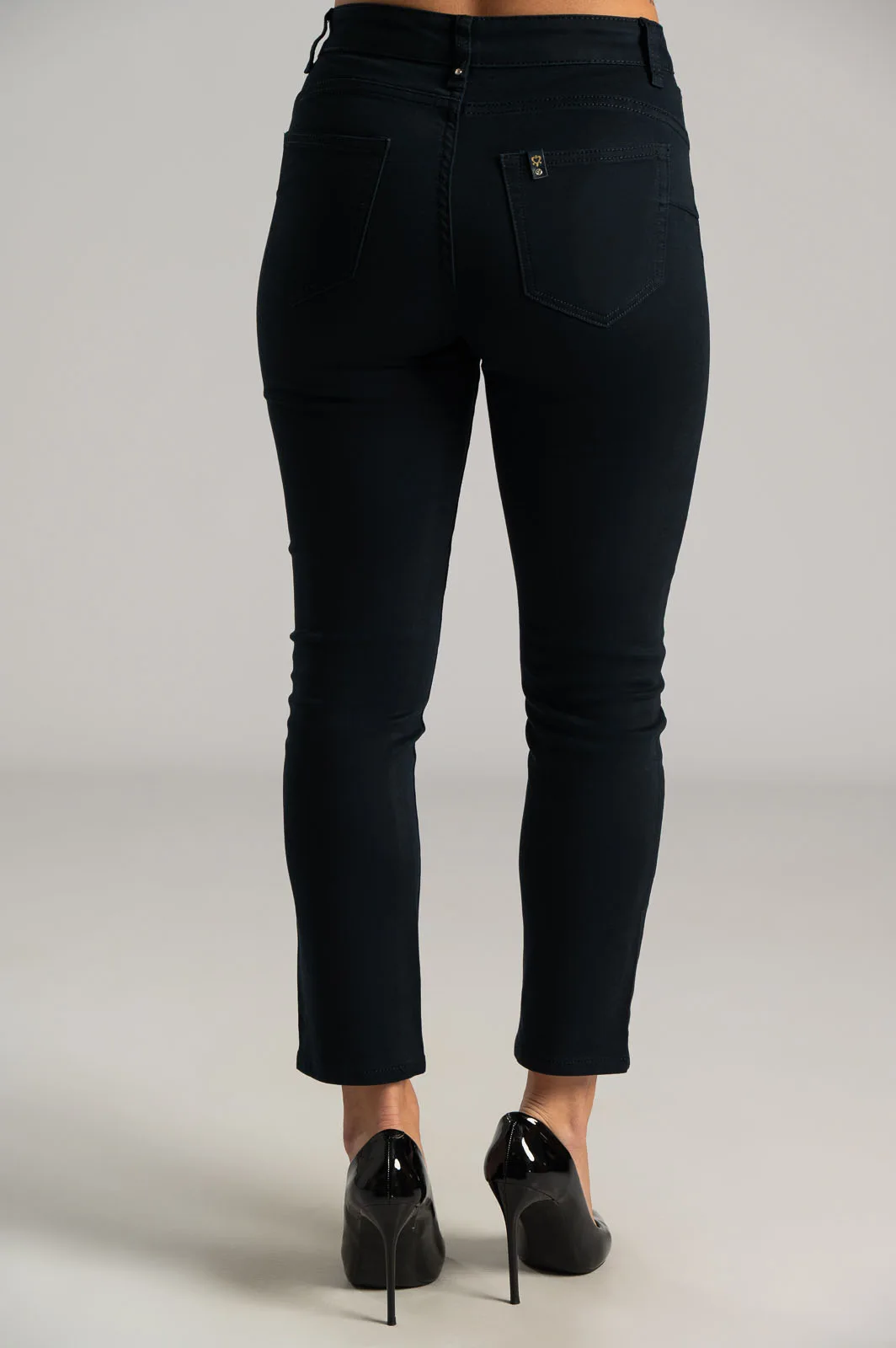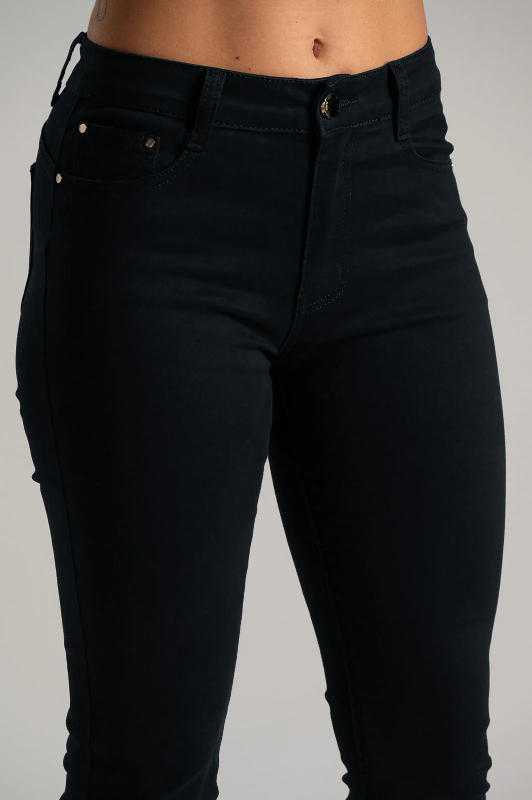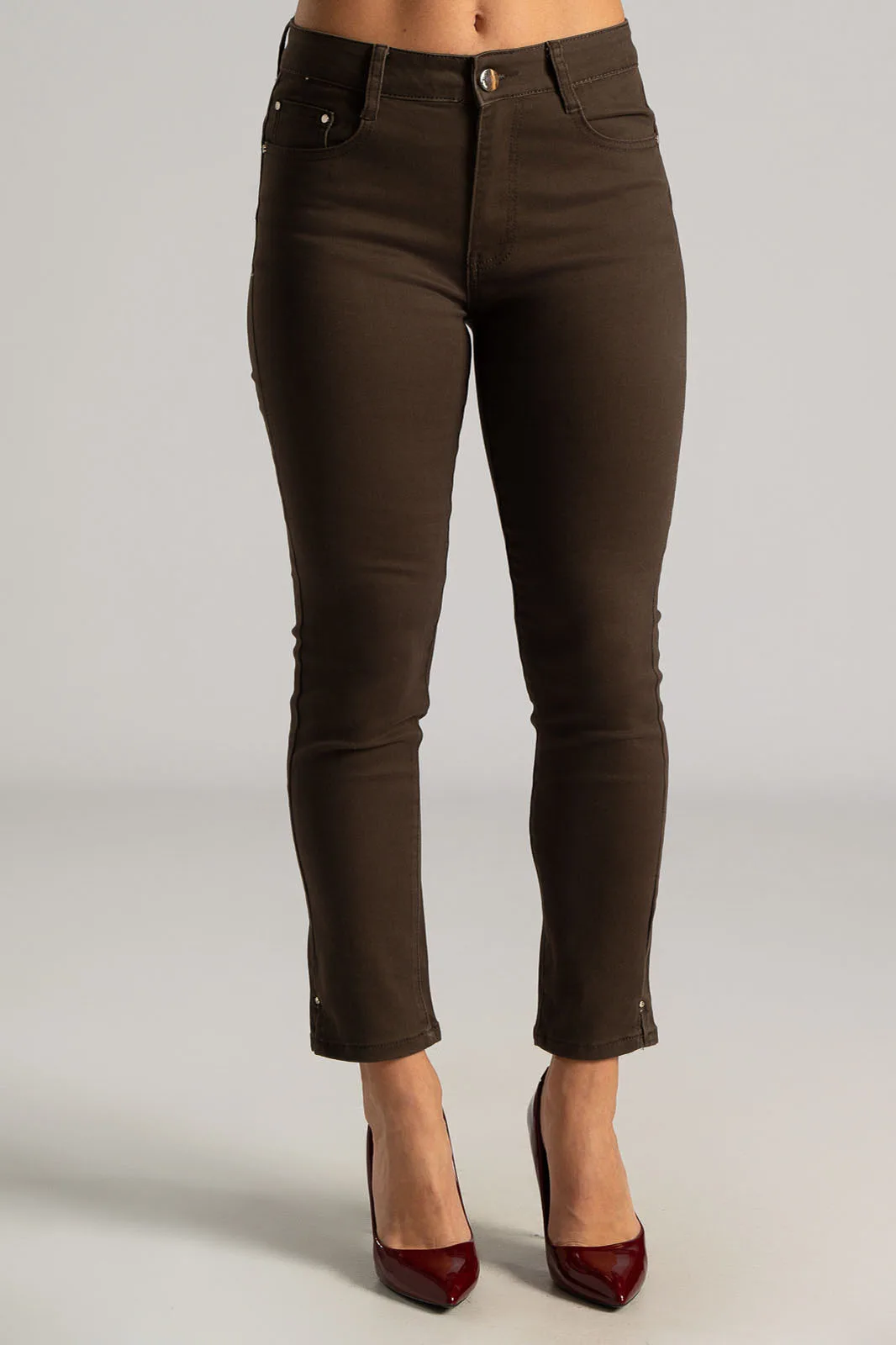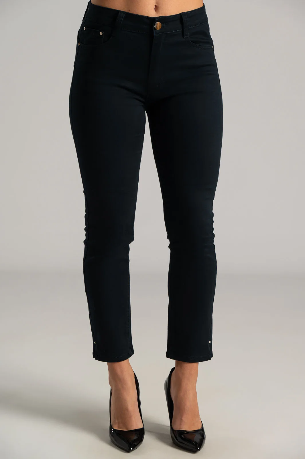 Jeans. Fastens with a button and zipper. It has 5 pockets. It features decorative rhinestones in some areas. The measurements in the table are representative of each product. 63% cotton, 34% polyester, 3% elastane.