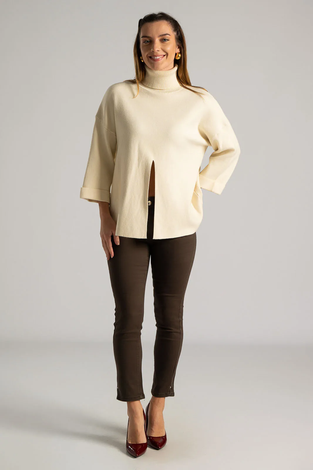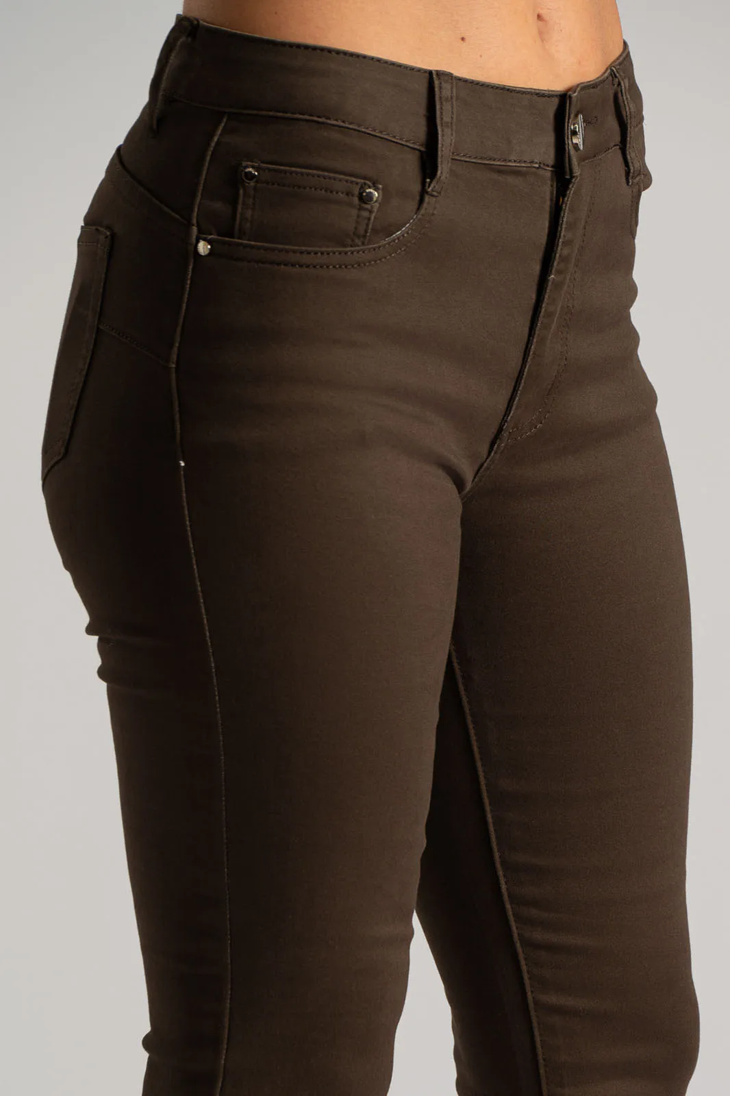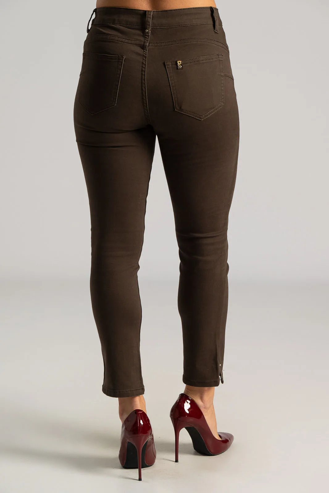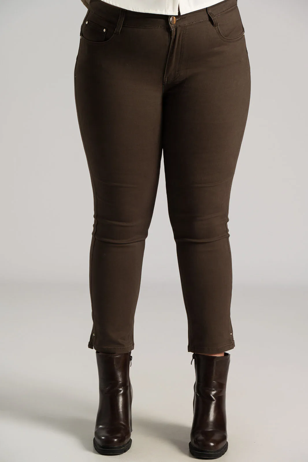 Jeans. Fastens with a button and zipper. It has 5 pockets. It features decorative rhinestones in some areas. The measurements in the table are representative of each product. 63% cotton, 34% polyester, 3% elastane.