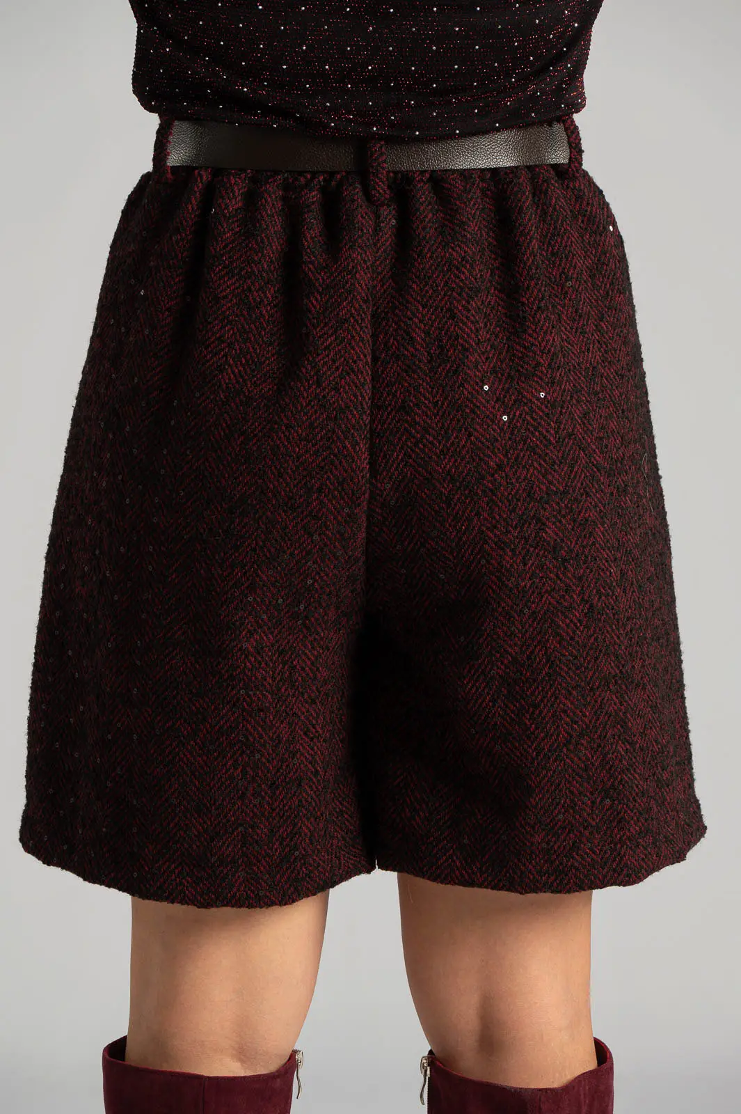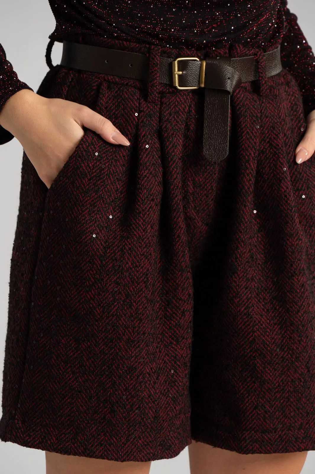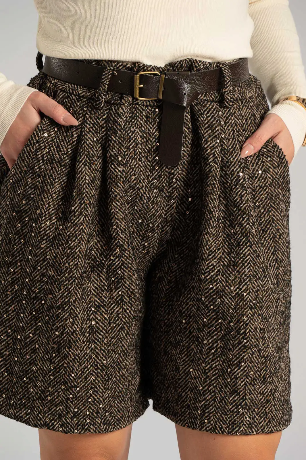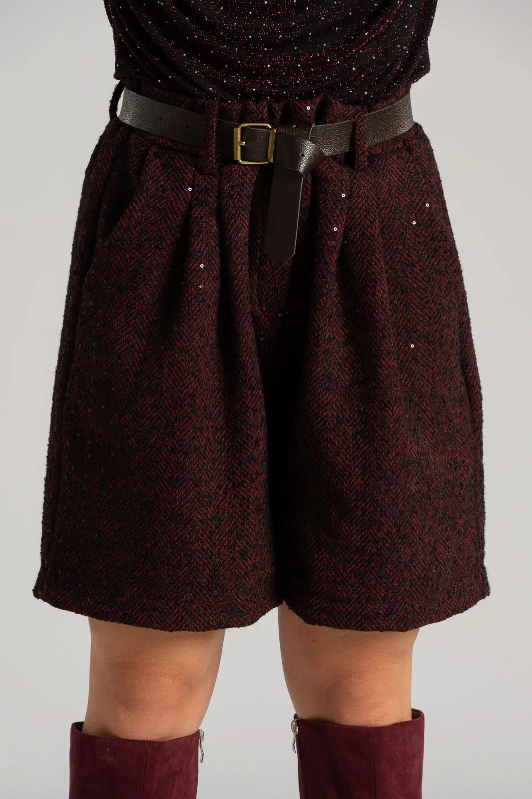Βερμούδα σε μάλλινη υφή. Έχει πλαινές τσέπες και λάστιχο στη μέση στην πίσω μεριά. Διαθέτει δική του ζώνη δερματίνη. Έχει σχέδιο ζικ ζακ και σε όλη την επιφάνεια έχει μικρές παγιέτες που προσδίδουν διακριτική λάμψη. Οι μετρήσεις του πίνακα είναι αντιπροσωπευτικές για κάθε προϊόν. 100% polyester.