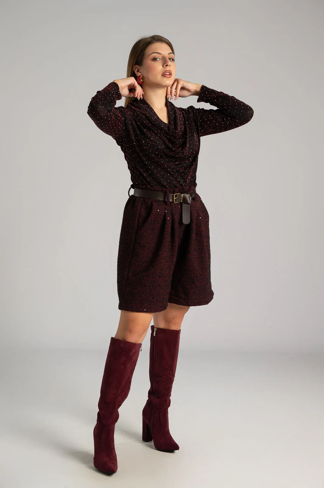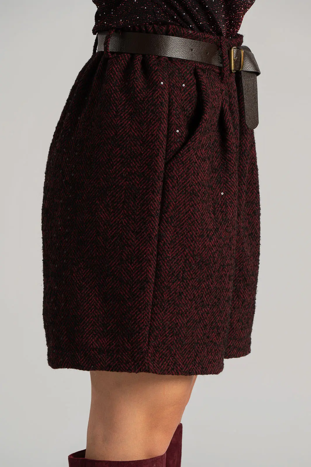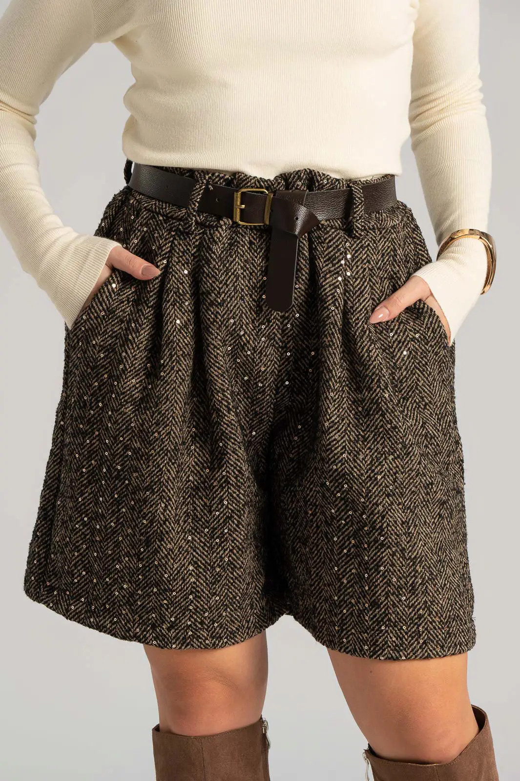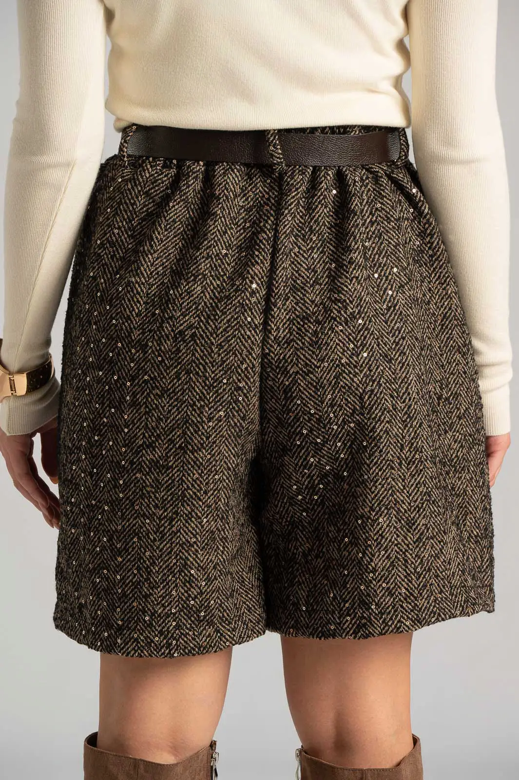 Βερμούδα σε μάλλινη υφή. Έχει πλαινές τσέπες και λάστιχο στη μέση στην πίσω μεριά. Διαθέτει δική του ζώνη δερματίνη. Έχει σχέδιο ζικ ζακ και σε όλη την επιφάνεια έχει μικρές παγιέτες που προσδίδουν διακριτική λάμψη. Οι μετρήσεις του πίνακα είναι αντιπροσωπευτικές για κάθε προϊόν. 100% polyester.