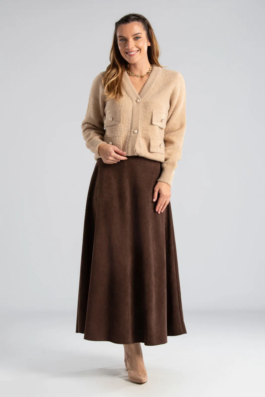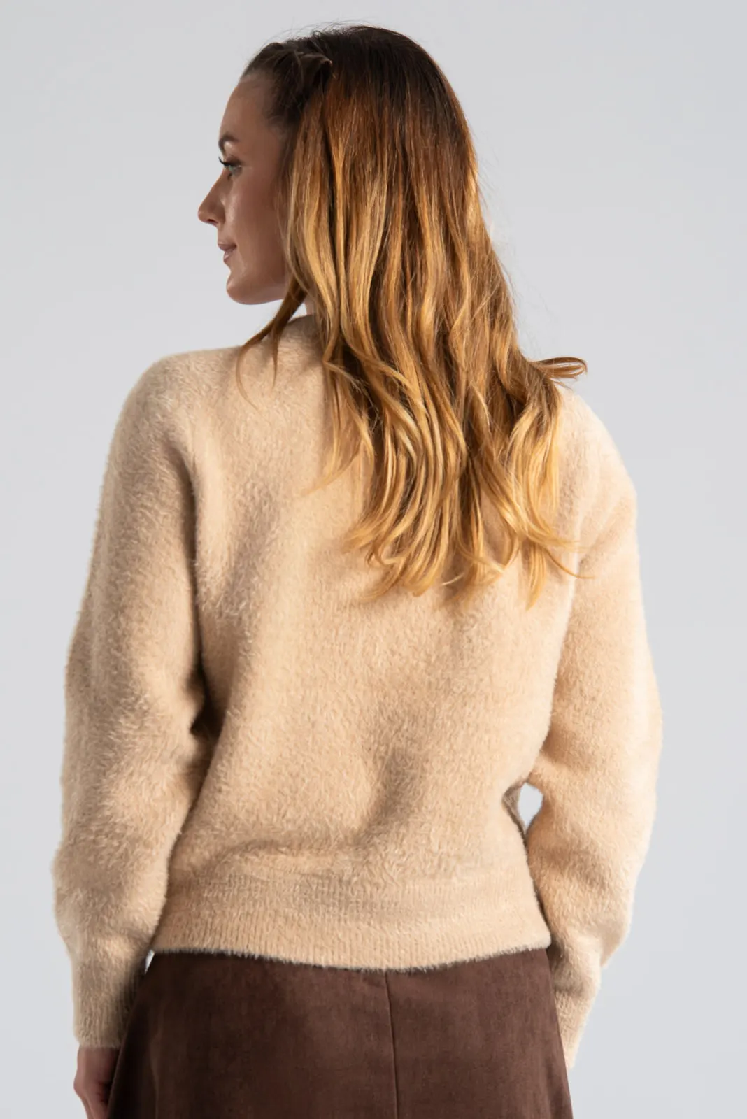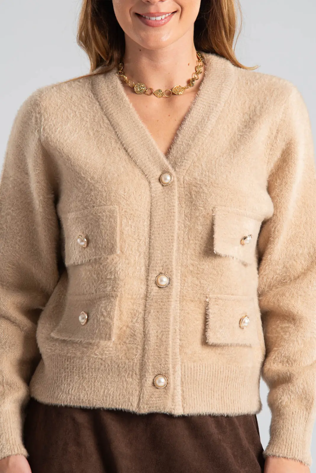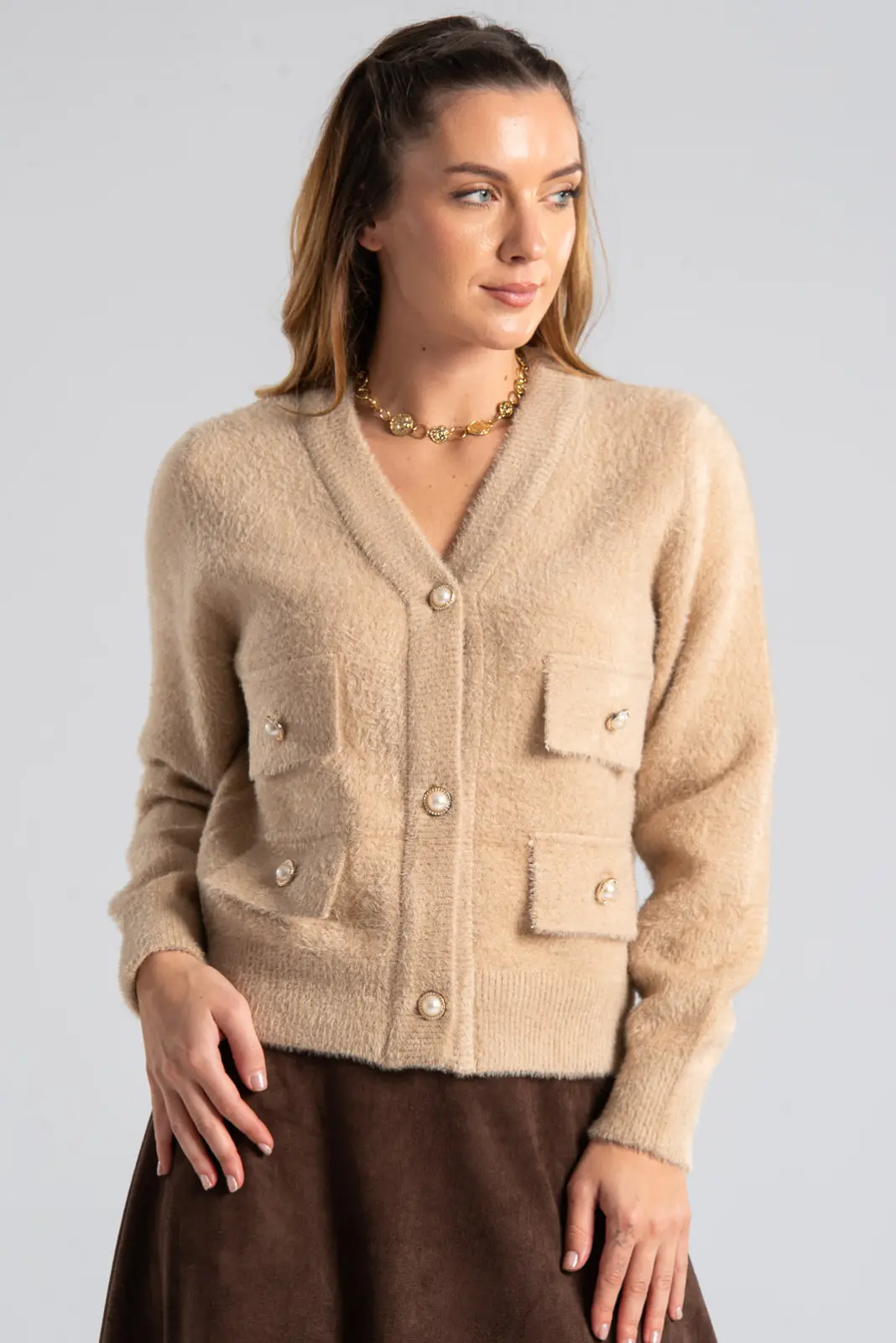 Ζακέτα σε fluffy υφή. Σε όλη την επιφάνεια έχει συνθετική γούνα. Έχει V λαιμόκοψη και ιδιαίτερα μεταλλικά κουμπιά με διακοσμητική πέρλα. Έχει μακριά μανίκια. Στην μπροστινή μεριά έχει εικονικές τσέπες με καπάκι. Στην λαιμόκοψη, στο κλείσιμο, στα κουμπιά και στο τελείωμα των μανικιών έχει rib ύφανση. Η μέτρηση έχει γίνει με κλειστά κουμπιά. Οι μετρήσεις του πίνακα είναι αντιπροσωπευτικές για κάθε προϊόν. 65% cotton, 35% polyester.