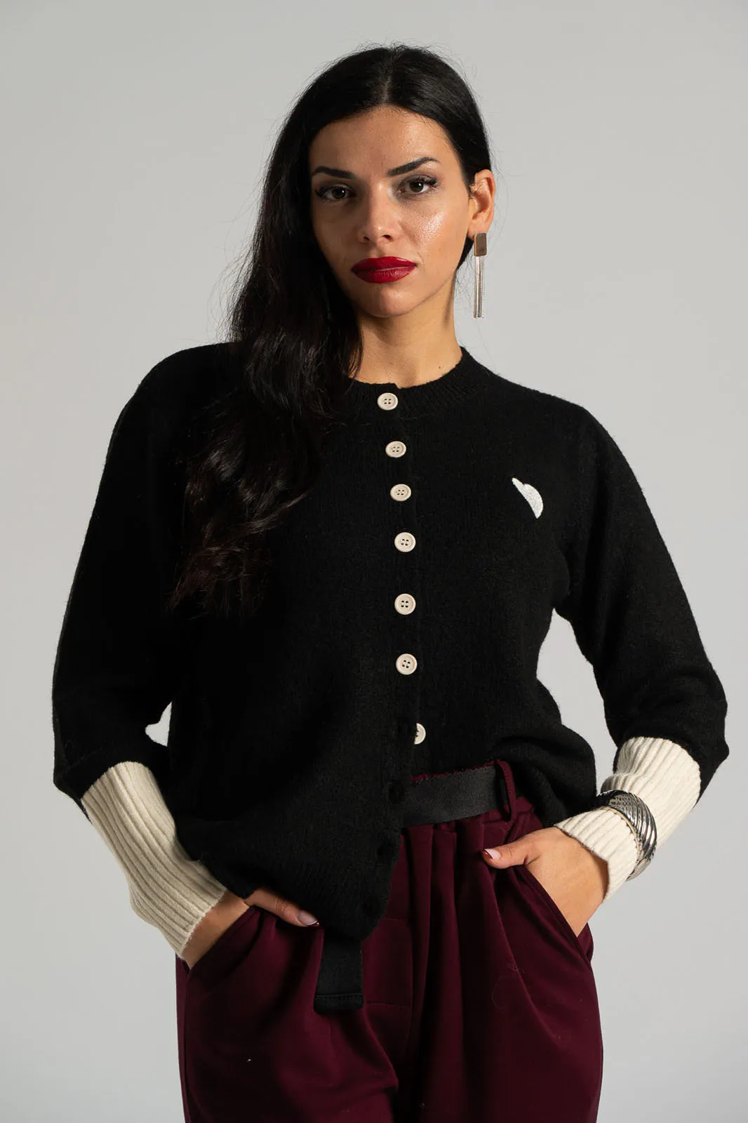 Knitted cardigan with compact knit. It has a round neckline and long sleeves. The sleeves, neckline, and hem are finished with ribbing. It has a decorative heart at chest height. Measurements are taken with buttons closed. The measurements in the table are representative of each product. 40% polyester, 38% wool, 20% polyamide, 2% elastane.