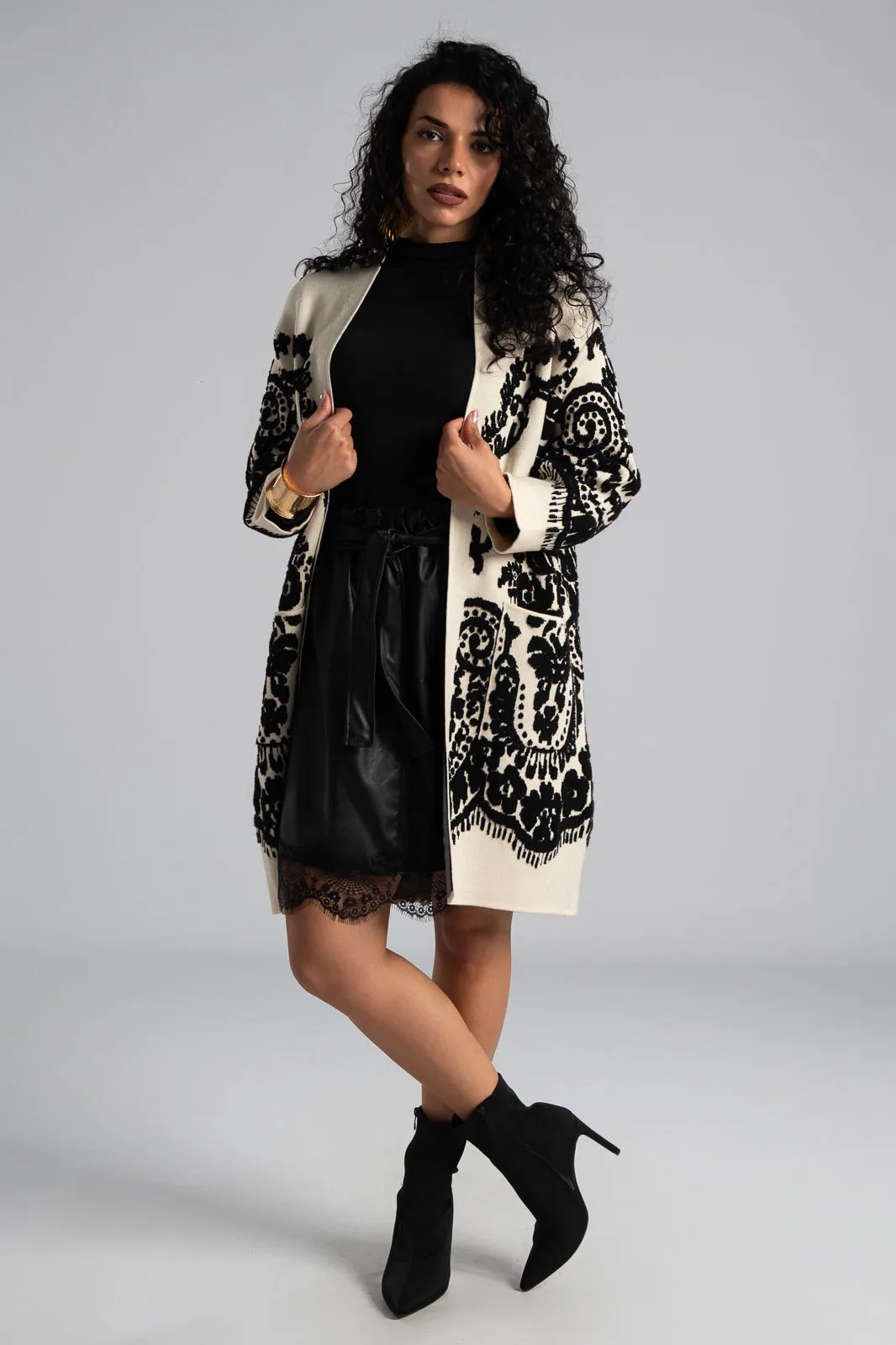 Jacket with compact yarn weave. And long sleeves. Features baroque relief embroidery across the entire surface. It is midi length. The measurement was taken with the palm of the hand open. The measurements in the table are representative of each product. 65% viscose, 35% nylon.