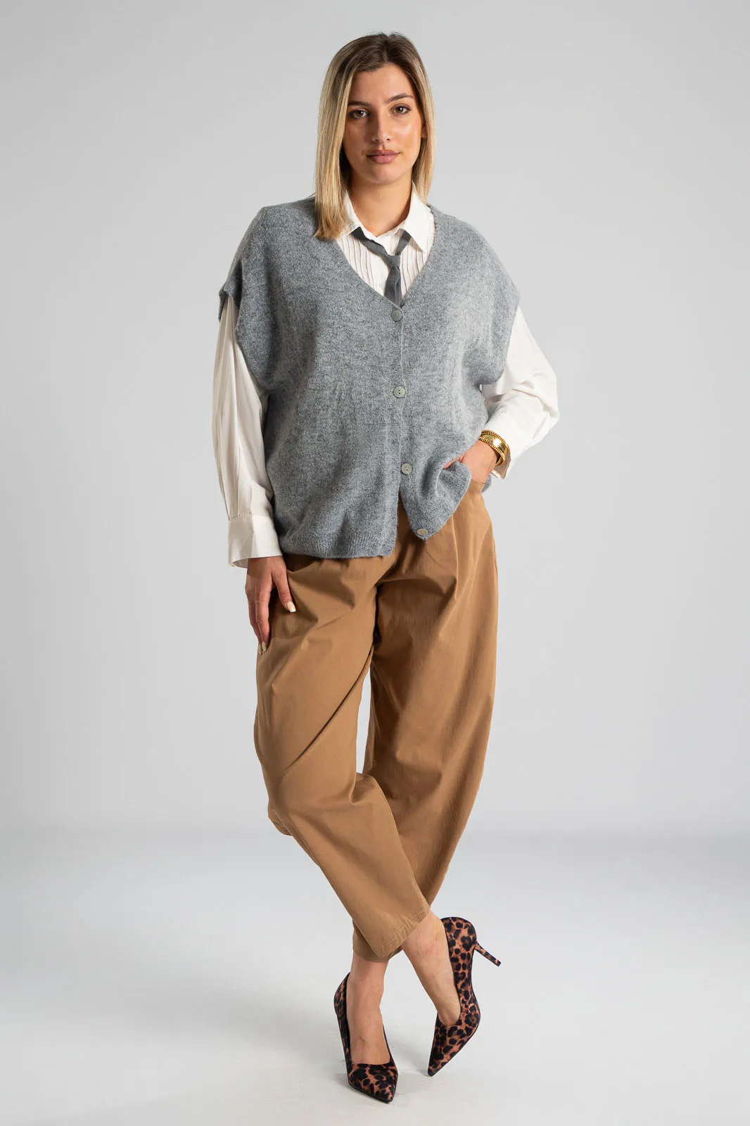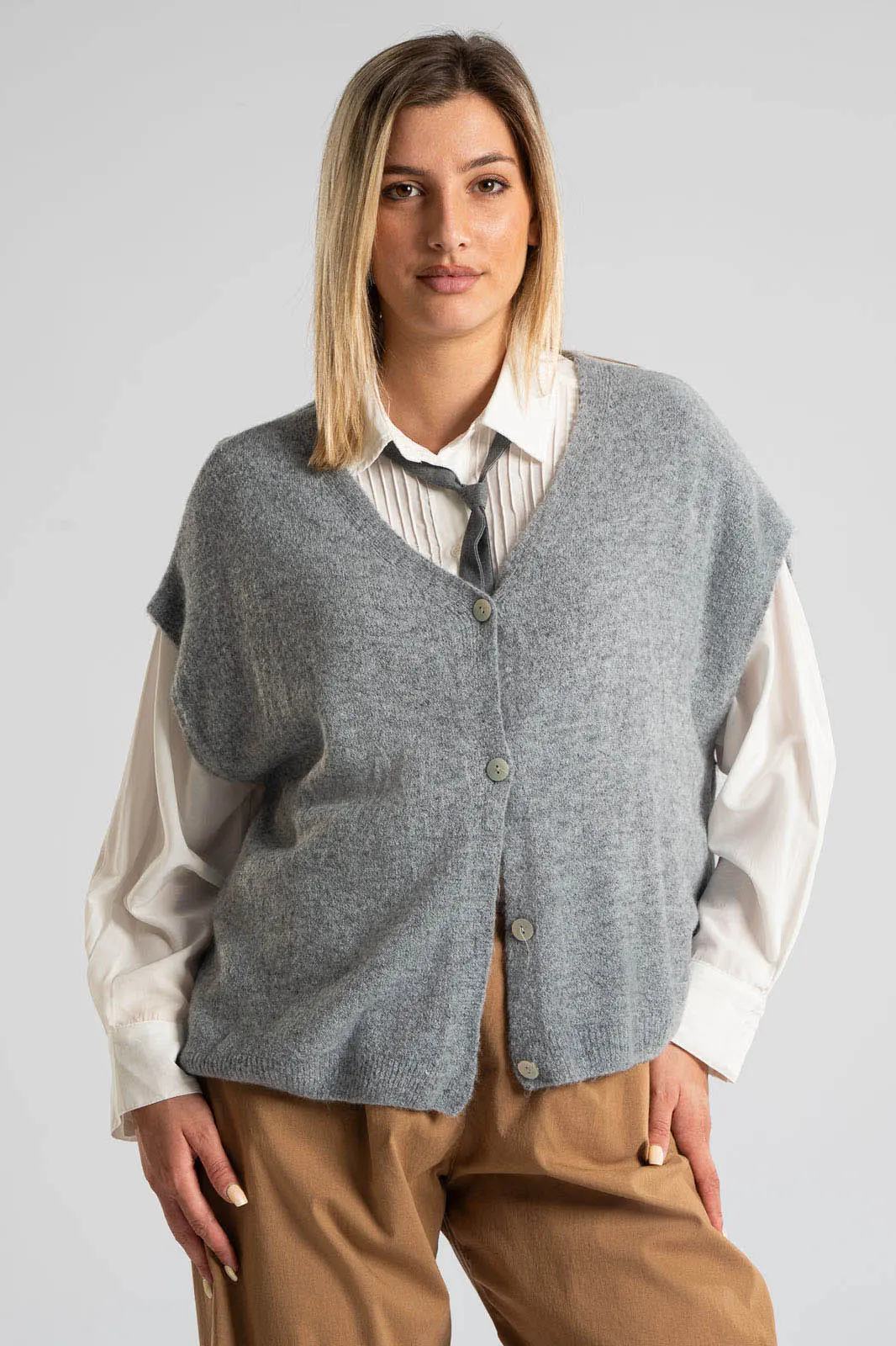 Cardigan with very short sleeves and V-neck opening. Wool-type fabric. Closes with buttons. Measurements taken with buttons fastened. Comfortable fit. The measurements in the table are representative of each code. 59% acrylic, 25% nylon, 10% alpaca, 6% rubber.