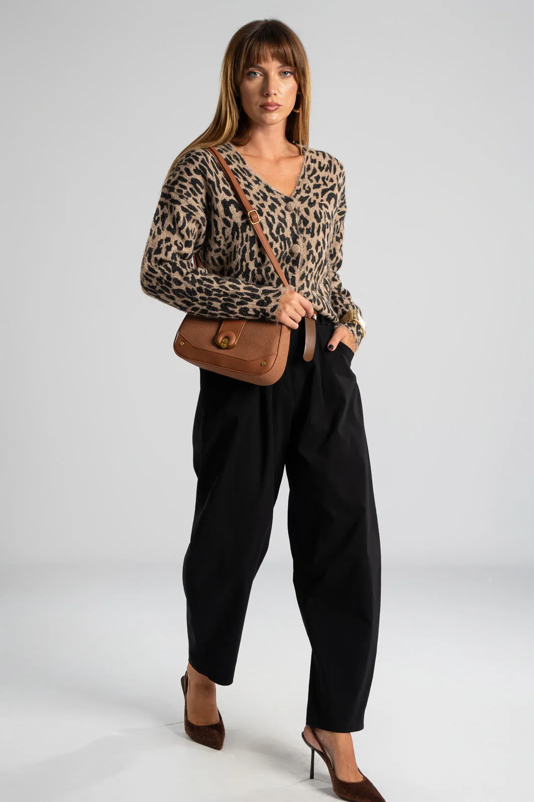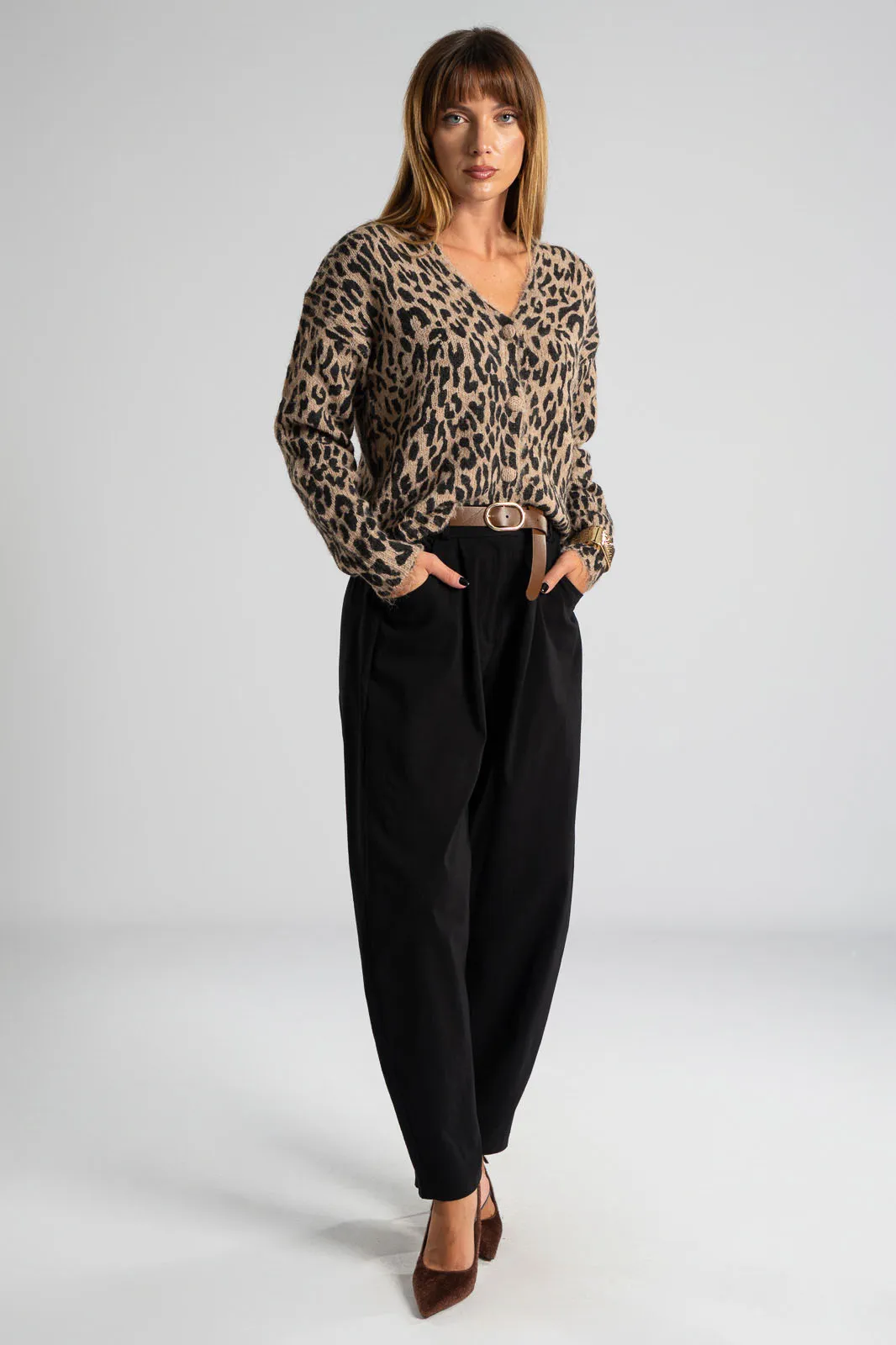 Cardigan with V-neck opening. It fastens with buttons and has long sleeves. Animal pattern across the entire surface. Measurements taken with buttons closed. The measurements in the table are representative for each code. 50% viscose, 29% polyamide, 15% polyester, 1% elastane.