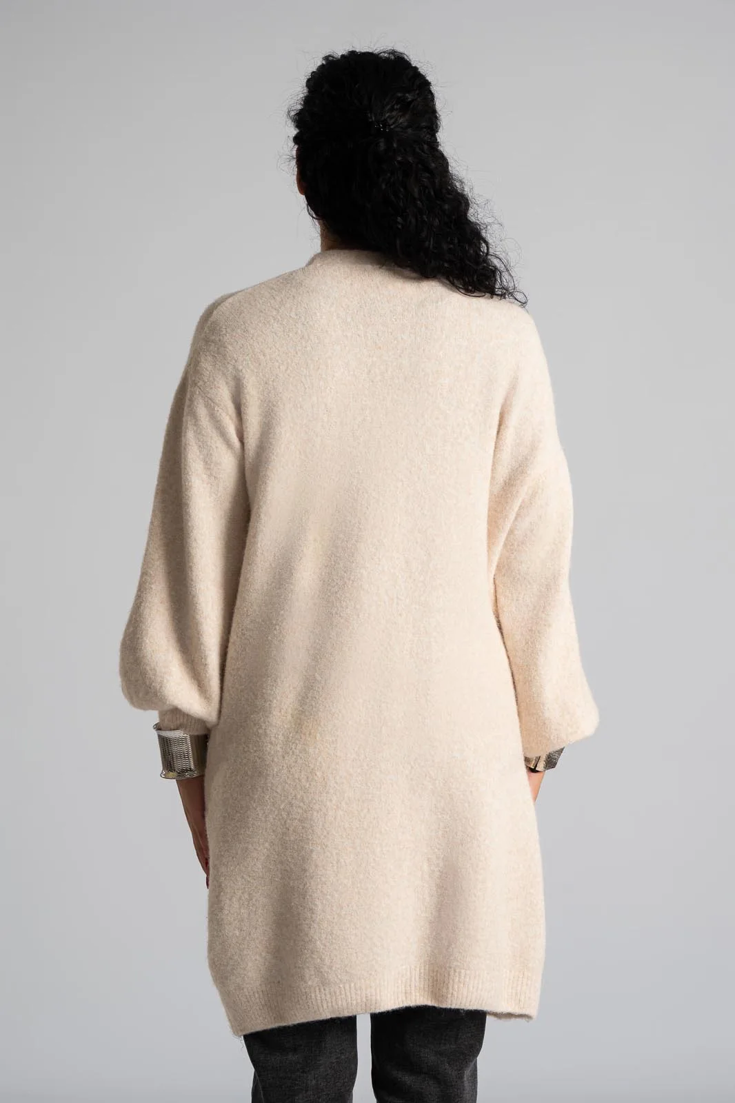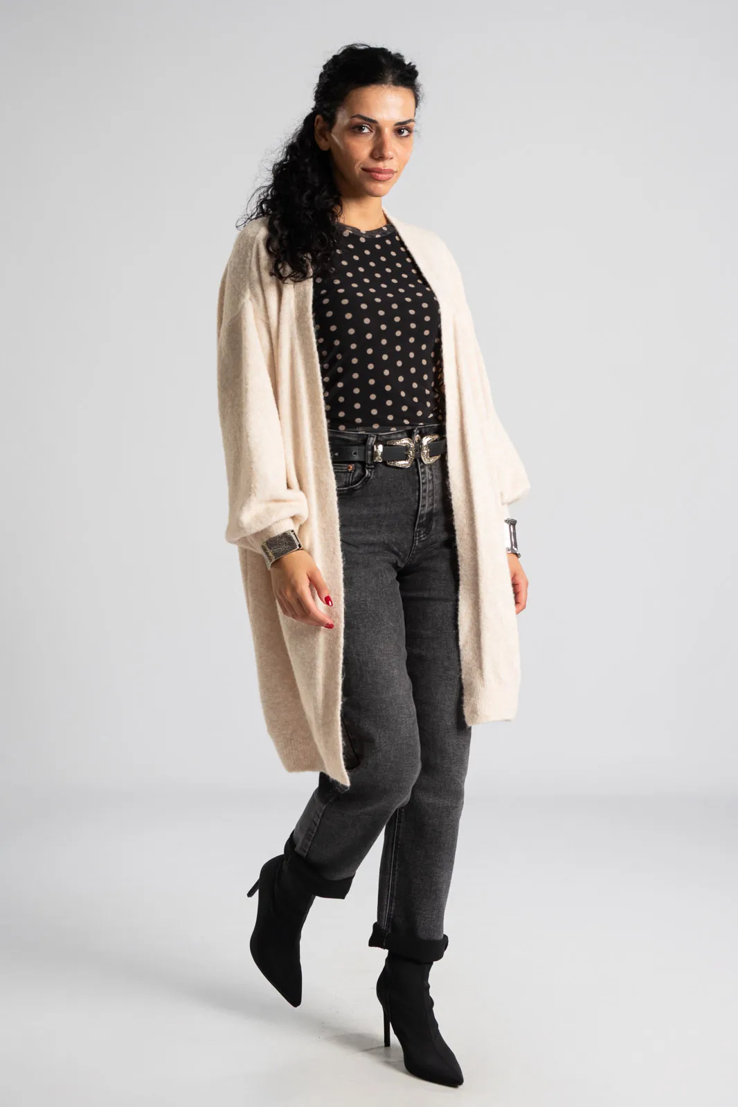 Wool cardigan. It has long sleeves that end with elastic. It has no buttons. The measurement was taken with the palm of the hand open. The measurements in the table are representative for each code. 10% wool, 9% nylon, 29% acrylic, 24% recycled polyester, 10% alpaca, 14% polyester, 4% spandex.