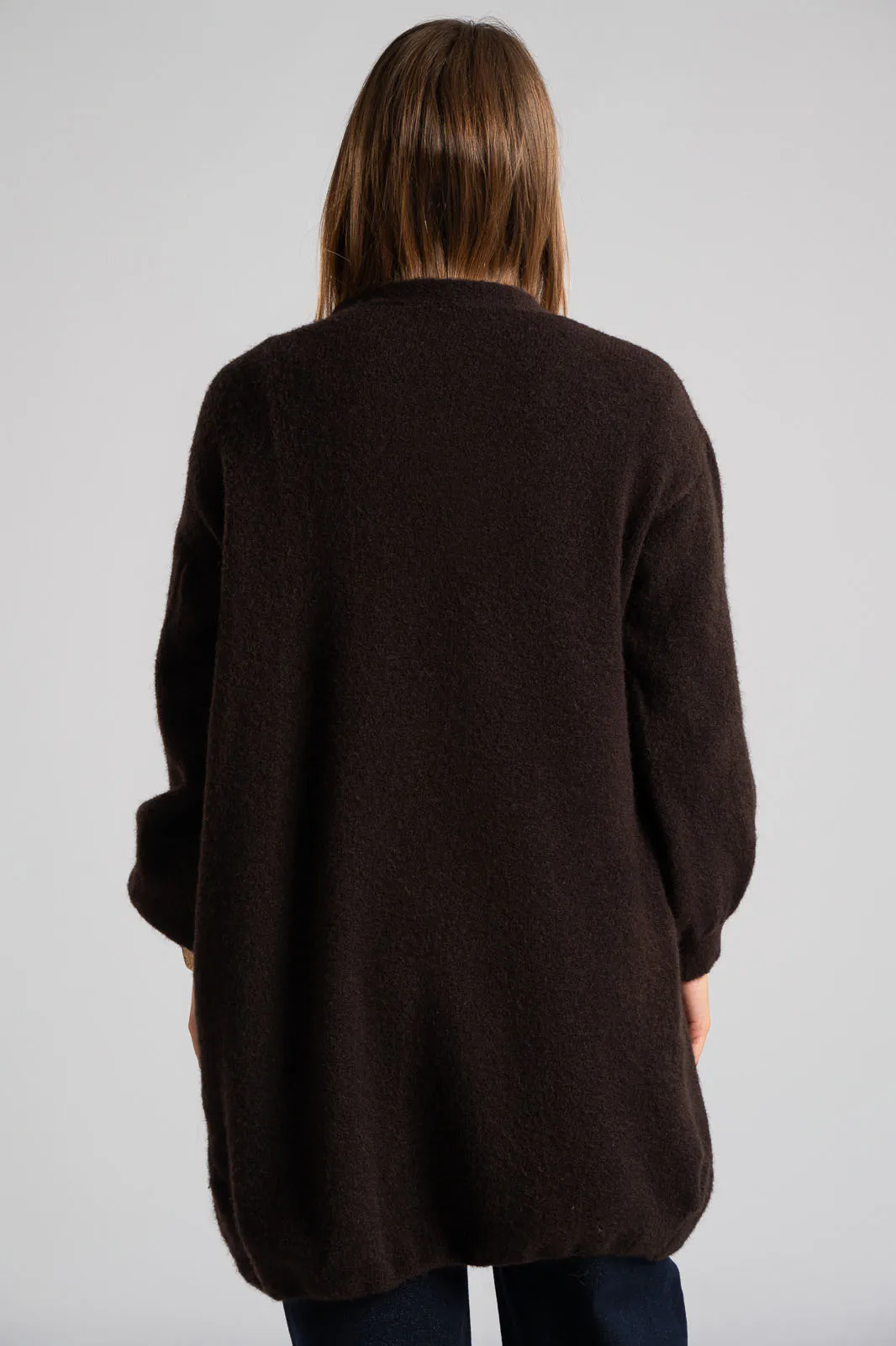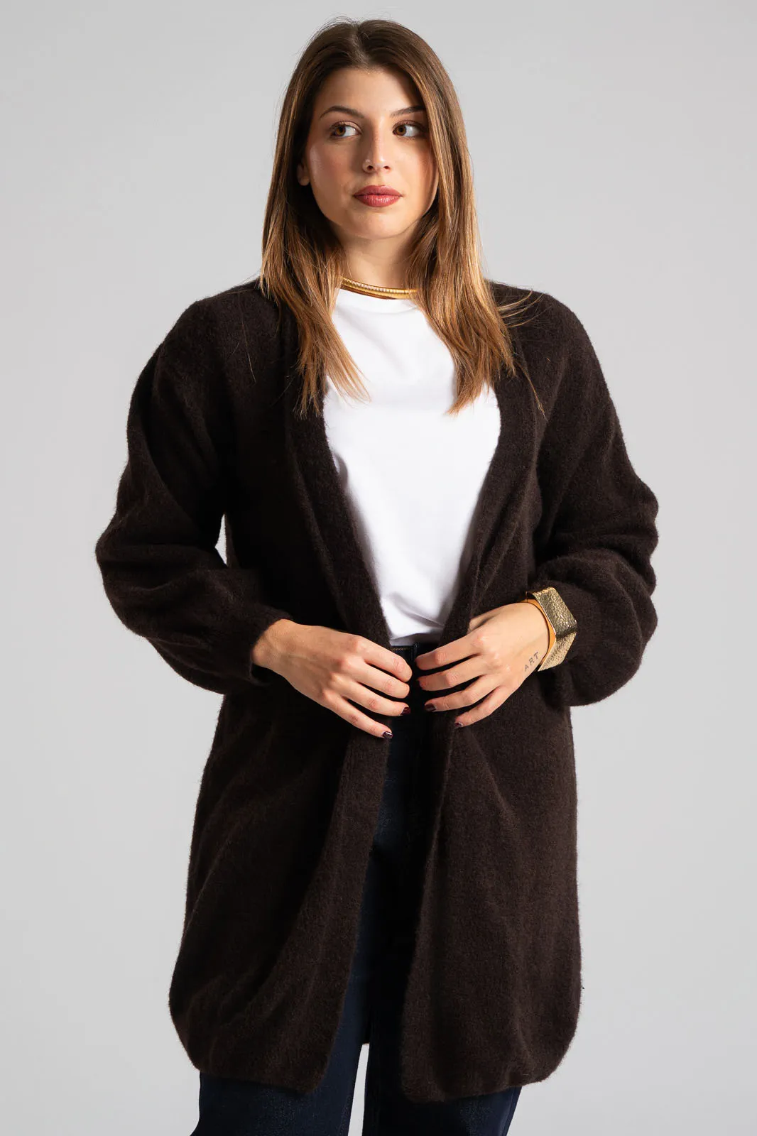 Wool cardigan. It has long sleeves that end with elastic. It has no buttons. The measurement was taken with the palm of the hand open. The measurements in the table are representative for each code. 10% wool, 9% nylon, 29% acrylic, 24% recycled polyester, 10% alpaca, 14% polyester, 4% spandex.