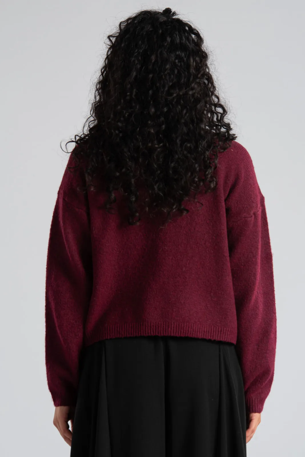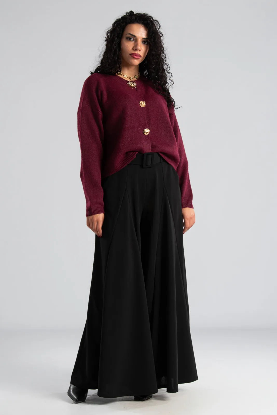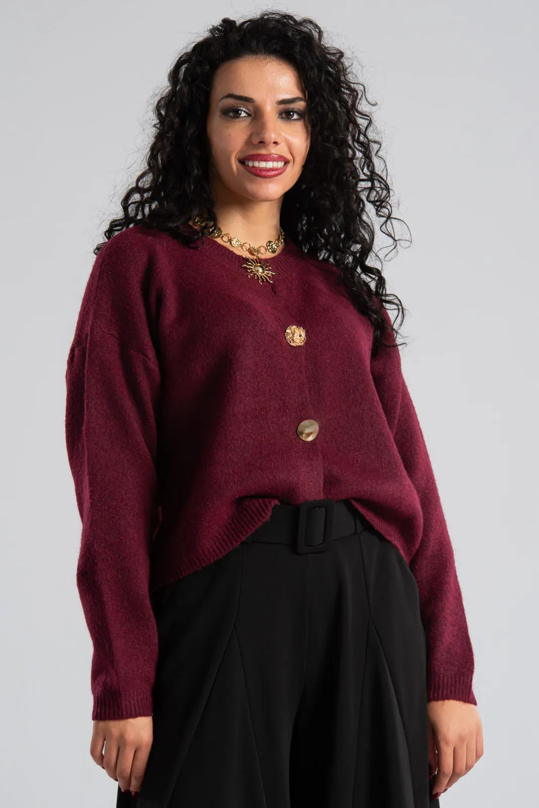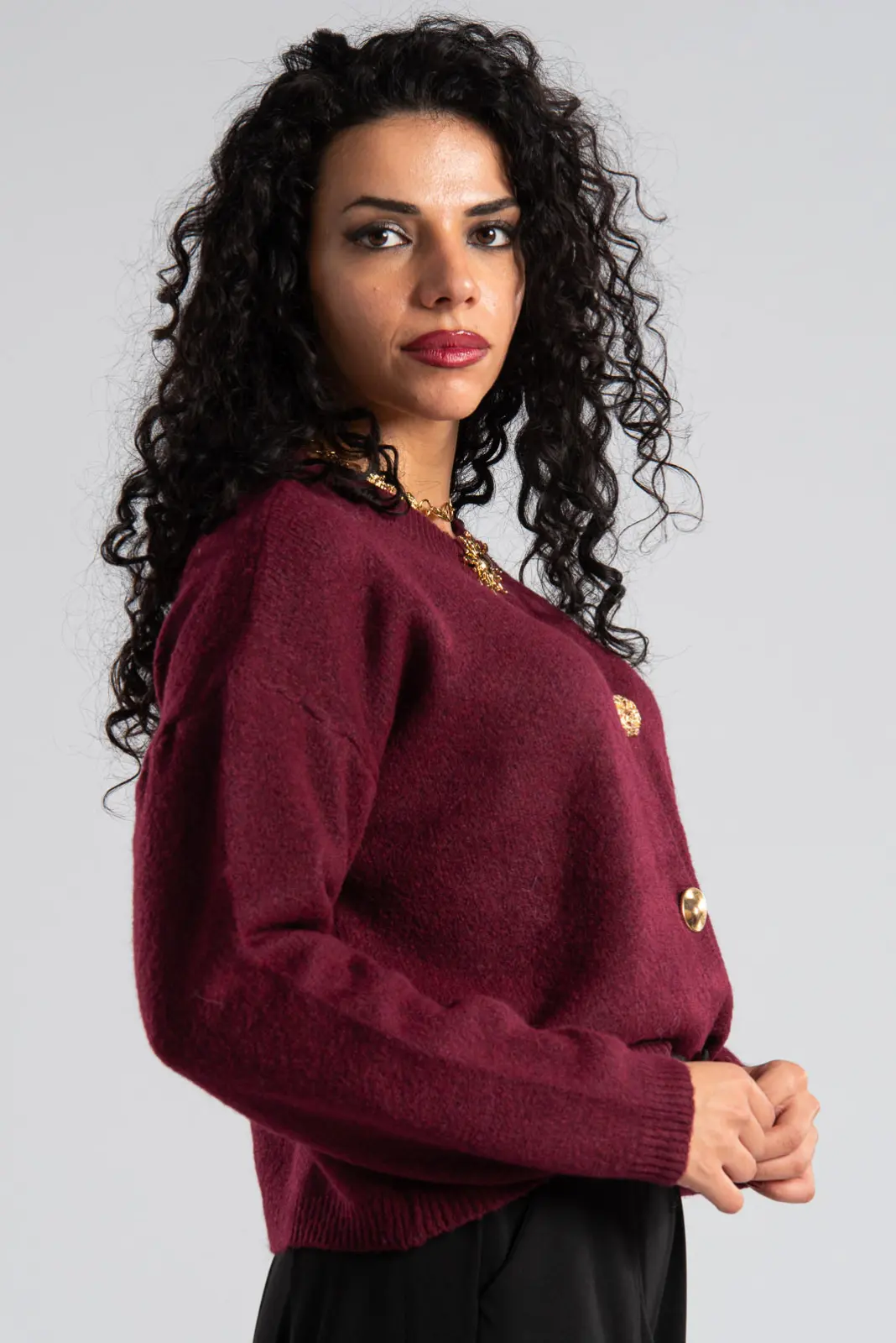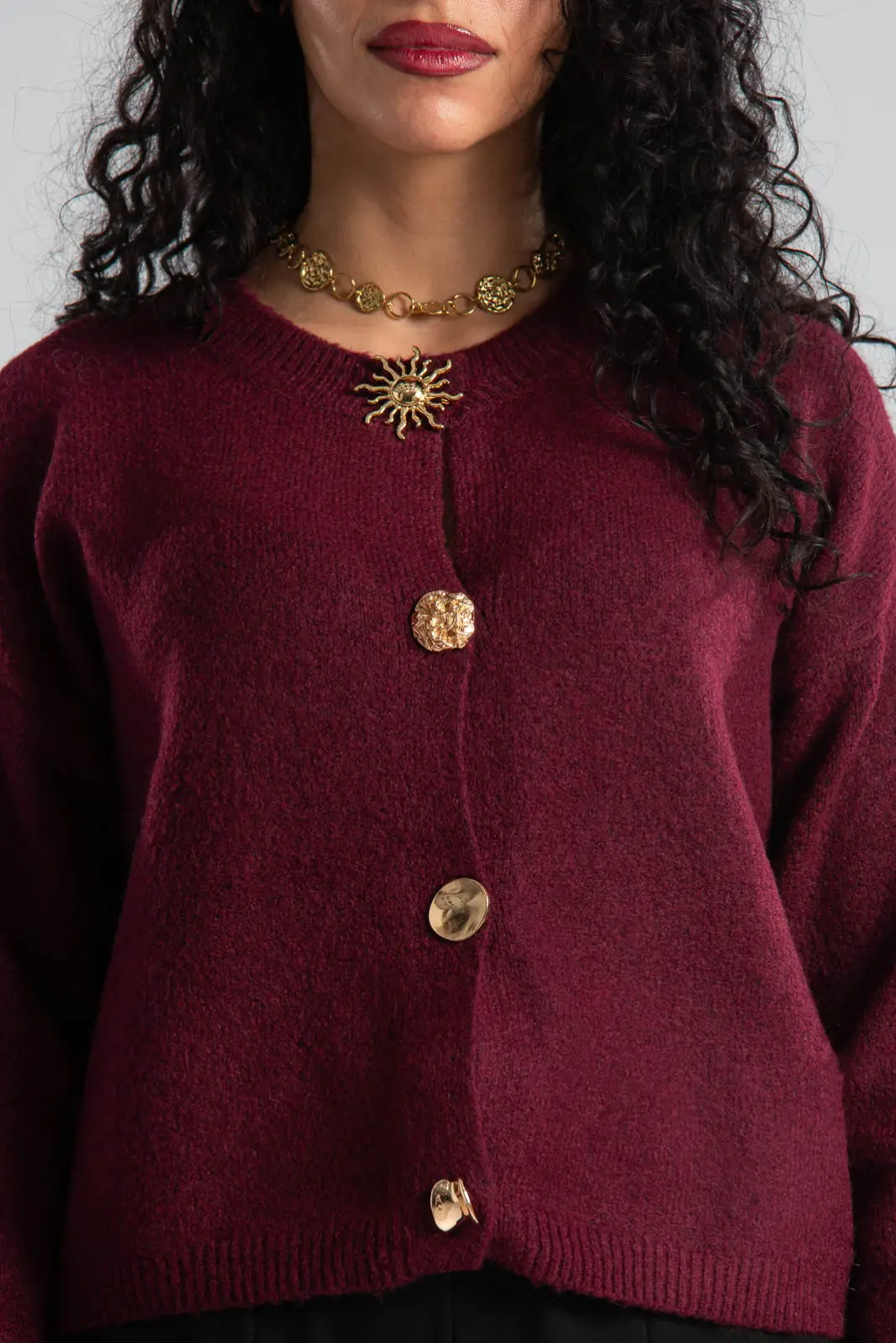 Thick knit cardigan with a compact weave. It features a mandarin collar and long sleeves. It fastens with metal buttons in various designs. The first button has a decorative removable pin. The measurements in the table are representative for each product. 48% polyester, 40% viscose, 10% wool, 2% elastane.
