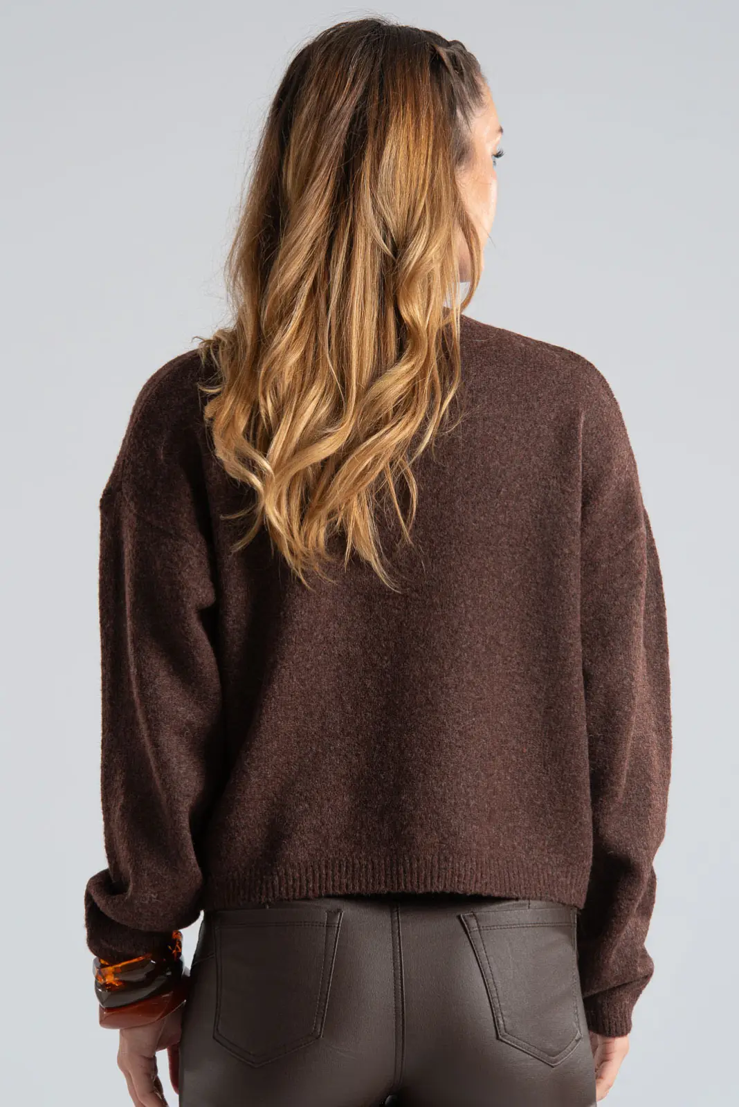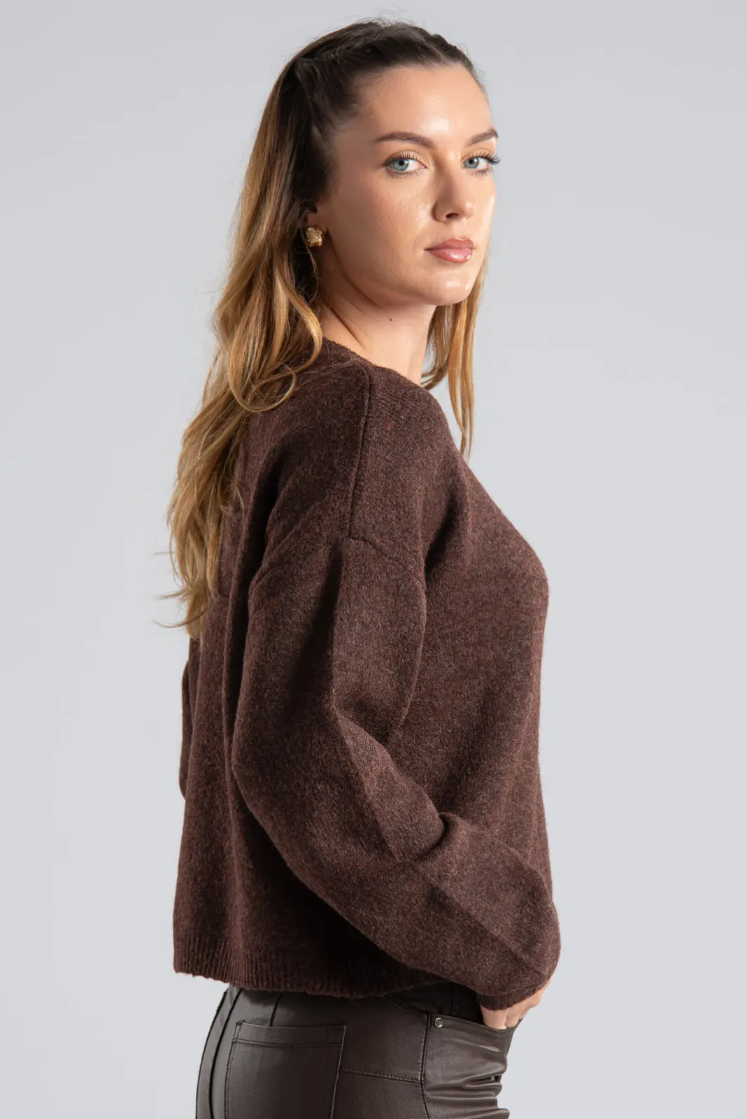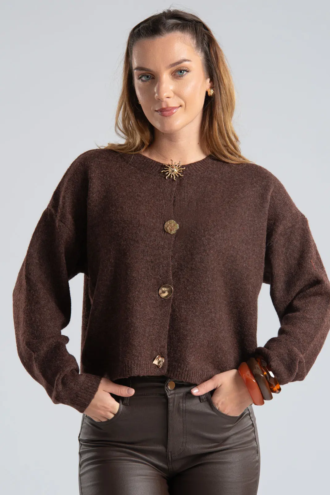 Thick knit cardigan with a compact weave. It features a mandarin collar and long sleeves. It fastens with metal buttons in various designs. The first button has a decorative removable pin. The measurements in the table are representative for each product. 48% polyester, 40% viscose, 10% wool, 2% elastane.