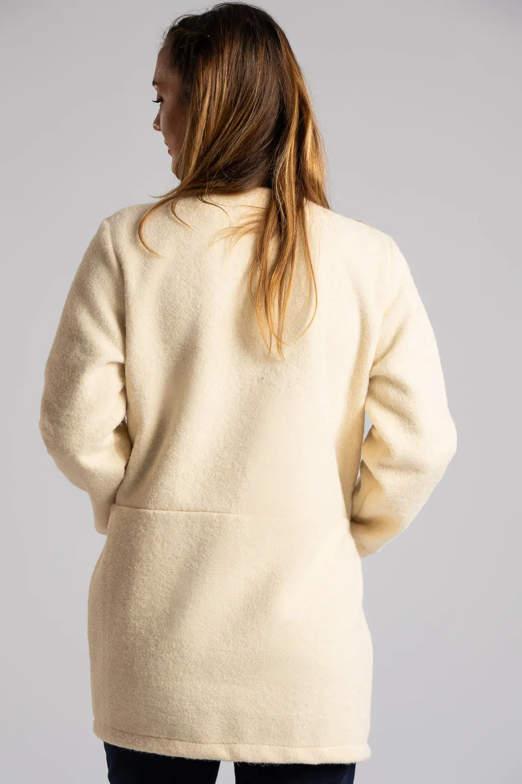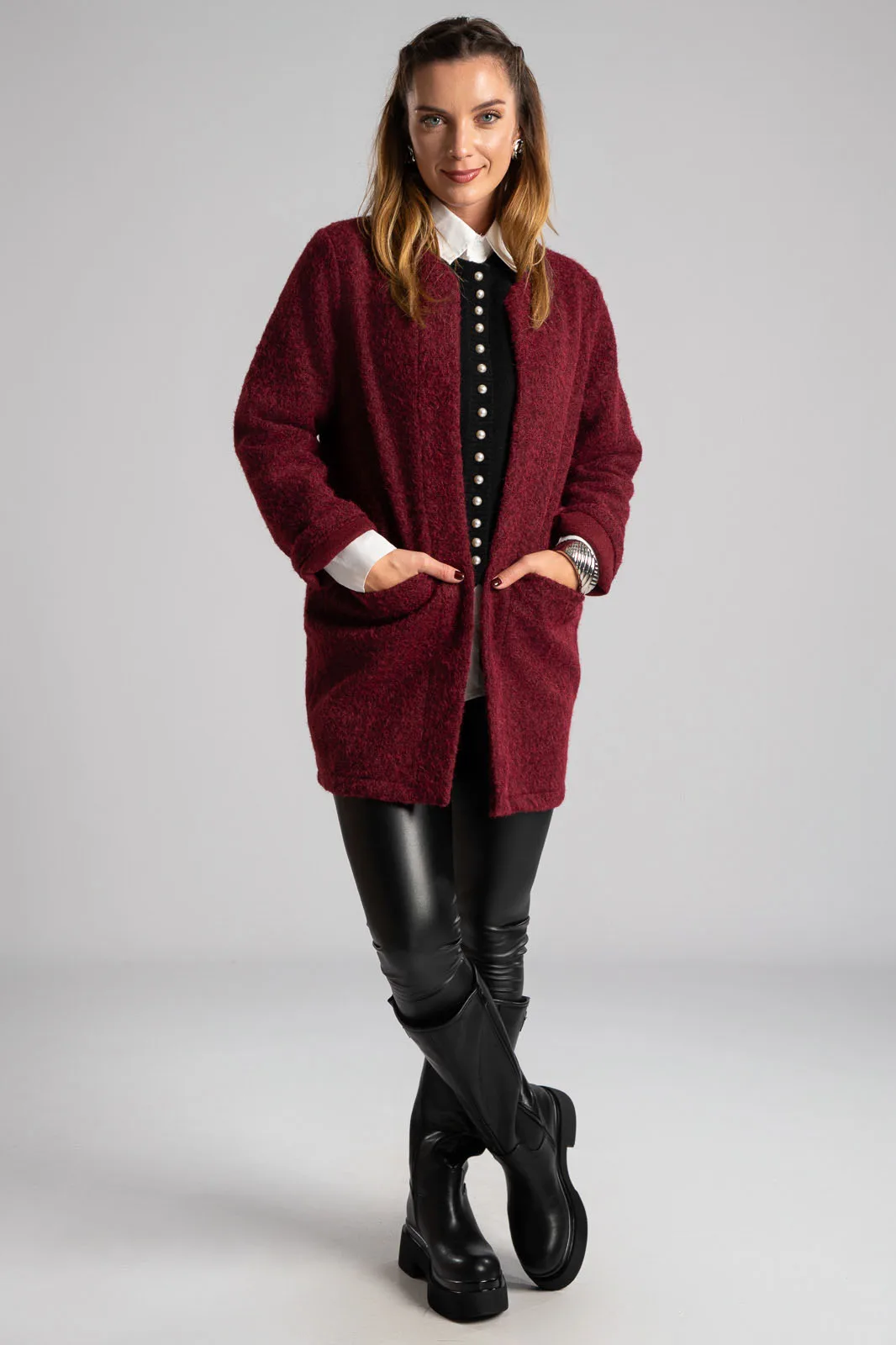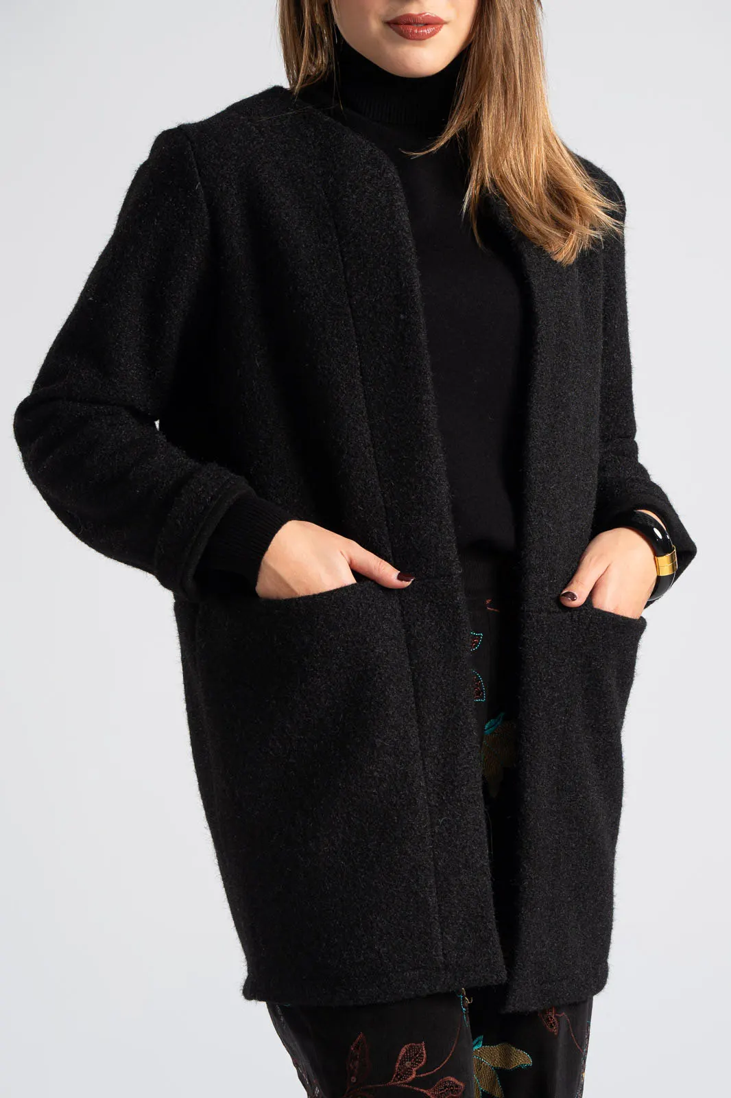 Jacket with mandarin collar. It has long sleeves. It has a fluffy texture and appearance throughout. It has pockets on the front with satin lining inside. It does not have buttons. The measurement was taken with the palm of the hand open. The measurements in the table are representative of each product. 100% polyester.