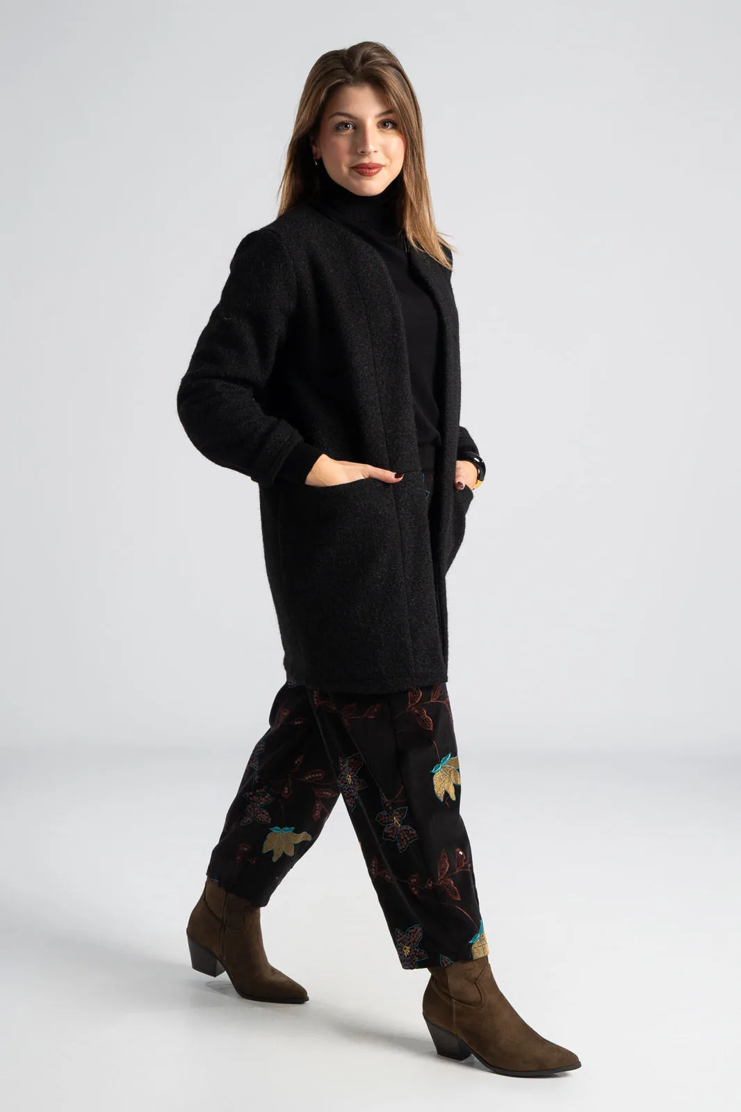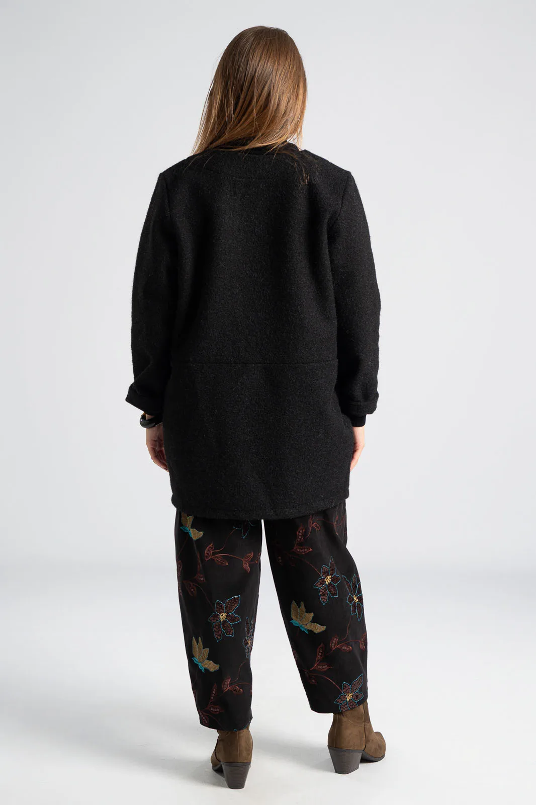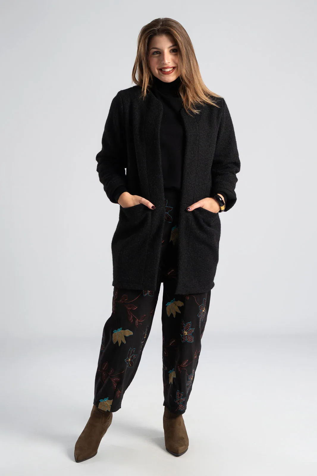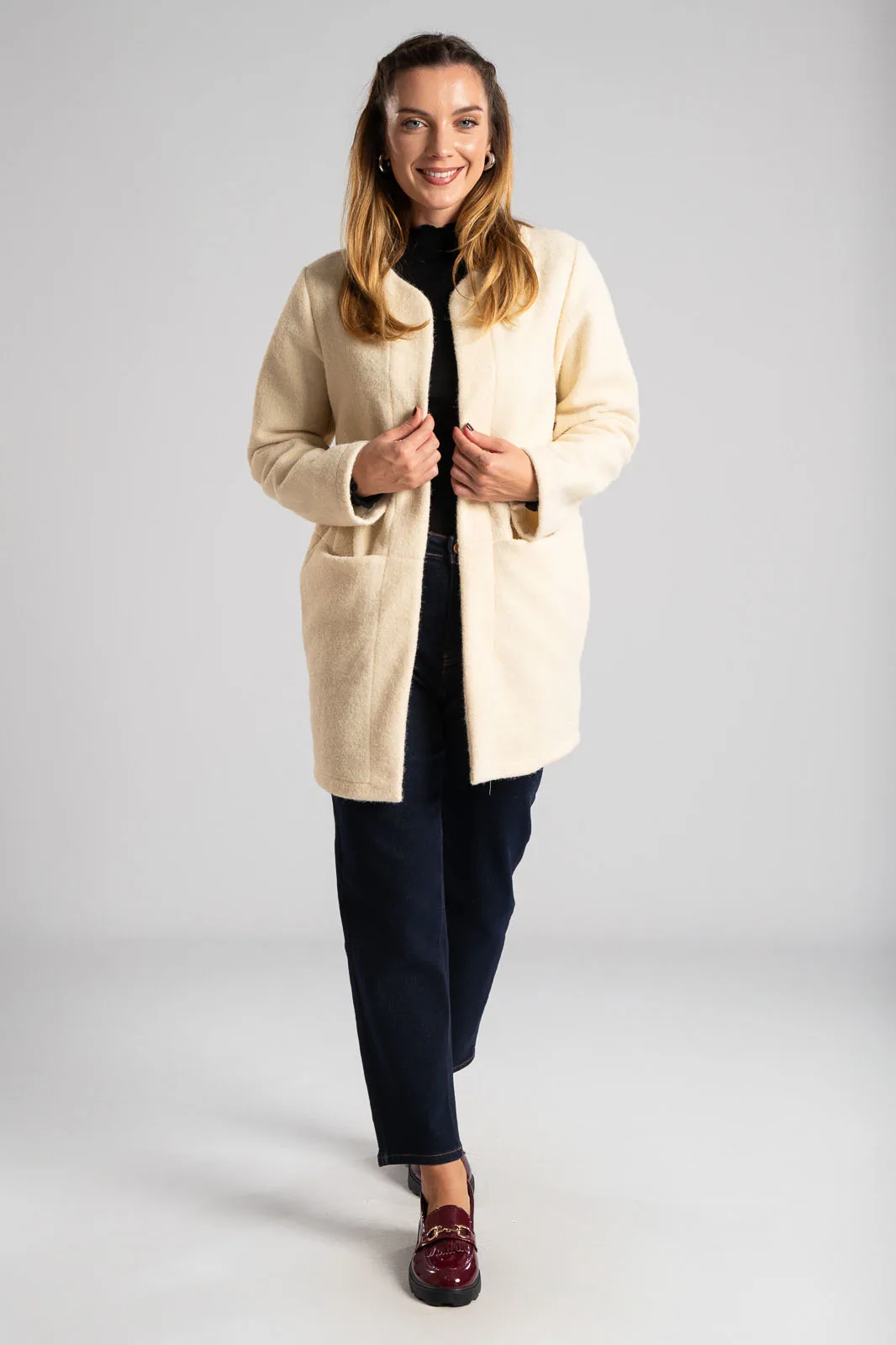 Jacket with mandarin collar. It has long sleeves. It has a fluffy texture and appearance throughout. It has pockets on the front with satin lining inside. It does not have buttons. The measurement was taken with the palm of the hand open. The measurements in the table are representative of each product. 100% polyester.