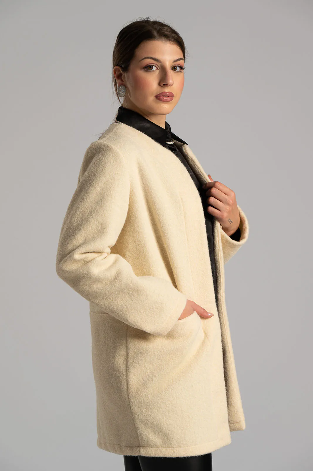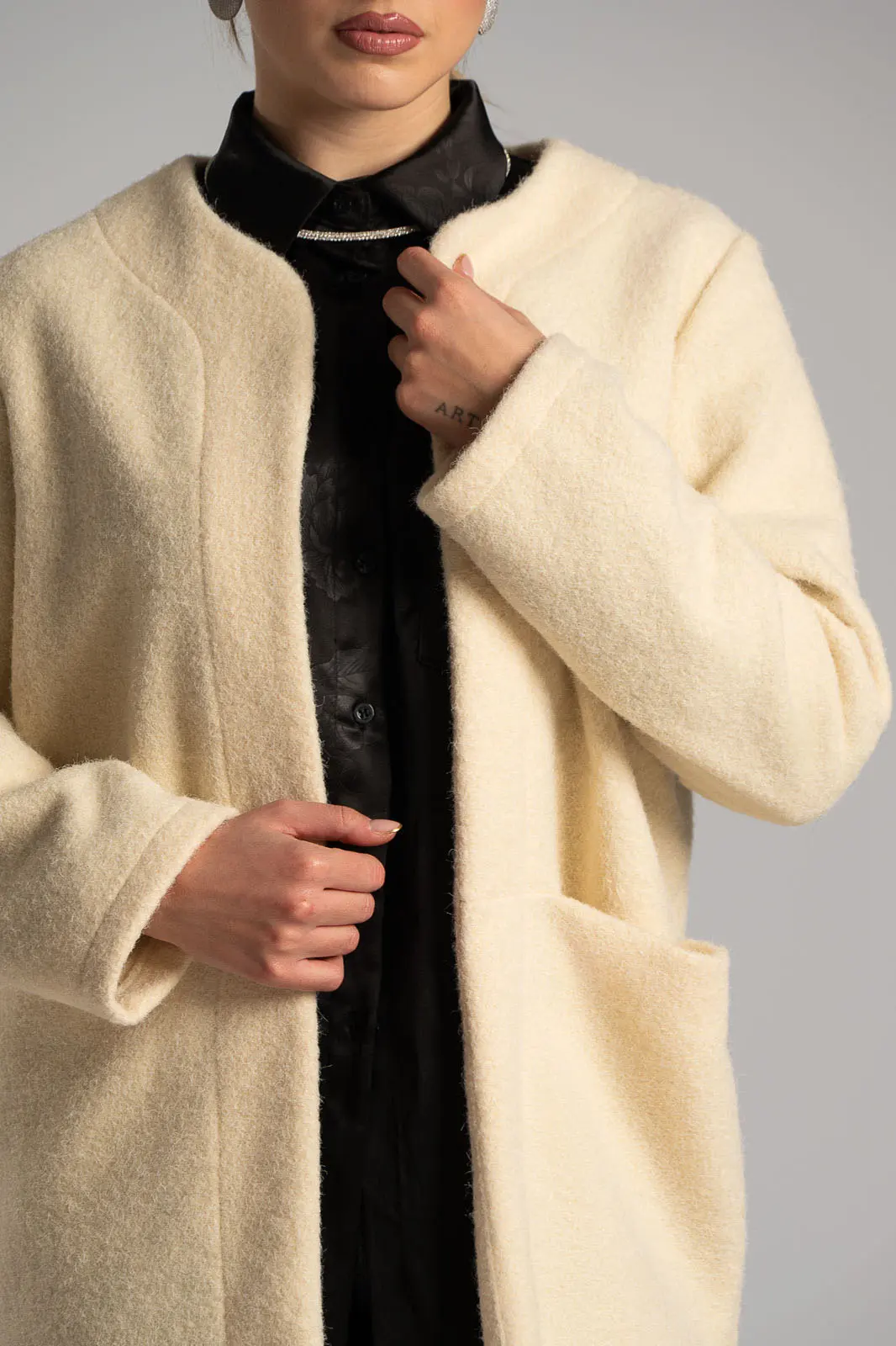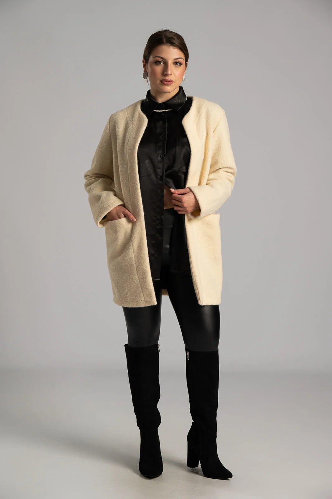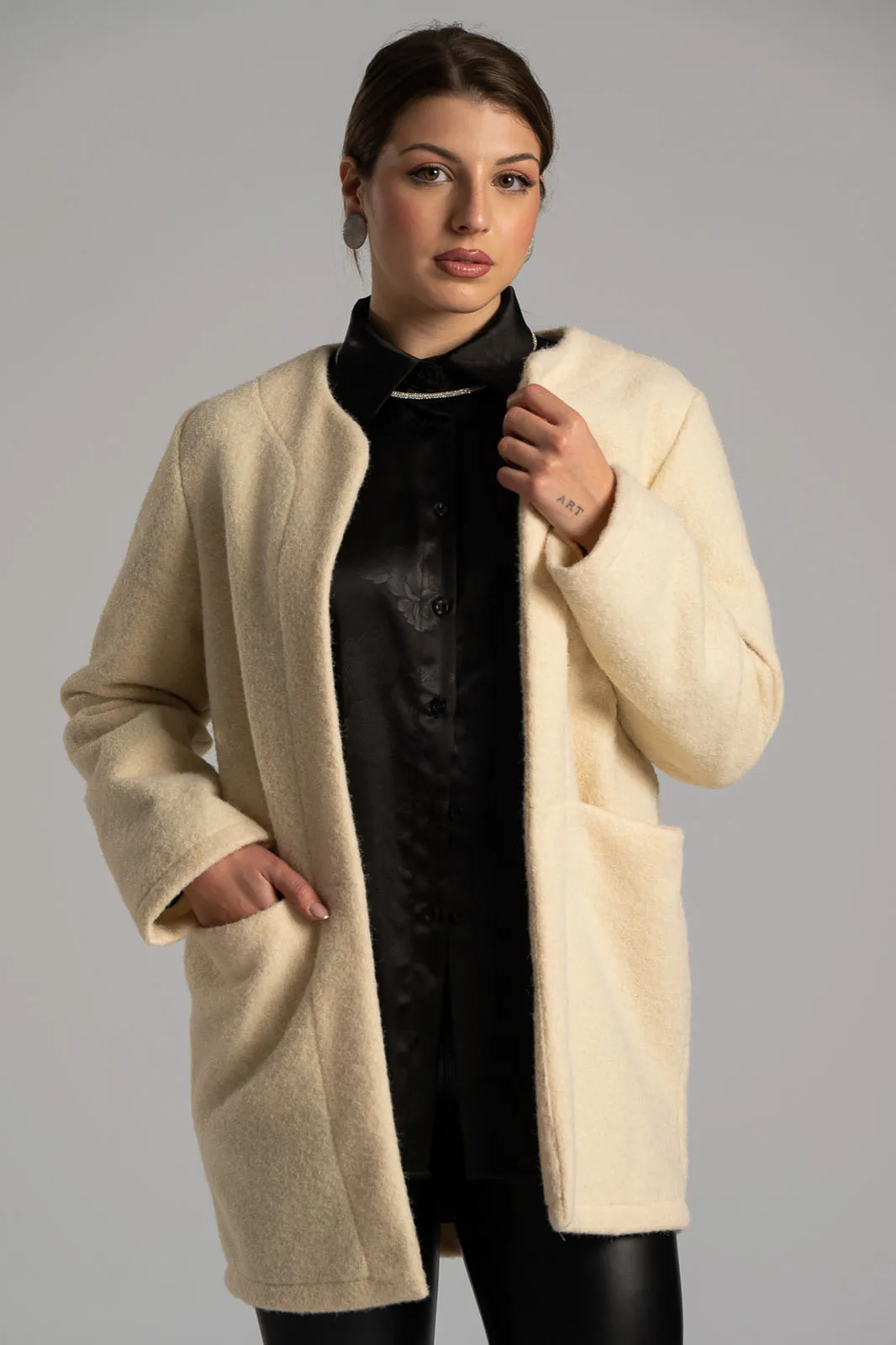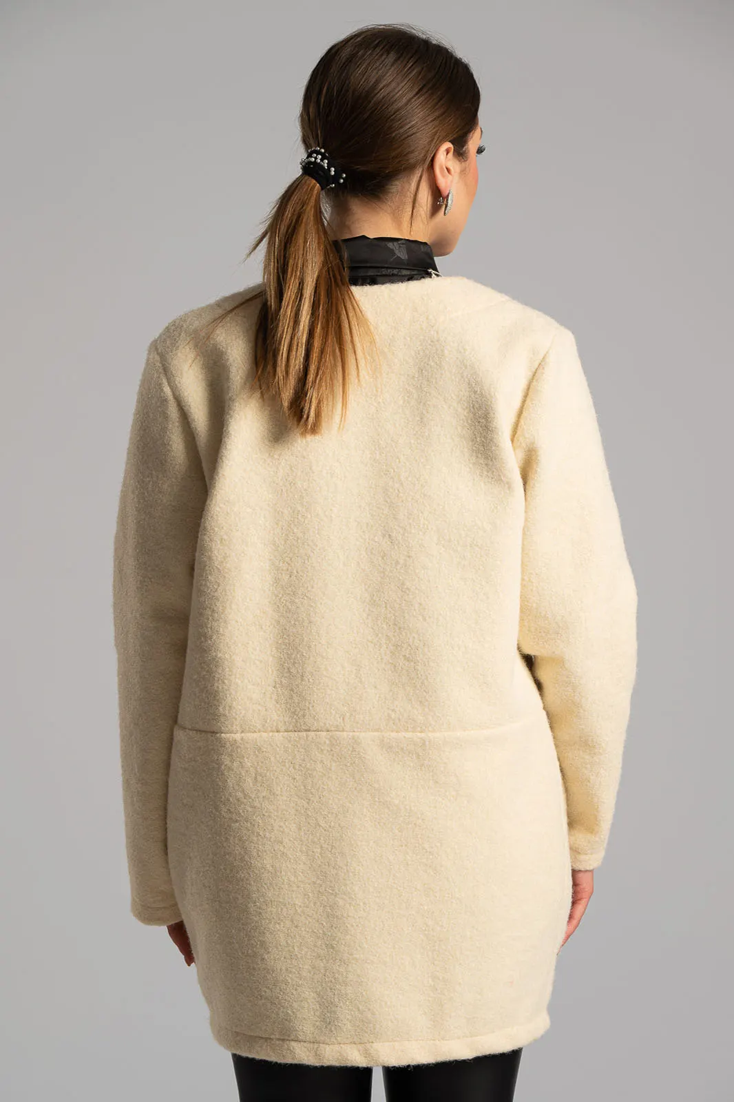 Ζακέτα με mao γιακά. Διαθέτει μακριά μανίκια. Σε όλη την επιφάνεια έχει χνουδωτή υφή και όψη. Στο μπροστινό μέρος έχει τσέπες που εσωτερικά έχουν σατέν φόδρα. Δεν διαθέτει κουμπί. Η μέτρηση έχει γίνει με το άνοιγμα μιας παλάμης. Οι μετρήσεις του πίνακα είναι αντιπροσωπευτικές για κάθε προϊόν. 100% polyester.