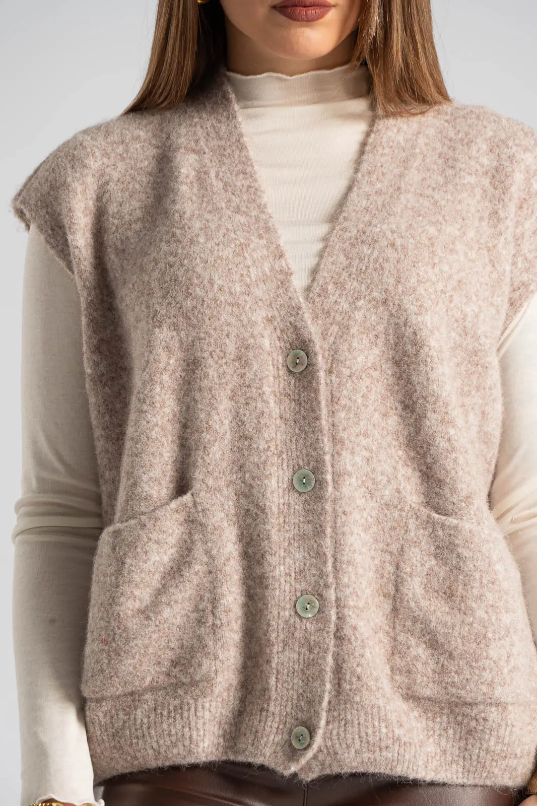Cardigan with very short sleeves and a V-neck. It features a dense melange knit. It fastens with buttons. Measurements taken with buttons fastened. Comfortable fit. The measurements in the table are representative of each code. 29% acrylic, 9% nylon, 10% alpaca, 10% wool, 24% recycled polyester, 14% polyester, 4% spandex.