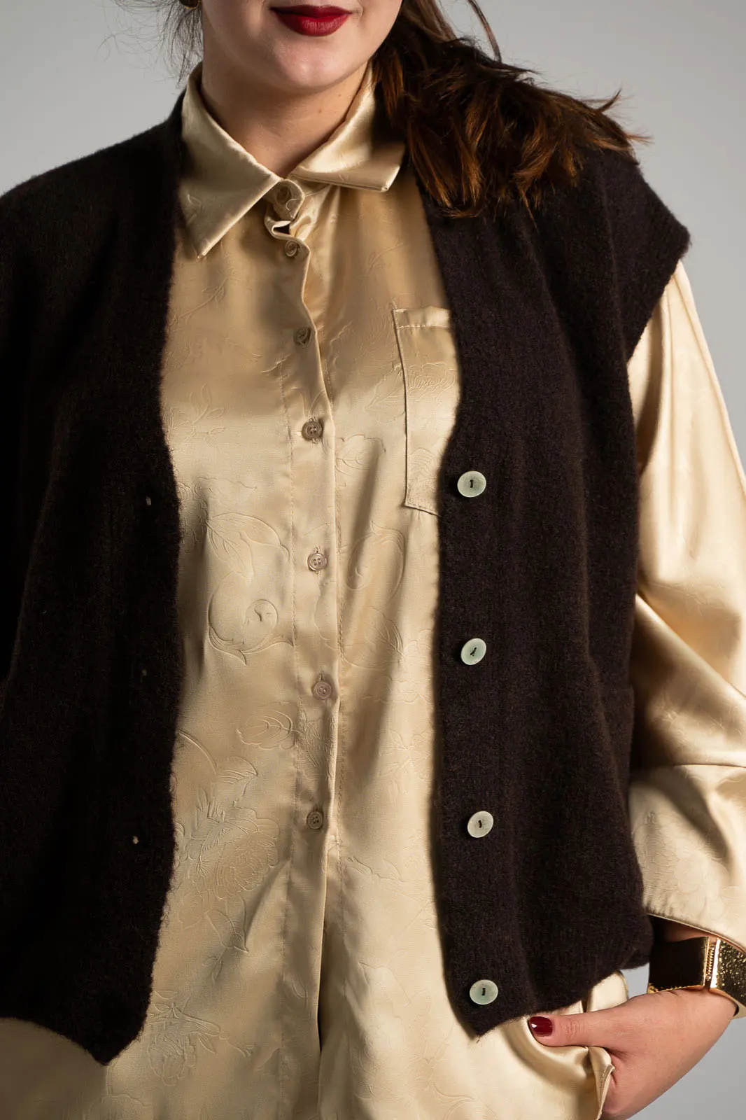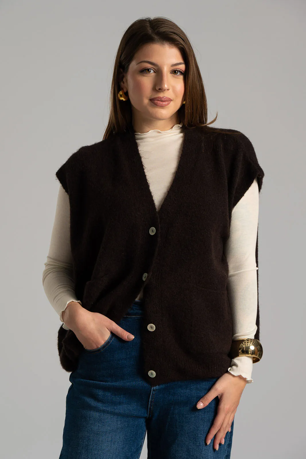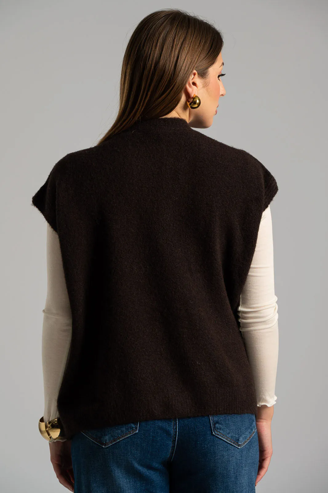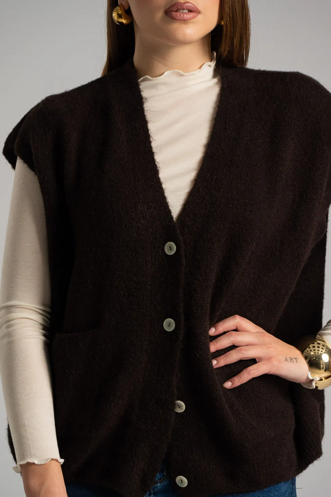 Cardigan with very short sleeves and a V-neck. It features a dense melange knit. It fastens with buttons. Measurements taken with buttons fastened. Comfortable fit. The measurements in the table are representative of each code. 29% acrylic, 9% nylon, 10% alpaca, 10% wool, 24% recycled polyester, 14% polyester, 4% spandex.