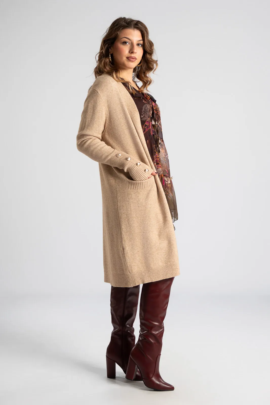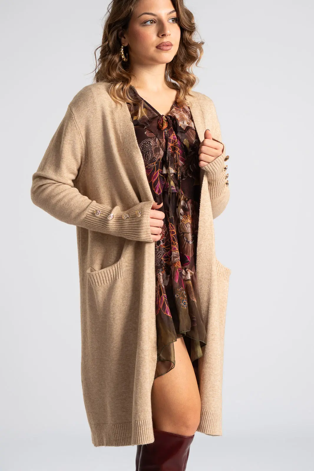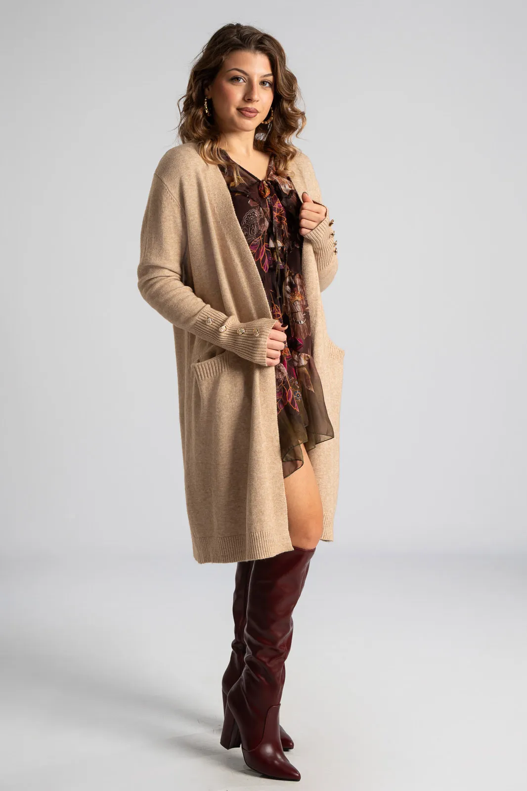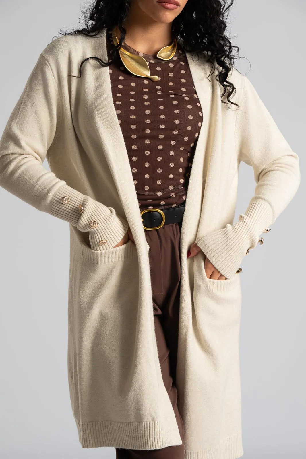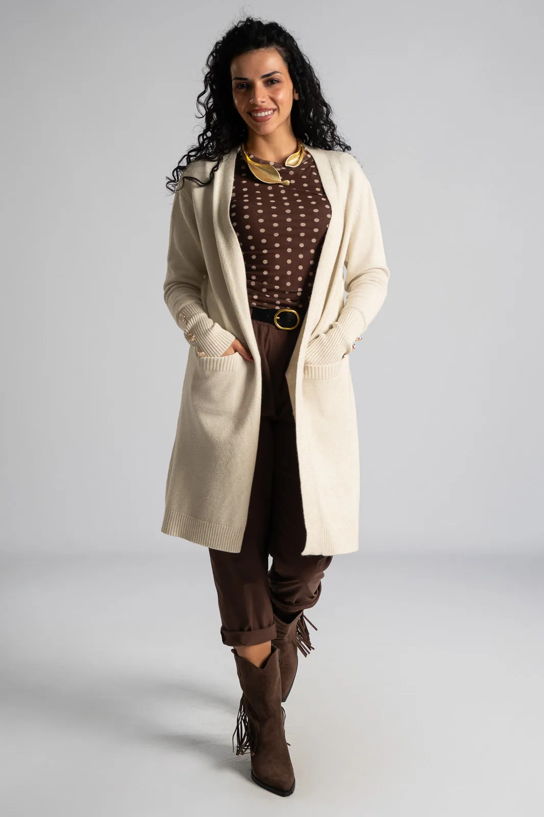 Ζακέτα με συμπαγή νημάτινη πλέξη. Έχει μακριά μανίκια που καταλήγουν σε διακοσμητικά μεταλλικά κουμπιά. Στο μπροστινό μέρος έχει τσέπες. Η μέτρηση έχει γίνει με το άνοιγμα μιας παλάμης. 30% polyamide, 30% viscose, 20% modal, 20% elastan.