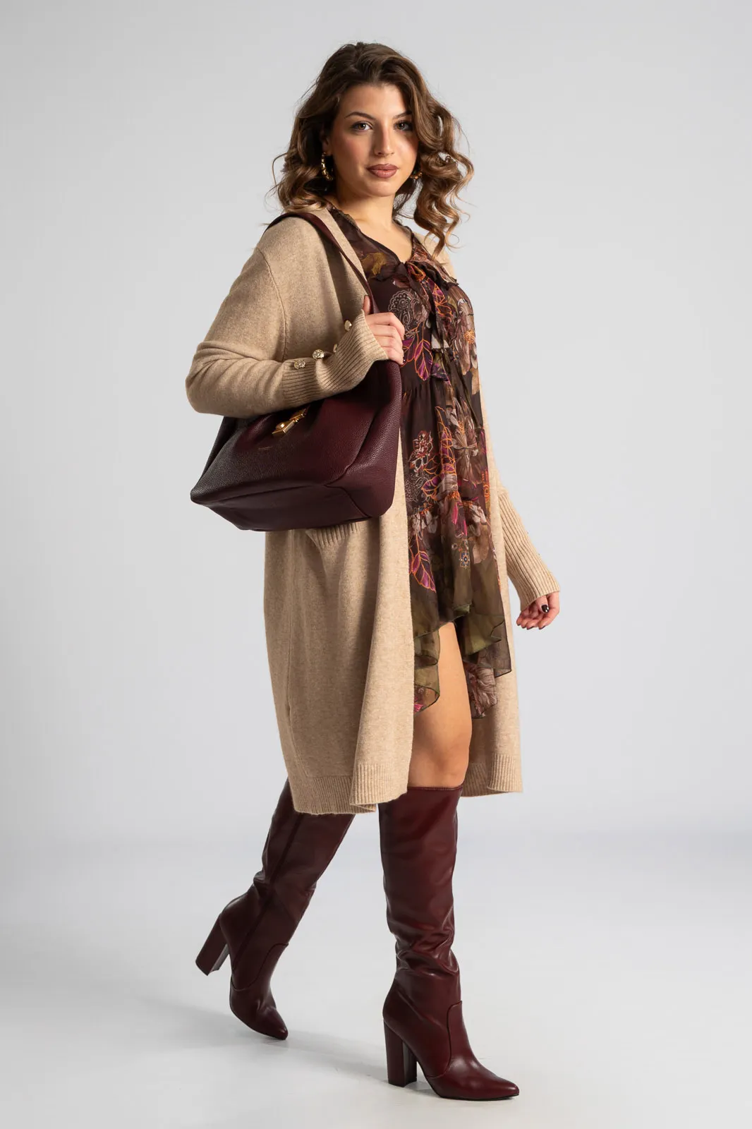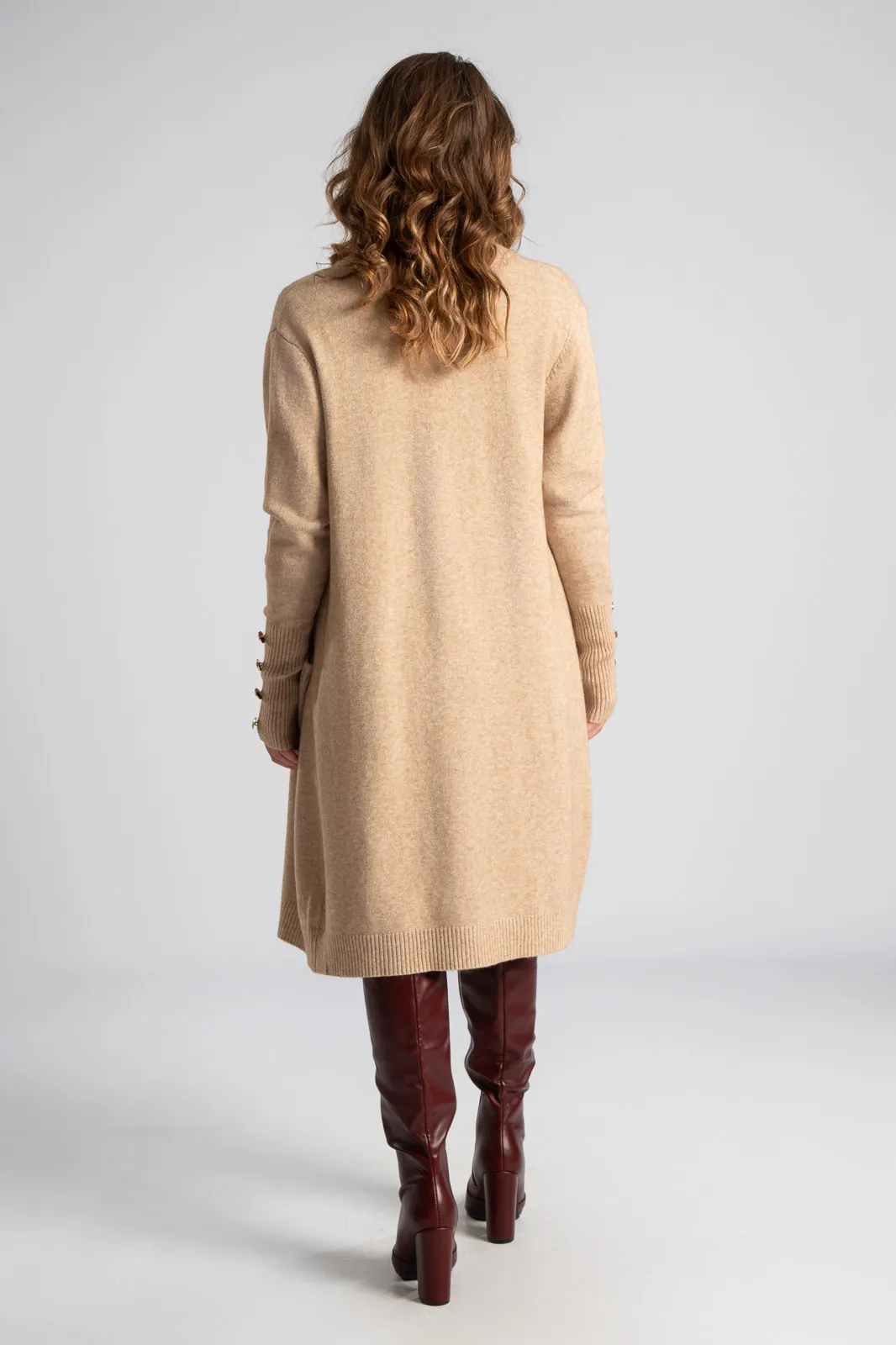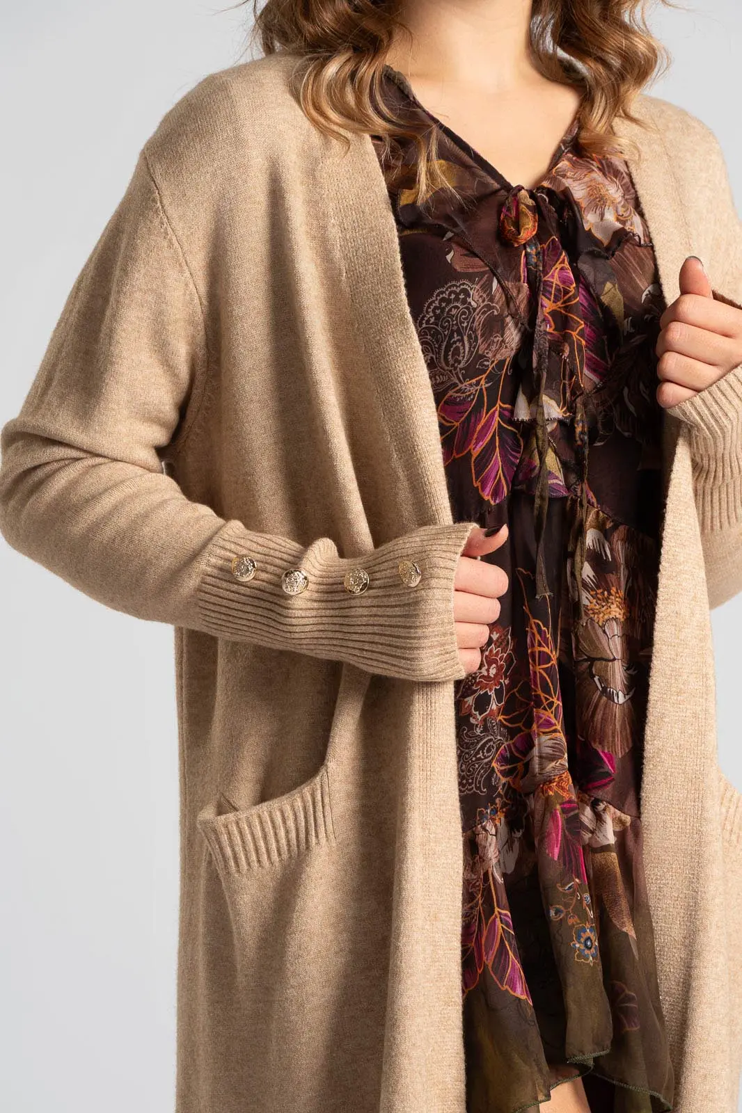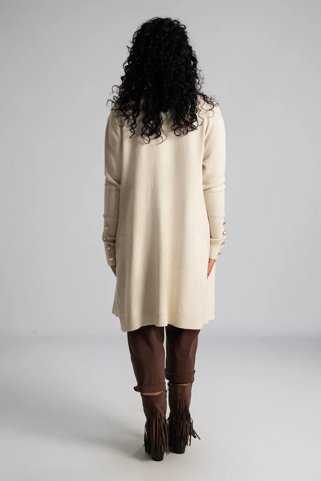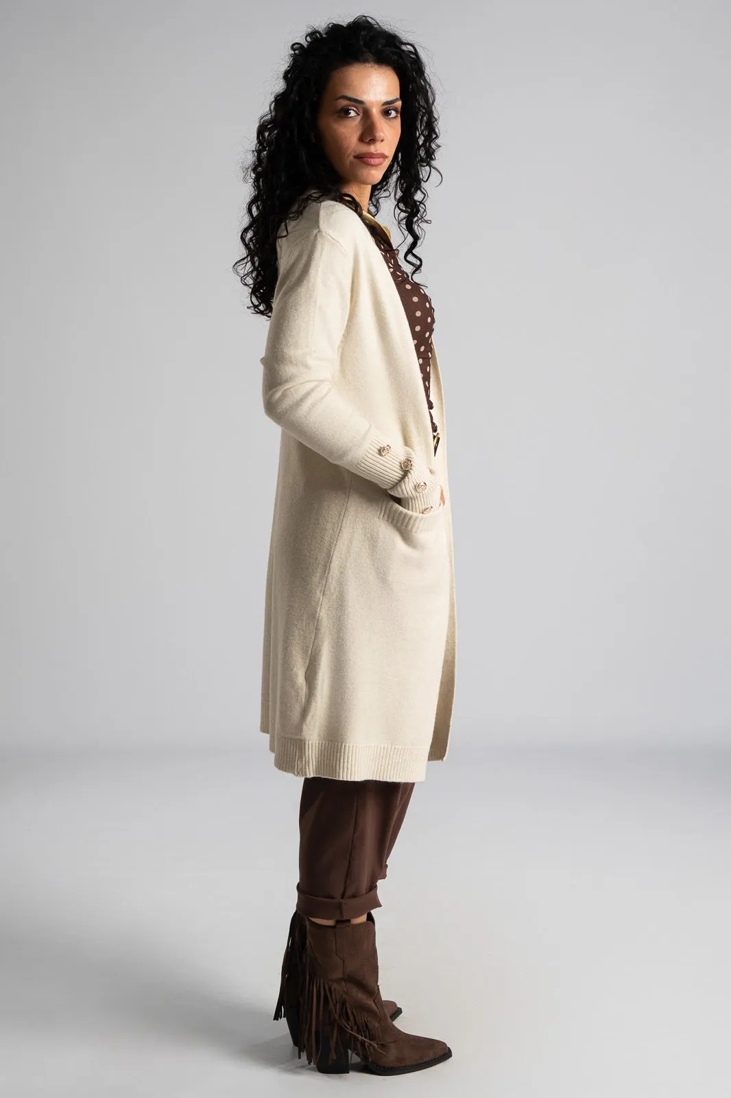 Ζακέτα με συμπαγή νημάτινη πλέξη. Έχει μακριά μανίκια που καταλήγουν σε διακοσμητικά μεταλλικά κουμπιά. Στο μπροστινό μέρος έχει τσέπες. Η μέτρηση έχει γίνει με το άνοιγμα μιας παλάμης. 30% polyamide, 30% viscose, 20% modal, 20% elastan.