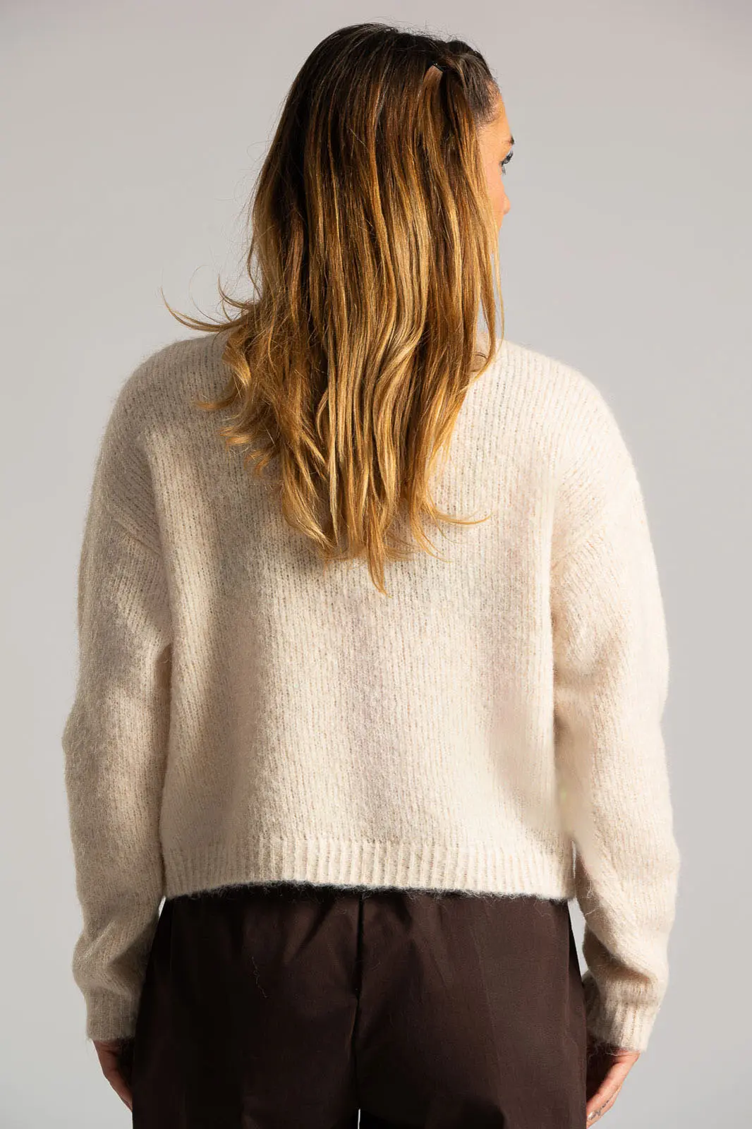 Cardigan with yarn knitting. It has a round neckline. It has long sleeves. It closes with buttons that are decorated with tulle bows and sequins sewn all over its surface. The measurements in the table are representative for each code. 40% polyester, 38% wool, 20% polyamide, 2% elastane.