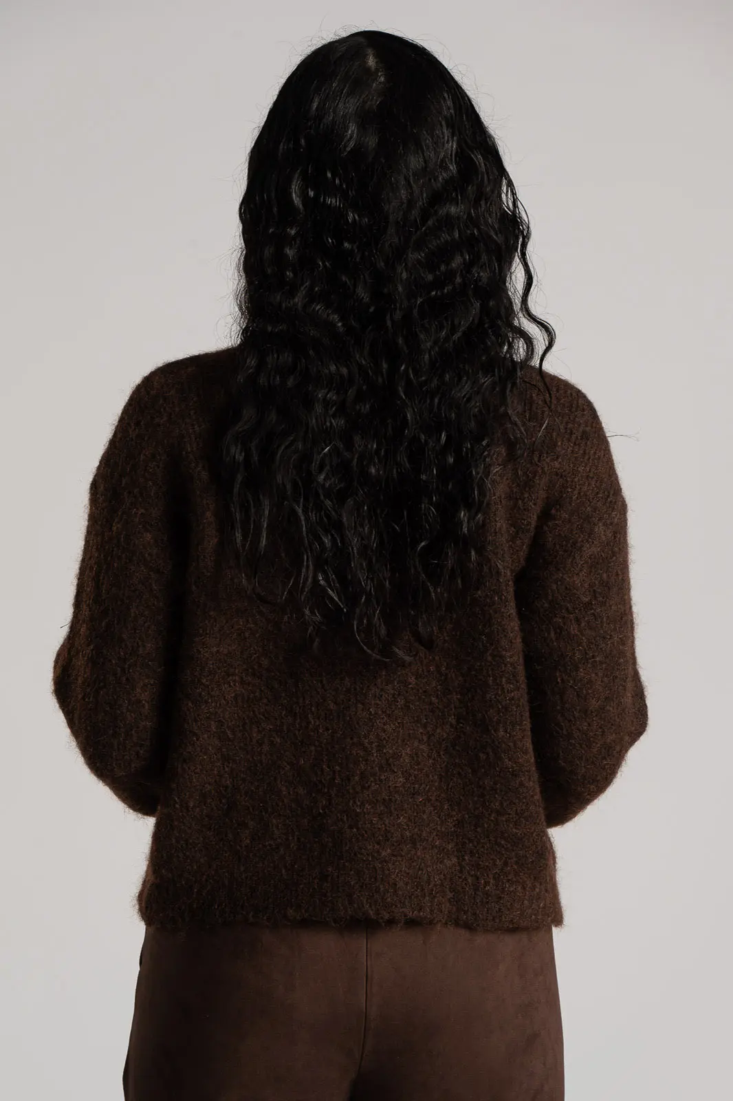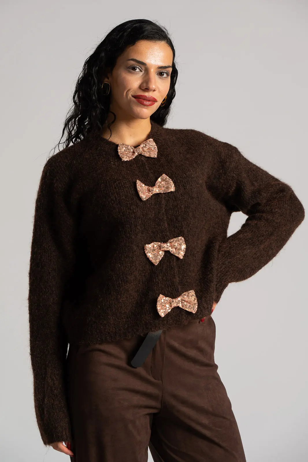 Cardigan with yarn knitting. It has a round neckline. It has long sleeves. It closes with buttons that are decorated with tulle bows and sequins sewn all over its surface. The measurements in the table are representative for each code. 40% polyester, 38% wool, 20% polyamide, 2% elastane.
