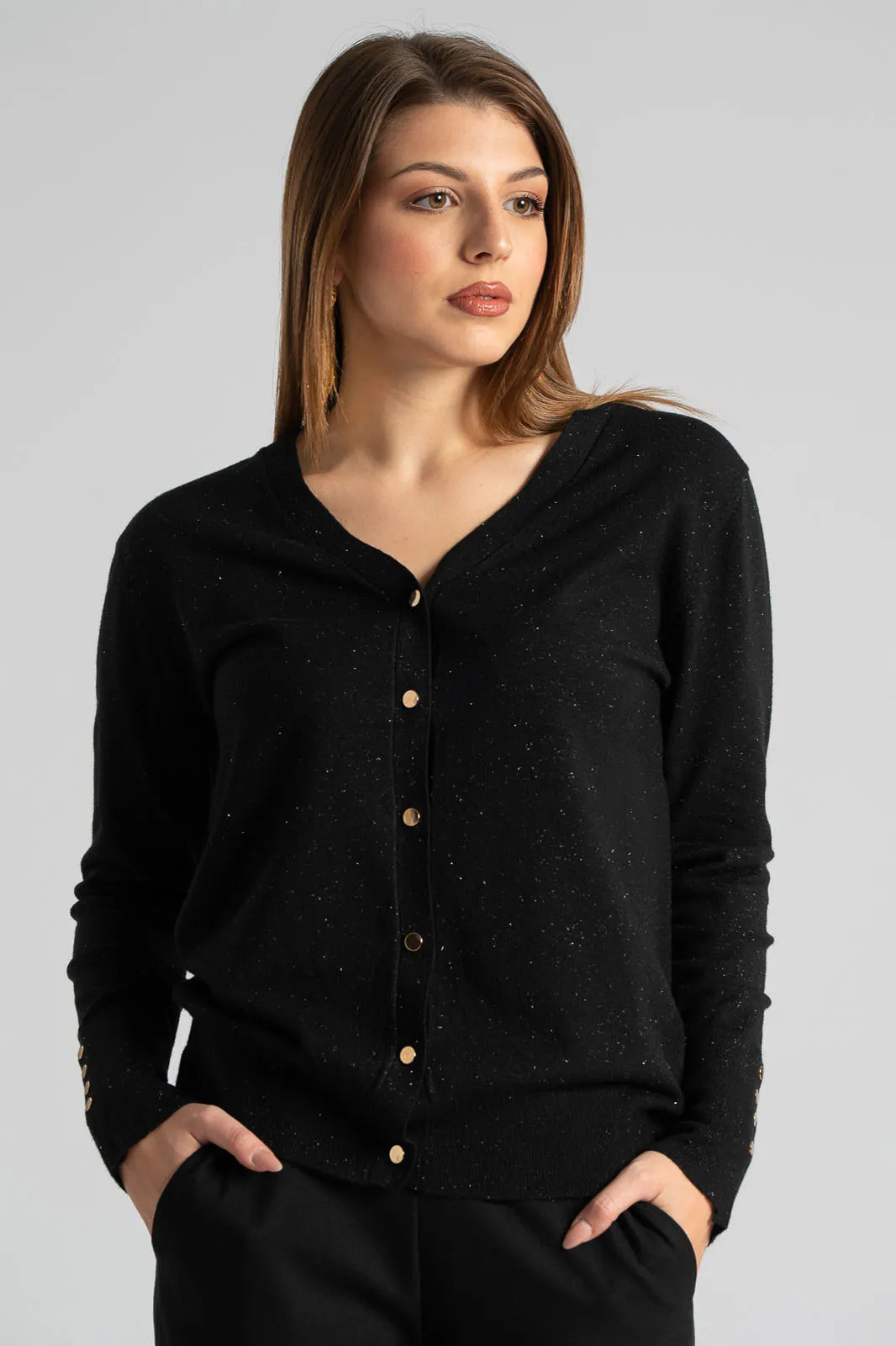Cardigan knitted. It has a V-neck opening and closes with clutch buttons. It has long sleeves and decorative buttons on the sides. Gold thread throughout. Measurements taken with buttons closed. The measurements in the table are representative of each product. 30% polyamide, 30% viscose, 20% modal, 20% elastane.