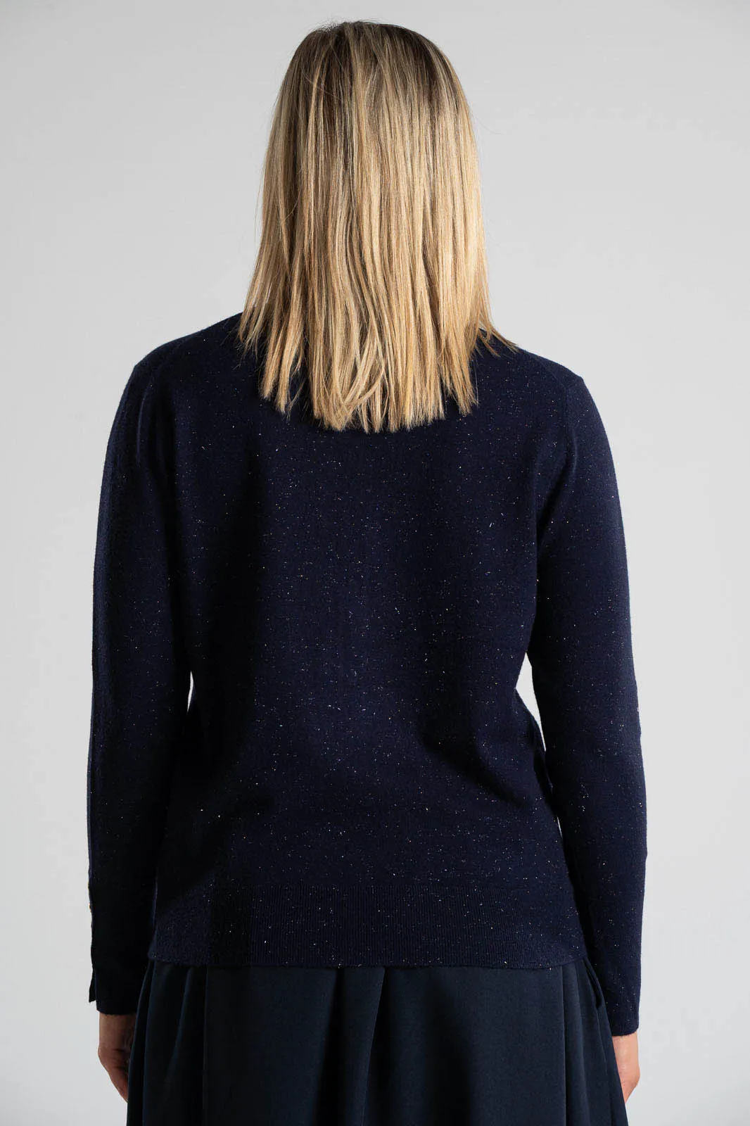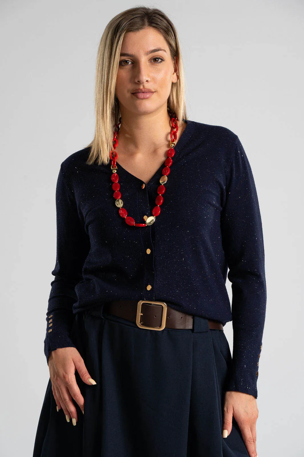 Cardigan knitted. It has a V-neck opening and closes with clutch buttons. It has long sleeves and decorative buttons on the sides. Gold thread throughout. Measurements taken with buttons closed. The measurements in the table are representative of each product. 30% polyamide, 30% viscose, 20% modal, 20% elastane.