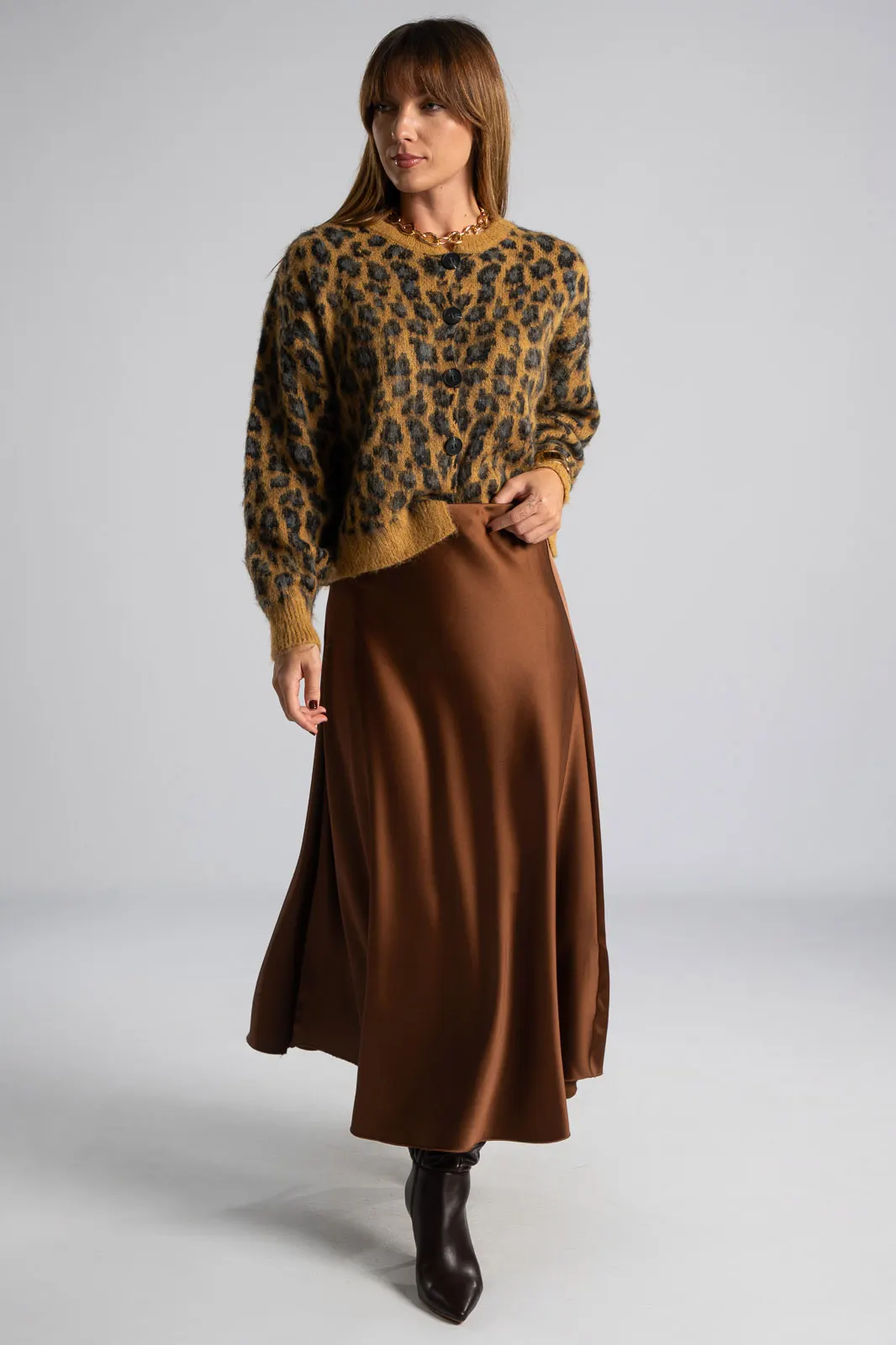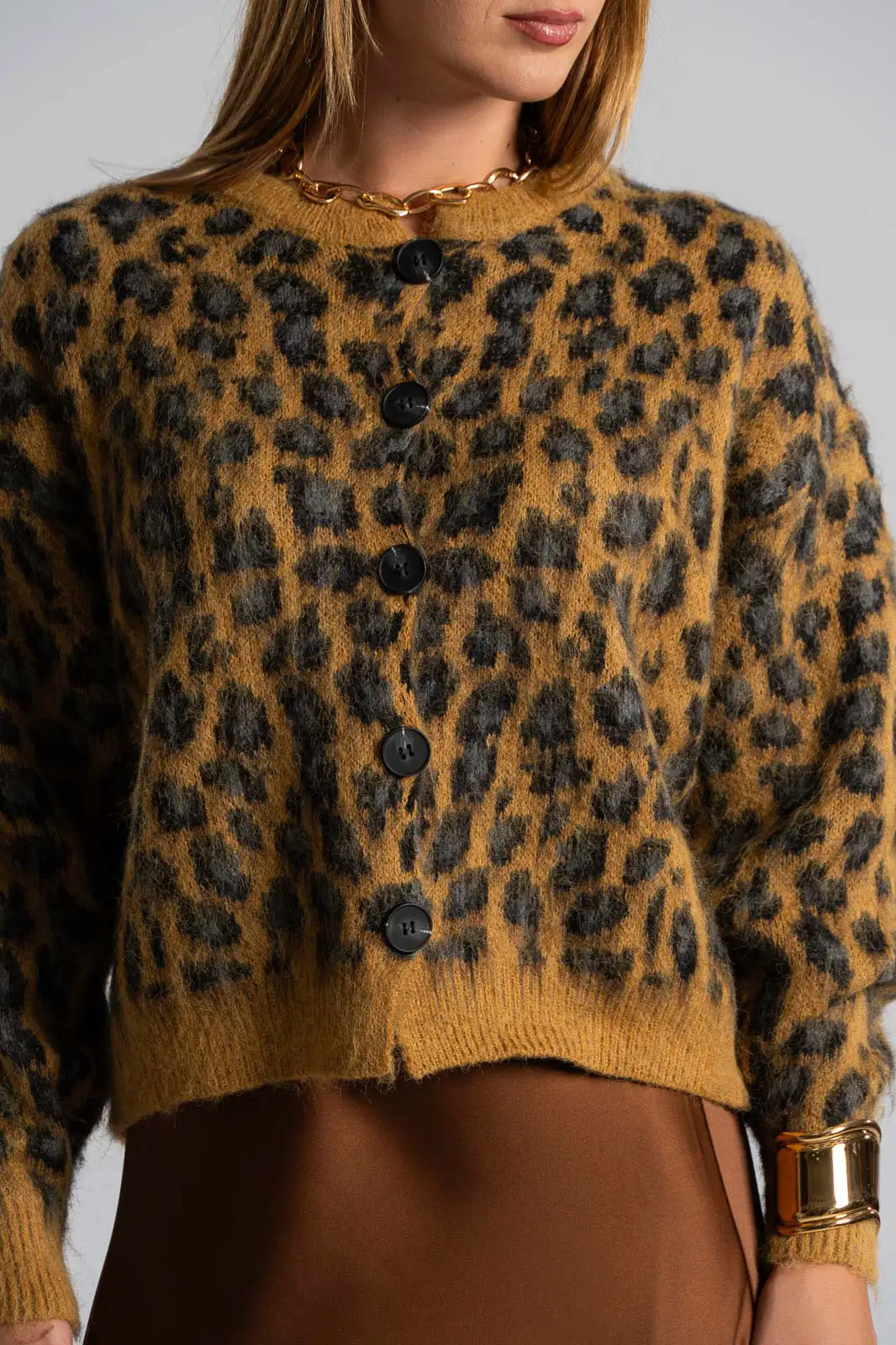 Jacket with compact knitted fabric. It has leopard print all over. It has long sleeves and a straight cut. Ribbed knit at the hem, neckline, and cuffs. The measurements in the table are representative for each code. 50% viscose, 30% wool, 20% polyester.