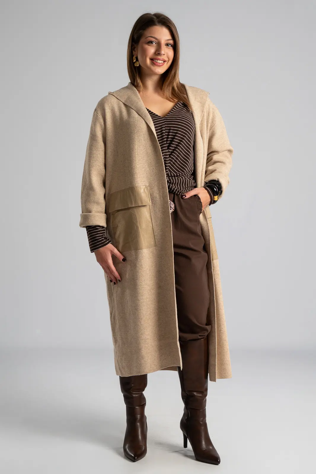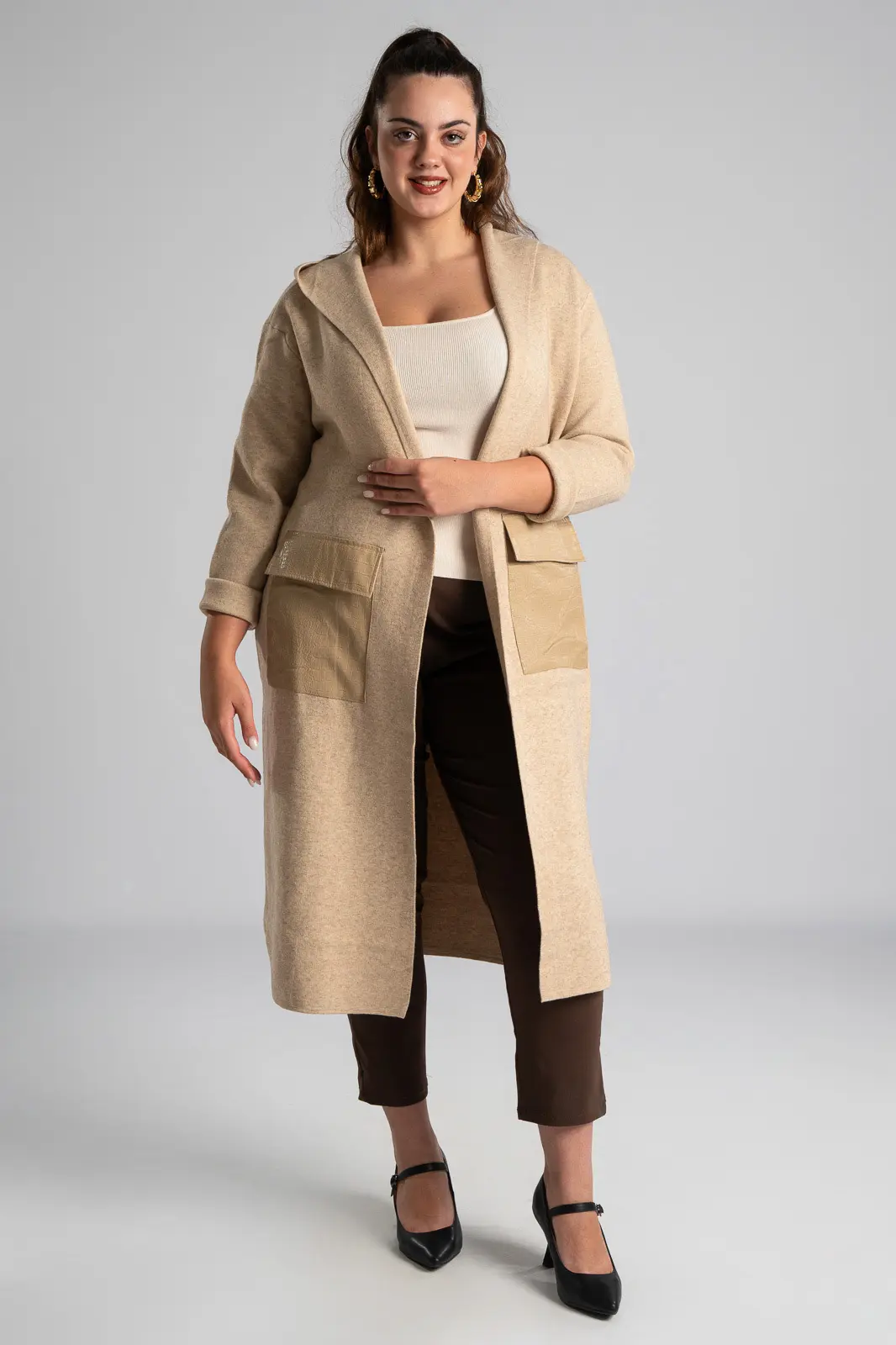 Midi jacket with compact knit fabric. It has a fixed hood and long sleeves. The front has flap pockets with a leatherette texture and crocodile effect. It has a comfortable fit. The measurement was taken with the palm of the hand open. The measurements in the table are representative for each code. 40% polyamide, 20% viscose, 10% polyester, 20% modal, 10% elastane.