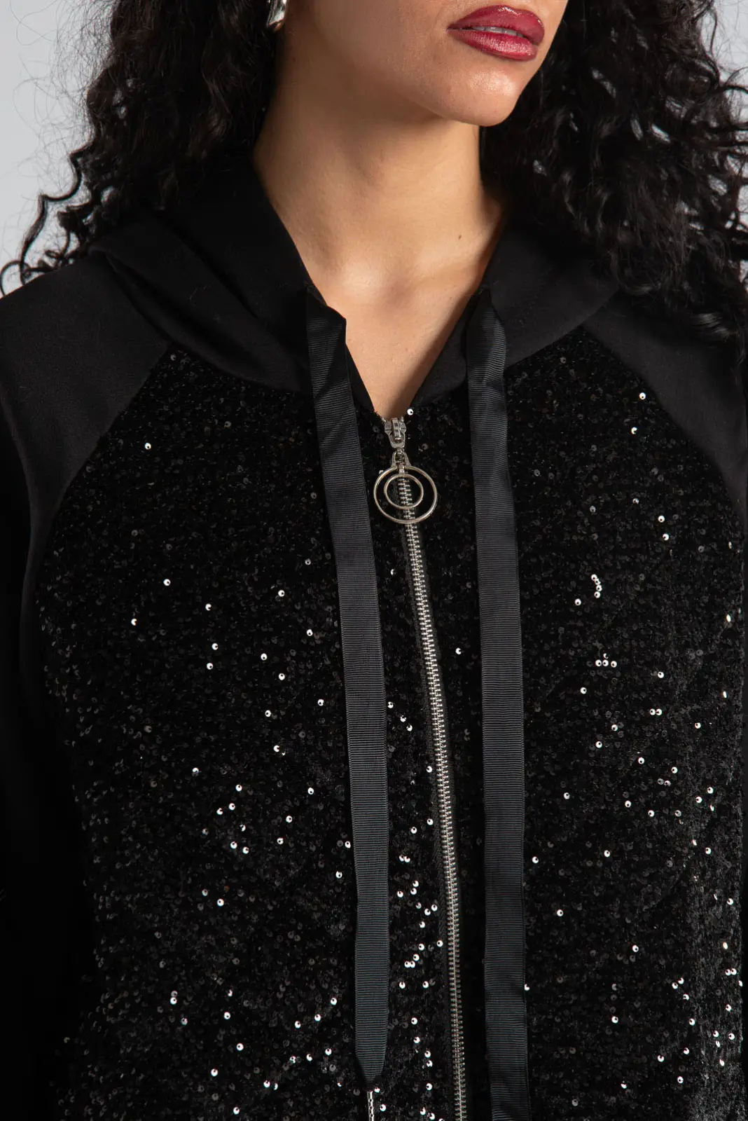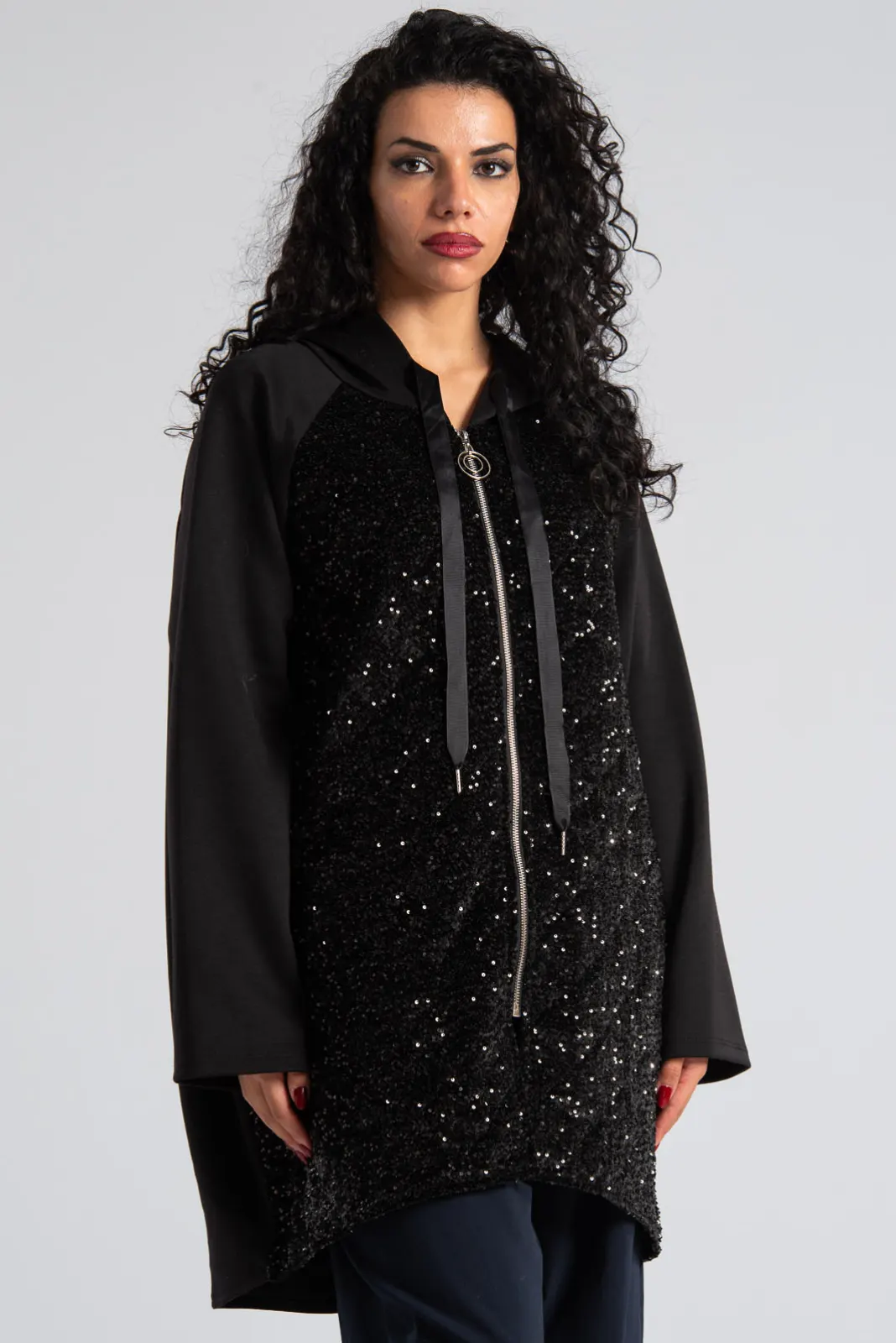Ζακέτα με μακριά μανίκια. Έχει κουκούλα και πλαϊνές τσέπες. Είναι σε ίσια γραμμή και στο μπροστινό μέρος έχει παγιέτες και είναι velvet. Στο πίσω μέρος είναι ελαφρώς πιο μακρυά. Εσωτερικά στο μπροστινό μέρος είναι καπιτονέ. Οι μετρήσεις του πίνακα είναι αντιπροσωπευτικές για κάθε κωδικό. 80% polyester, 15% viscose, 5% elastan.