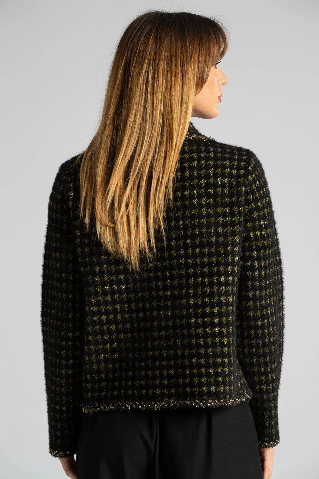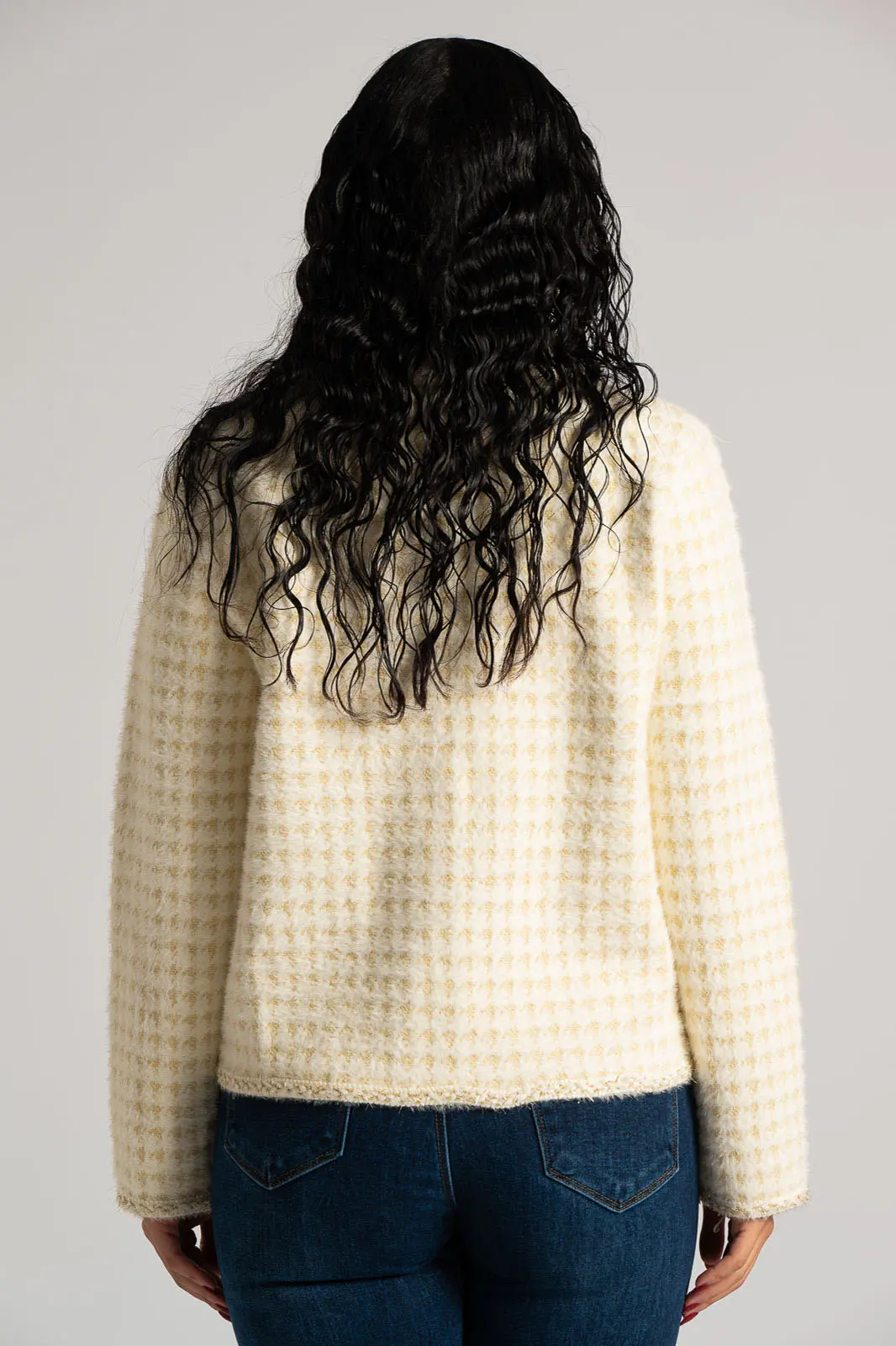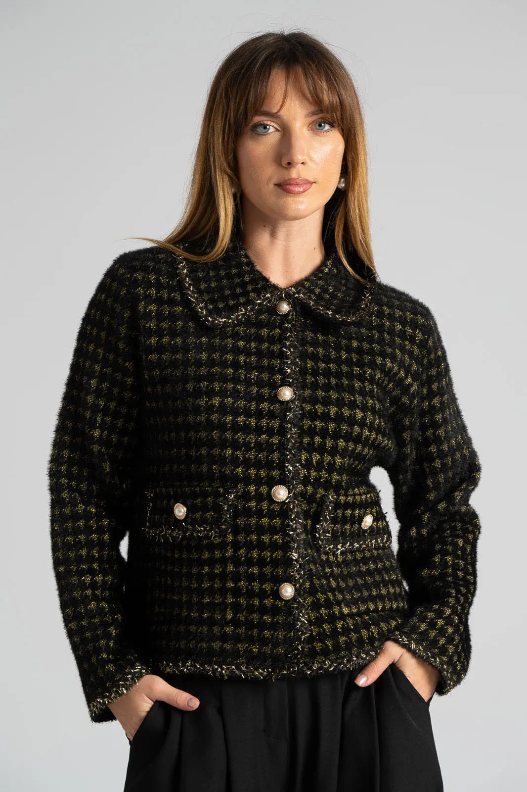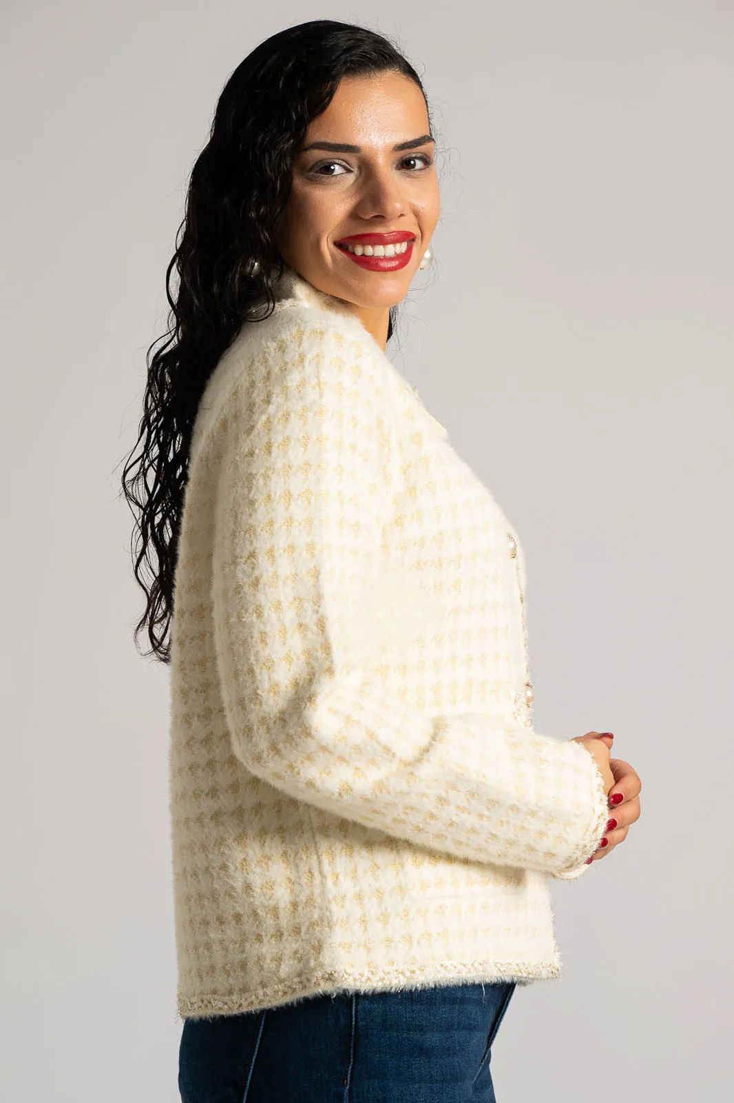 Ζακέτα πλεκτή με γιακά. Σε όλη την επιφάνεια έχει χνουδωτή υφή και διακοσμητική μεταλλιζέ κλωστή. Κλείνει με κουμπιά και στο μπροστινό μέρος έχει τσέπες με καπάκι. Τα κουμπιά είναι με διακοσμημένα με πέρλα. Η μέτρηση έχει γίνει με κλειστά κουμπιά. Οι μετρήσεις του πίνακα είναι αντιπροσωπευτικές για κάθε προϊόν. 65% cotton, 35% polyester.