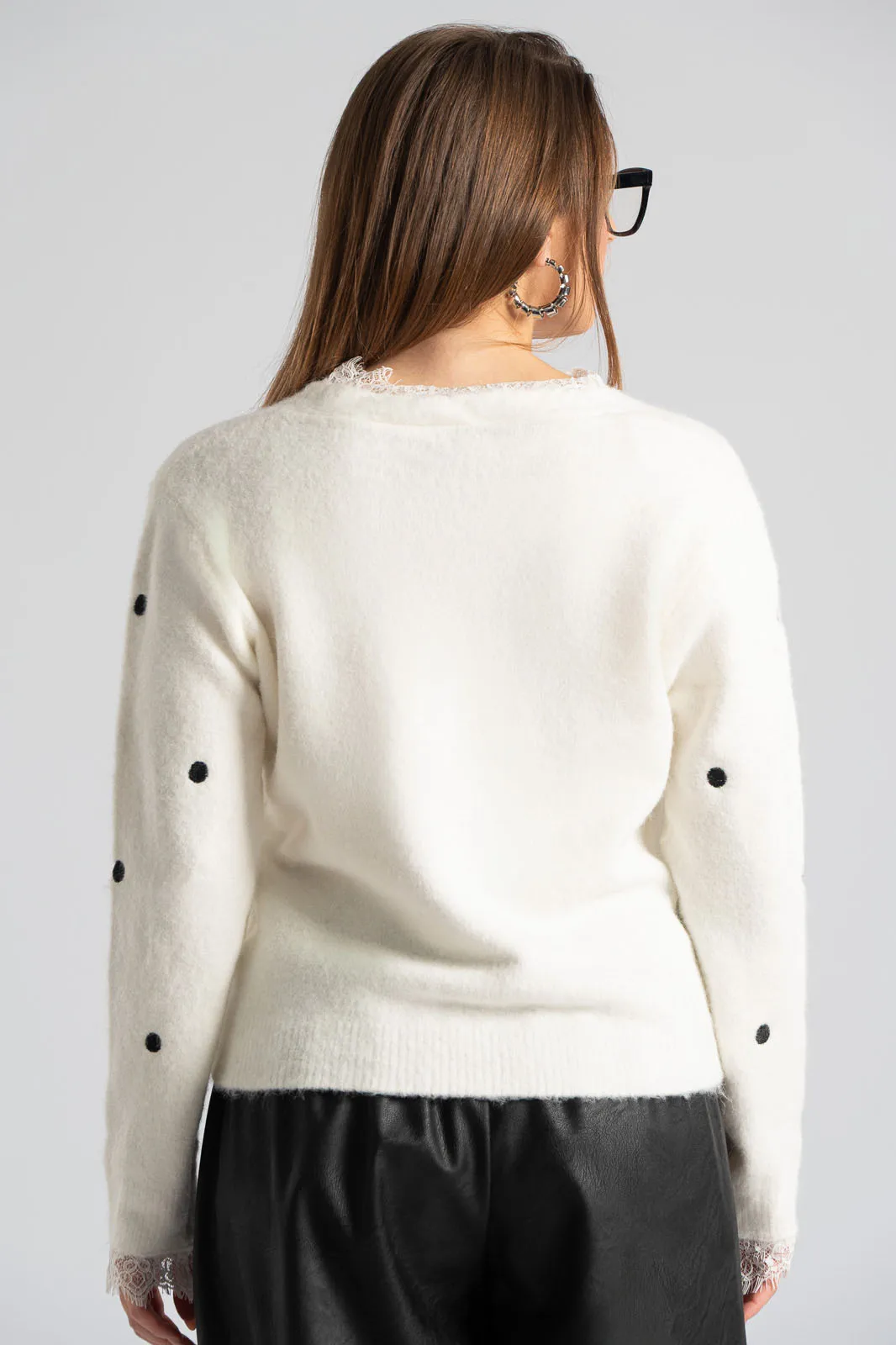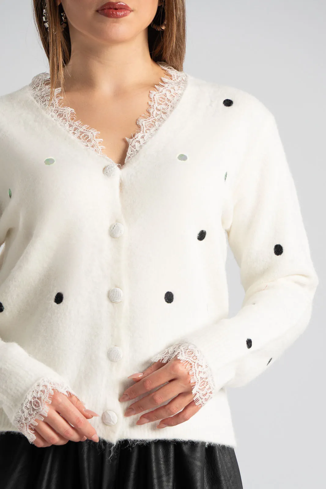 Ζακέτα νημάτινη με συμπαγή πλέξη. Στην μπροστινή πλευρά και στα μανίκια διαθέτει πουά σχέδιο. Έχει V λαιμόκοψη και περιμετρικά διαθέτει δαντέλα. Έχει μακριά μανίκια και στο τελείωμα τους διαθέτουν δαντέλα. Κλείνει στο μπροστινό μέρος με δύο κουμπιά. Η μέτρηση έχει γίνει με κλειστά κουμπιά. Οι μετρήσεις του πίνακα είναι αντιπροσωπευτικές για κάθε προϊόν. 40% polyester, 38% wool, 20% polyamide, 2% spandex.