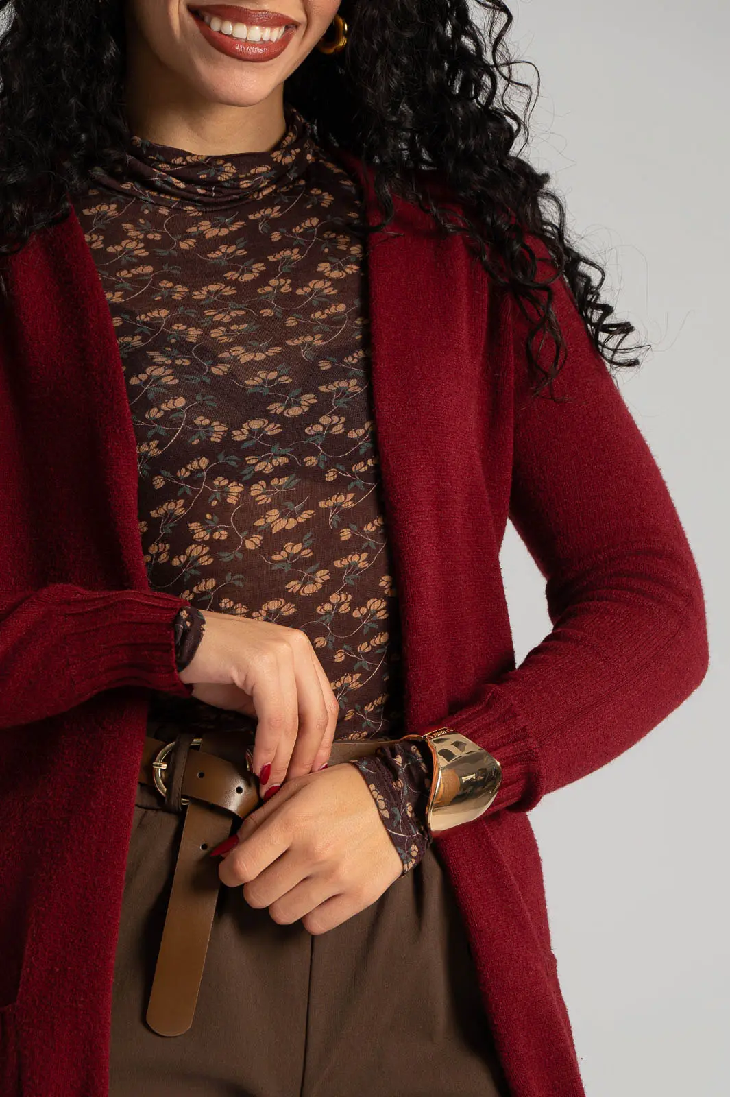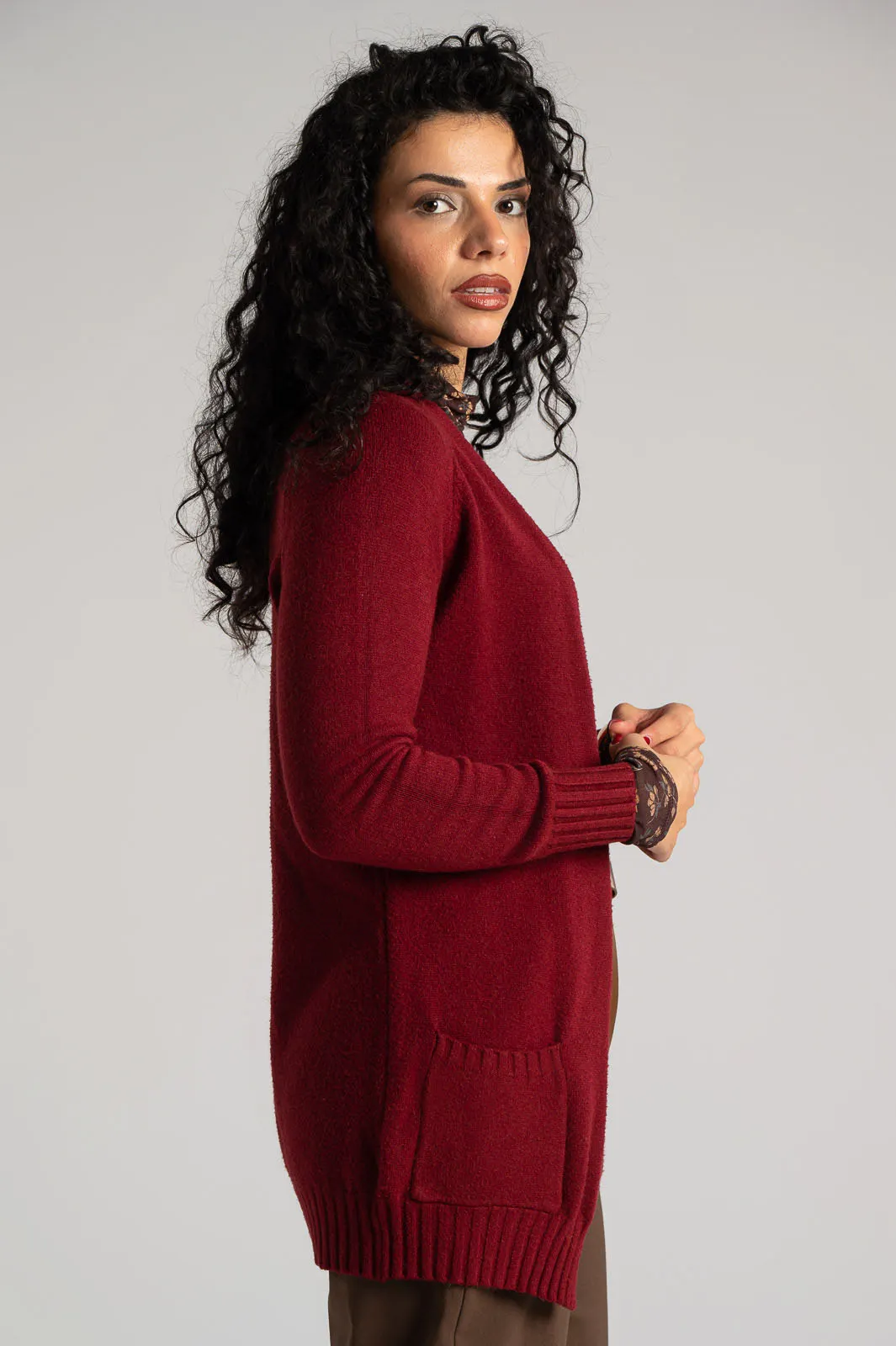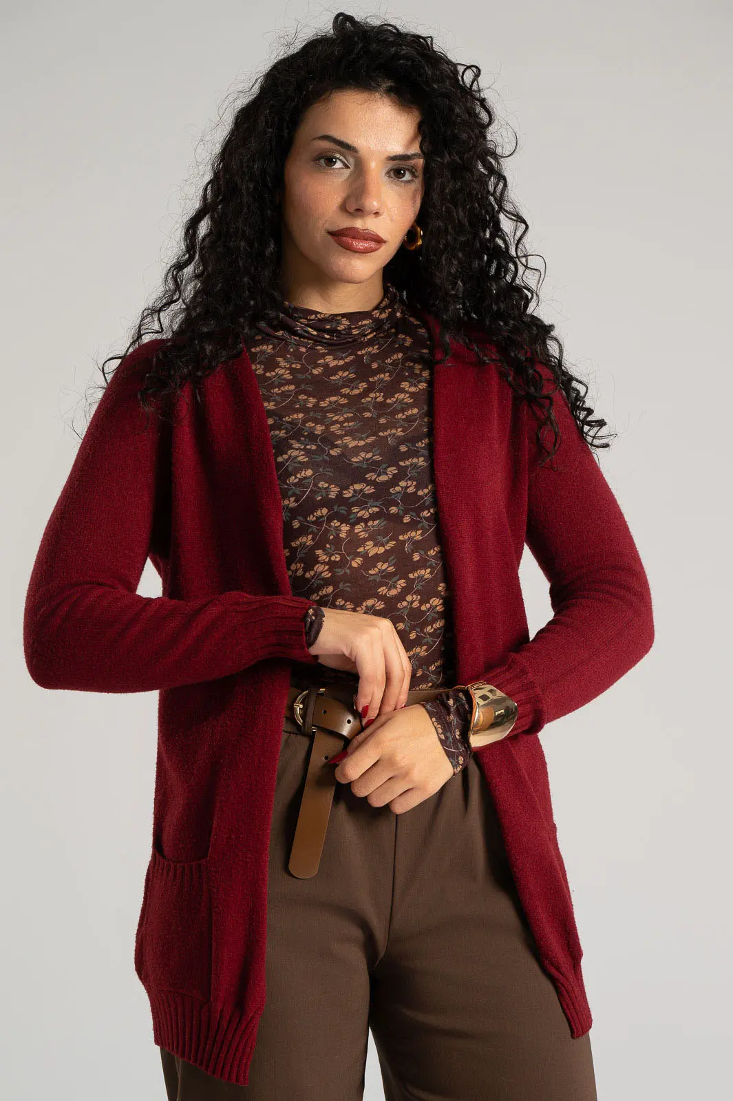 Ζακέτα νημάτινη μονόχρωμη. Διαθέτει 2 τετράγωνες τσέπες χαμηλά. Τα μανίκια και το τελείωμα καταλήγουν σε rib ύφανση. Είναι εξαιρετικά μαλακή. Η μέτρηση έχει γίνει με άνοιγμα μιας παλάμης. Οι μετρήσεις του πίνακα είναι αντιπροσωπευτικές για κάθε κωδικό. 53% viscose, 28% polyester, 19% nylon.