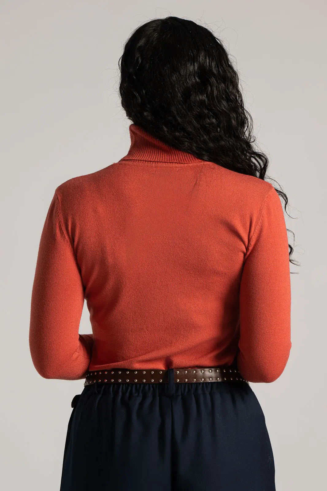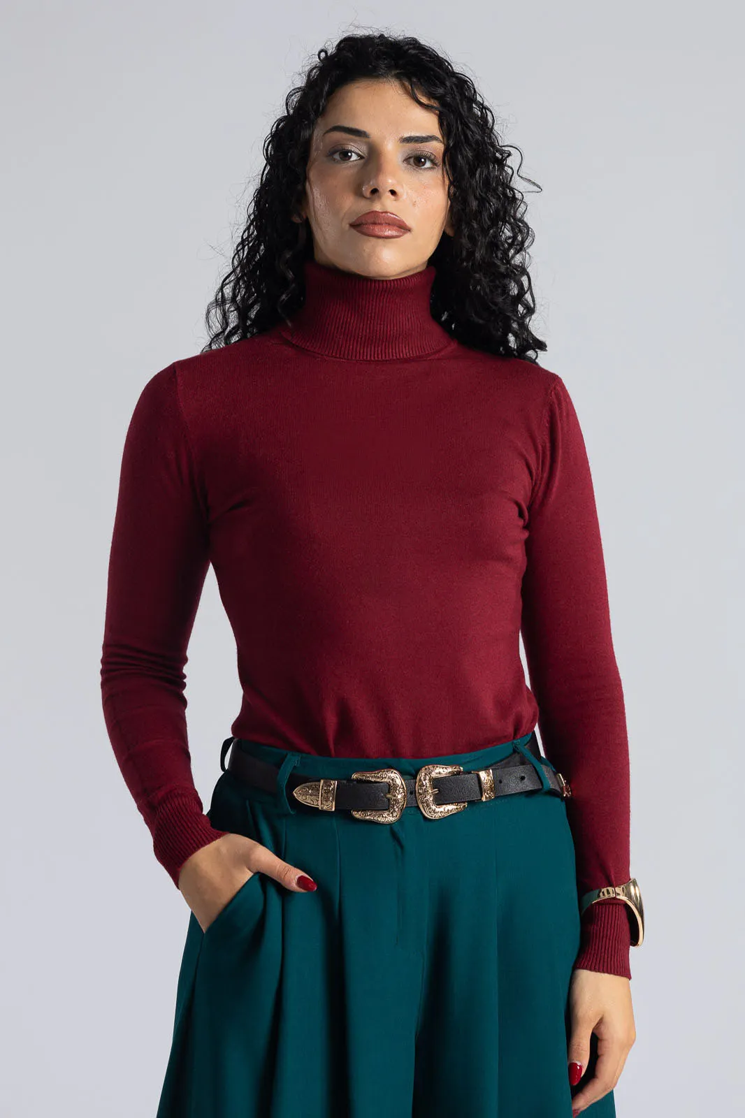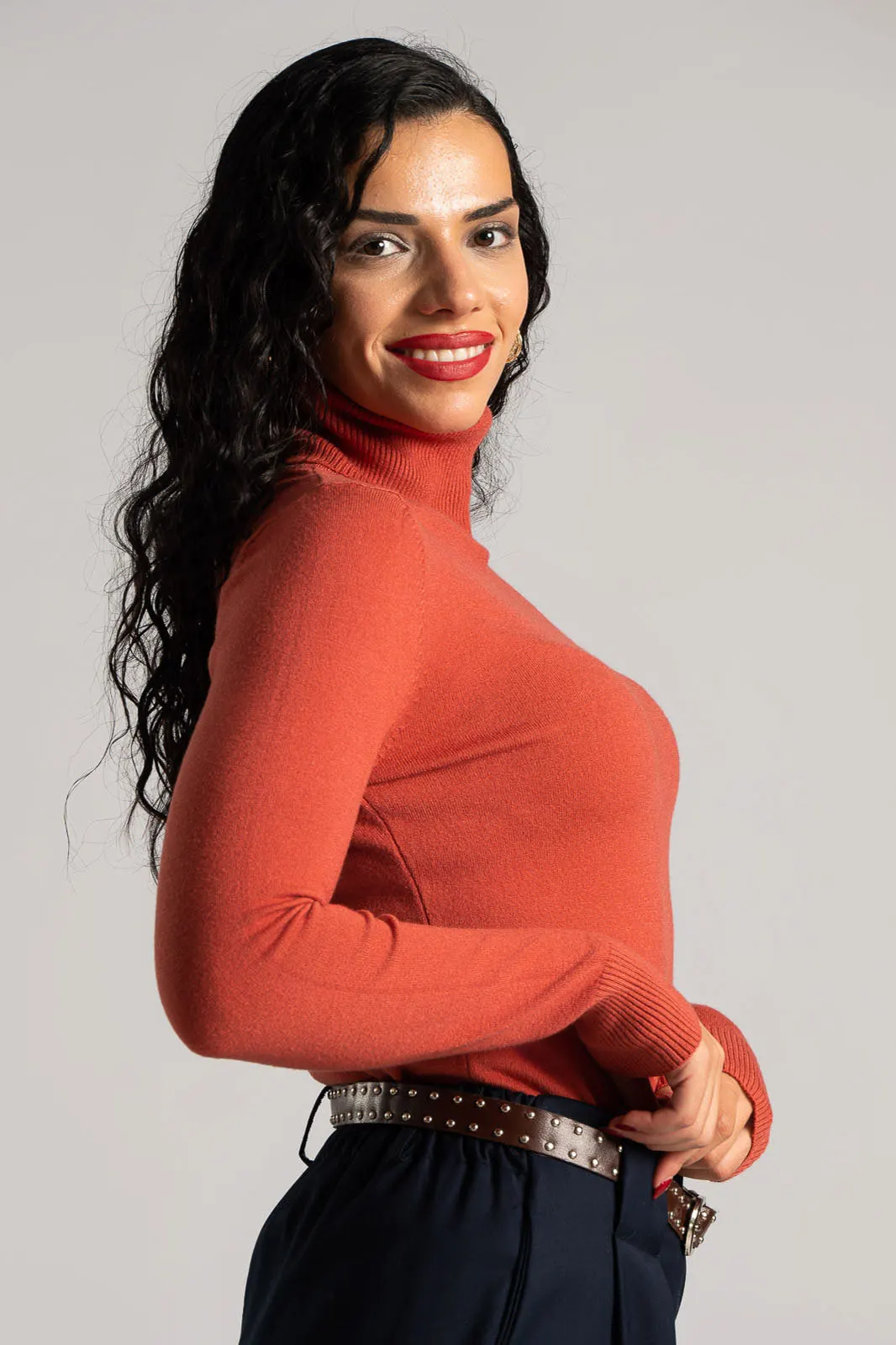 Blouse with a turtleneck collar. It has a straight cut and long sleeves. The hem, turtleneck, and cuffs have a ribbed knit. The fabric is very soft. The measurements in the table are representative of each product. 88% viscose, 12% nylon.