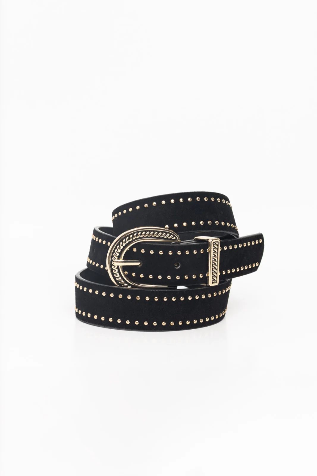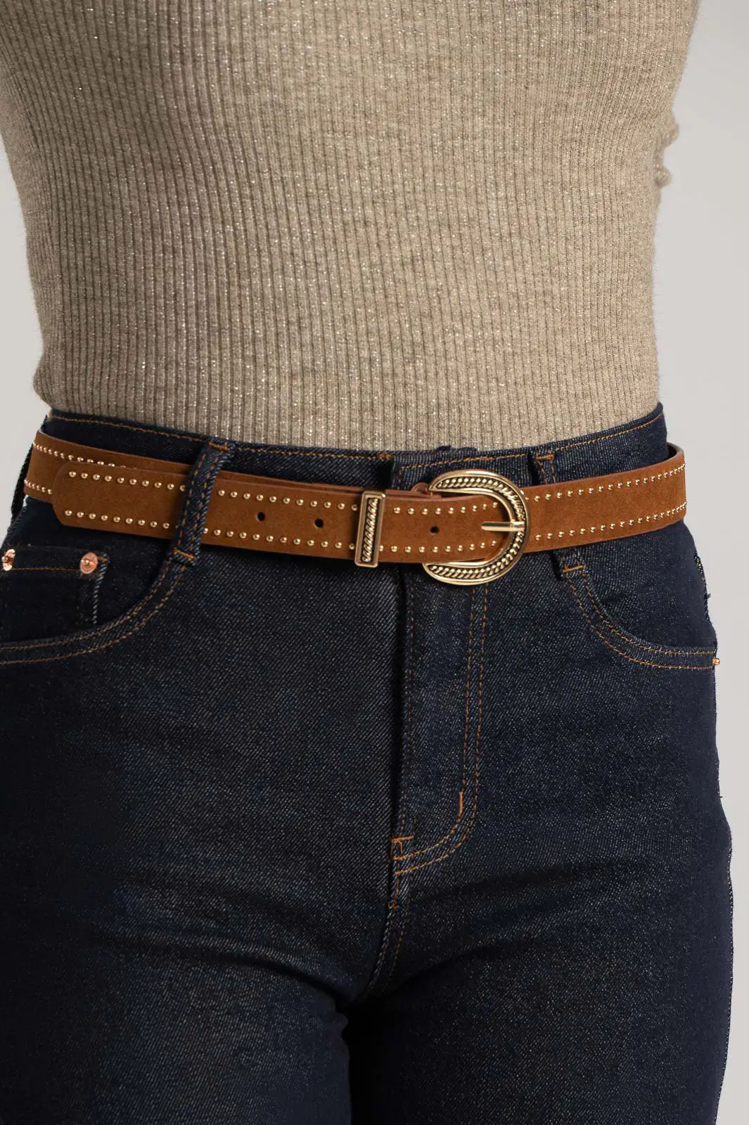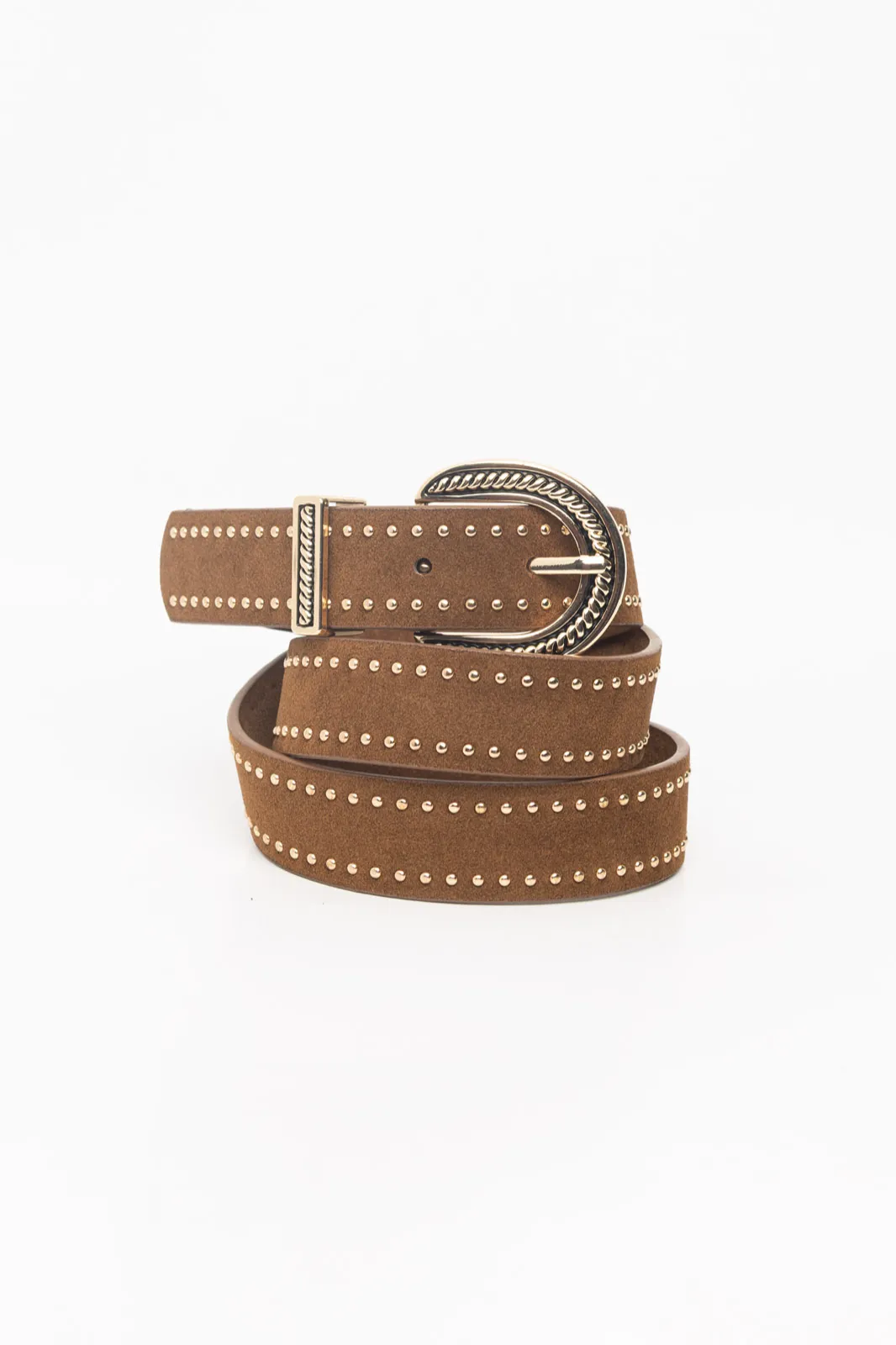 Ζώνη σε σουέτ υφή. Κατά μήκος της έχει 2 σειρές με διακοσμητικά τρουξ. Το πλάτος της είναι 3cm. Ο τοκάς της είναι ελαφρώς πεπαλαιωμένος. Καλύπτει από 81cm έως 91cm.