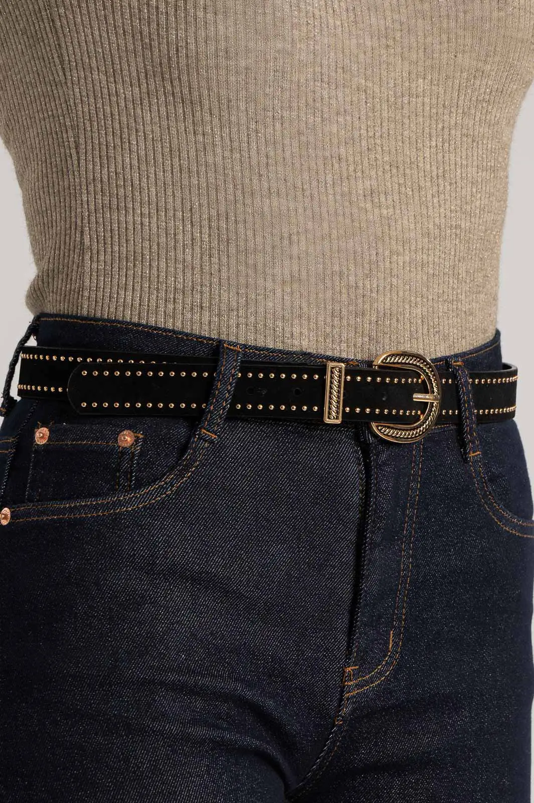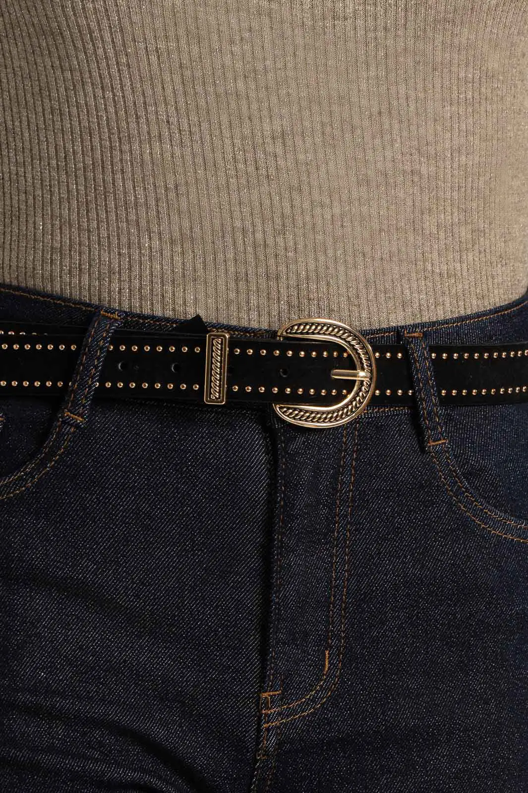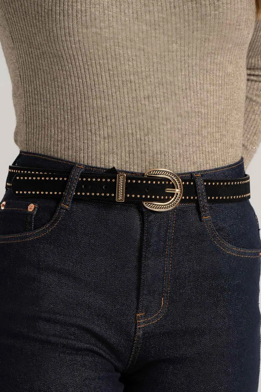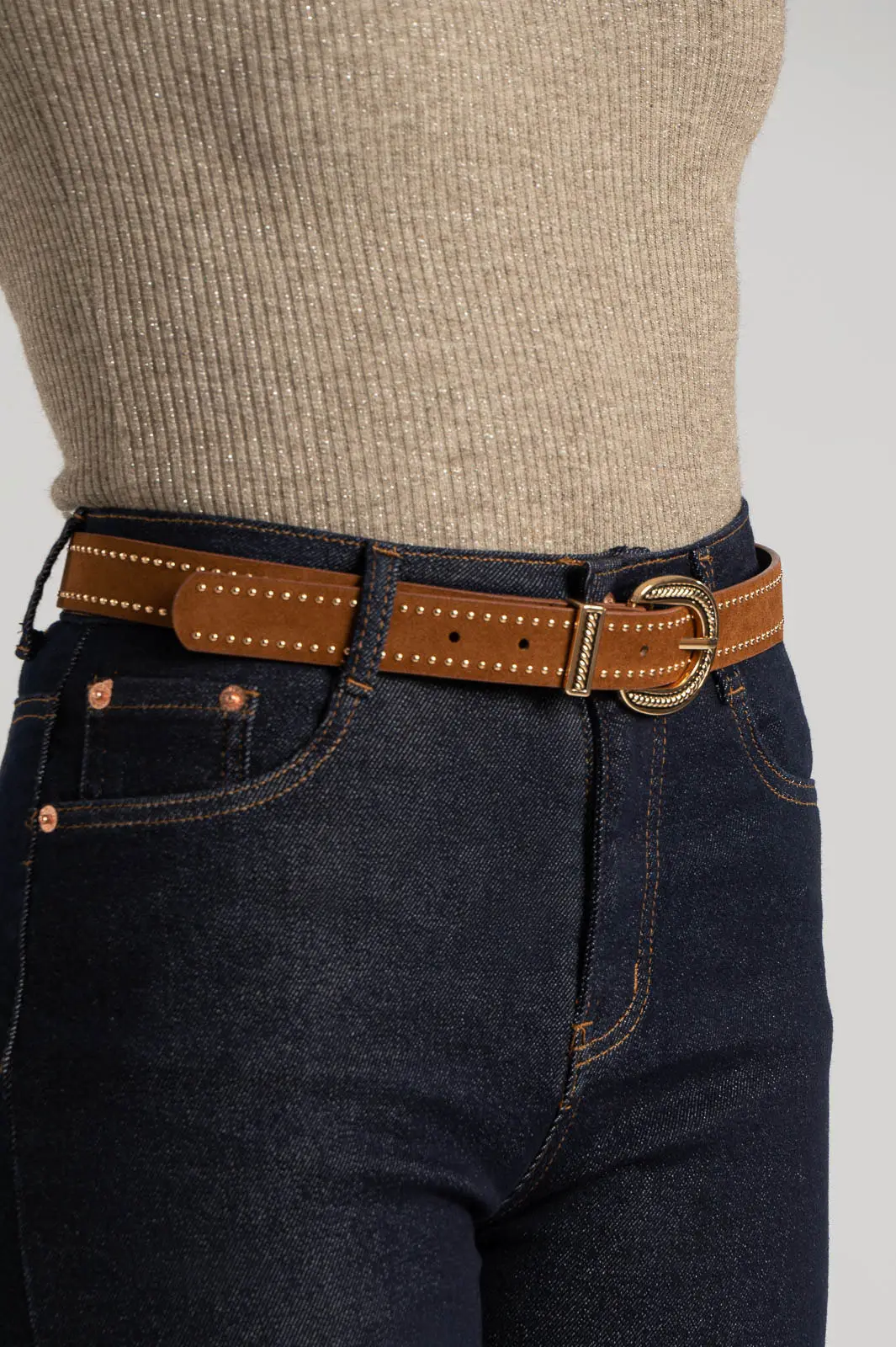 Ζώνη σε σουέτ υφή. Κατά μήκος της έχει 2 σειρές με διακοσμητικά τρουξ. Το πλάτος της είναι 3cm. Ο τοκάς της είναι ελαφρώς πεπαλαιωμένος. Καλύπτει από 81cm έως 91cm.
